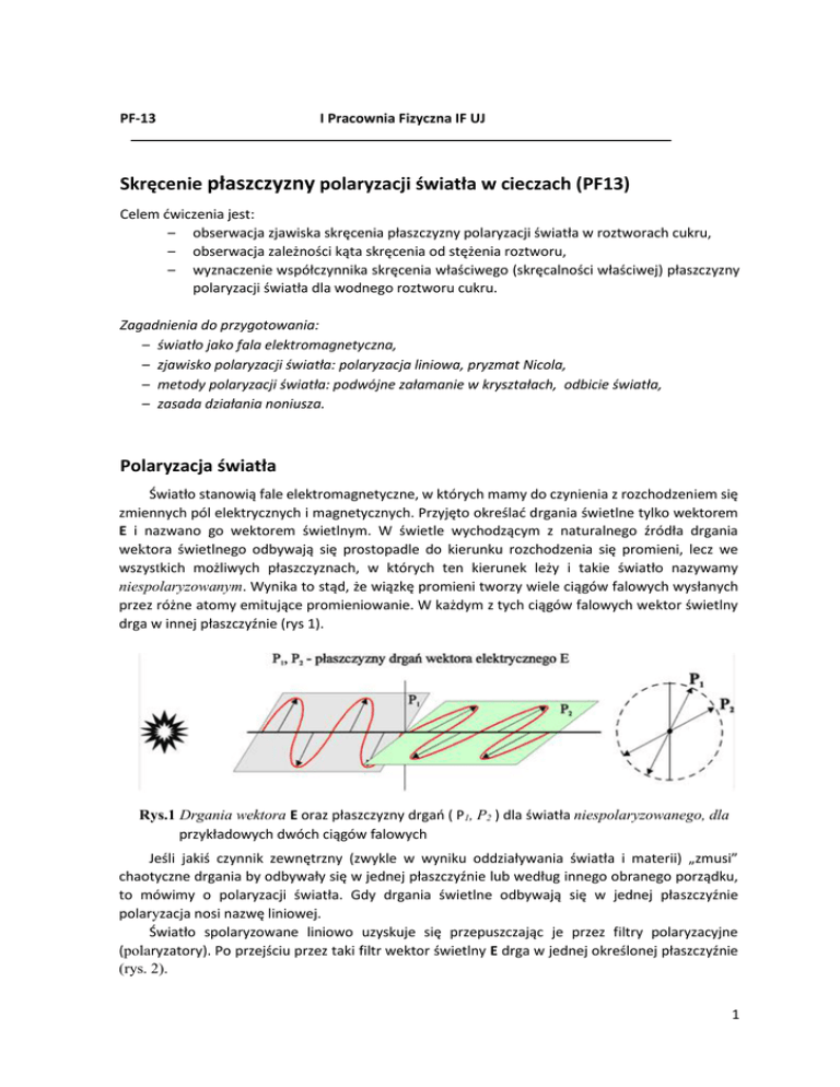 PF-13 I Pracownia Fizyczna IF UJ Skręcenie płaszczyzny polaryzacji światła w cieczach (PF13) Celem ćwiczenia jest: – obserwacja zjawiska skręcenia płaszczyzny polaryzacji światła w roztworach cukru, – obserwacja zależności kąta skręcenia od stężenia roztworu, – wyznaczenie współczynnika skręcenia właściwego (skręcalności właściwej) płaszczyzny polaryzacji światła dla wodnego roztworu cukru. Zagadnienia do przygotowania: – światło jako fala elektromagnetyczna, – zjawisko polaryzacji światła: polaryzacja liniowa, pryzmat Nicola, – metody polaryzacji światła: podwójne załamanie w kryształach, odbicie światła, – zasada działania noniusza. Polaryzacja światła Światło stanowią fale elektromagnetyczne, w których mamy do czynienia z rozchodzeniem się zmiennych pól elektrycznych i magnetycznych. Przyjęto określać drgania świetlne tylko wektorem E i nazwano go wektorem świetlnym. W świetle wychodzącym z naturalnego źródła drgania wektora świetlnego odbywają się prostopadle do kierunku rozchodzenia się promieni, lecz we wszystkich możliwych płaszczyznach, w których ten kierunek leży i takie światło nazywamy niespolaryzowanym. Wynika to stąd, że wiązkę promieni tworzy wiele ciągów falowych wysłanych przez różne atomy emitujące promieniowanie. W każdym z tych ciągów falowych wektor świetlny drga w innej płaszczyźnie (rys 1). Rys.1 Drgania wektora E oraz płaszczyzny drgań ( P1, P2 ) dla światła niespolaryzowanego, dla przykładowych dwóch ciągów falowych Jeśli jakiś czynnik zewnętrzny (zwykle w wyniku oddziaływania światła i materii) „zmusi” chaotyczne drgania by odbywały się w jednej płaszczyźnie lub według innego obranego porządku, to mówimy o polaryzacji światła. Gdy drgania świetlne odbywają się w jednej płaszczyźnie polaryzacja nosi nazwę liniowej. Światło spolaryzowane liniowo uzyskuje się przepuszczając je przez filtry polaryzacyjne (polaryzatory). Po przejściu przez taki filtr wektor świetlny E drga w jednej określonej płaszczyźnie (rys. 2). 1 PF-13 I Pracownia Fizyczna IF UJ Rys.2 Wiązka światła po przejściu przez filtr polaryzacyjny. Pryzmat Nicola (nikol) Pryzmat Nicola to rodzaj polaryzatora liniowego zbudowany jest z dwóch kawałków kryształu dwójłomnego (szpatu islandzkiego) połączonego warstwą balsamu kanadyjskiego. Kryształ dwójłomny powoduje rozszczepienie wiązki światła na dwie: zwyczajną i nadzwyczajną, obie spolaryzowane liniowo w kierunkach wzajemnie prostopadłych. Obecność balsamu kanadyjskiego, o współczynniku załamania mniejszym od szpatu islandzkiego, umożliwia eliminację jednej z wiązek poprzez całkowite wewnętrzne odbicie (kąt padania jest większy od kąta granicznego). Bieg promieni w pryzmacie Nicola ilustruje rysunek 3. Za pryzmatem Nicola światło jest spolaryzowane liniowo. o o 90 o 22 68 (E) balsam kanadyjski (O) Rys.3 Bieg promieni w pryzmacie Nicola. Skręcenie płaszczyzny polaryzacji światła Niektóre ciała posiadają zdolność skręcania płaszczyzny polaryzacji przy przechodzeniu przez nie światła spolaryzowanego liniowo (rys. 4). Nazywamy je ciałami optycznie czynnymi. Należą do nich niektóre ciała stałe (np. kwarc), ciecze, gazy oraz roztwory niektórych substancji, między innymi roztwór cukru. Skręcenie płaszczyzny polaryzacji następuje na skutek asymetrii budowy cząsteczek. W wodnym roztworze cukru za to skręcenie odpowiedzialny jest asymetryczny atom węgla w cząsteczce cukru. 2 PF-13 I Pracownia Fizyczna IF UJ E E Rys.4 Skręcenie płaszczyzny polaryzacji światła w roztworze . Wartość kąta α skręcenia płaszczyzny polaryzacji w warstwie roztworu jest proporcjonalna do grubości tej warstwy l oraz stężenia roztworu c (prawo Biota). Stężenie c powinno być wyrażone jako stosunek masy substancji rozpuszczonej do objętości roztworu. Tylko wtedy kąt skręcenia płaszczyzny polaryzacji α jest liniowo zależny od stężenia w całym zakresie stężeń. α = α0cl Współczynnik proporcjonalności α0 jest współczynnikiem skręcenia właściwego płaszczyzny polaryzacji światła (skręcalnością właściwą). Zależy on od rodzaju roztworu, długości fali światła λ i temperatury t roztworu. Współczynnik skręcenia właściwego α0 wyraża liczbowo wartość kąta skręcenia płaszczyzny polaryzacji dla roztworu o stężeniu jednostkowym (1 kg/m3) i grubości warstwy jednostkowej (1 m). Ma więc wymiar: deg m 2 [ 0 ] kg Polarymetr Laurenta. Rys. 5. Schemat polarymetru Laurenta. L – wbudowana lampa sodowa; P1 – pryzmat Nicola, polaryzator; P2 – pryzmat Nicola, analizator; R – rurka z badaną cieczą; PP – płytka półcieniowa. Do pomiaru kąta skręcenia płaszczyzny polaryzacji służy polarymetr Laurenta, którego schemat przedstawia rysunek 5. Monochromatyczne światło z lampy sodowej L pada na kolimator formujący równoległą wiązkę światła, która po przejściu przez polaryzator P1 jest spolaryzowana 3 PF-13 I Pracownia Fizyczna IF UJ liniowo. Płaszczyzna polaryzacji tej wiązki, po przejściu przez ciecz optycznie czynną w rurce R, ulega skręceniu. Przy pomiarze kąta skręcenia płaszczyzny polaryzacji wykorzystuje się fakt, że oko może z dużą dokładnością stwierdzić różnice oświetlenia poszczególnych części pola widzenia. Zastosowana w przyrządzie płytka półcieniowa PP przesłania częściowo pole widzenia. Płytka wykonana jest z kwarcu skręcającego płaszczyznę polaryzacji, co powoduje, że za płytką płaszczyzny polaryzacji poszczególnych części wiązki światła tworzą ze sobą niewielki kąt β (rysunek 6). W celu wyznaczenia kąta skręcenia płaszczyzny polaryzacji należy w nieobecności cieczy optycznie czynnej ustawić analizator w ten sposób, aby całe pole widzenia (część z płytką półcieniową i bez niej) miało jednakowe oświetlenie. Oznacza to ustawienie analizatora w takiej