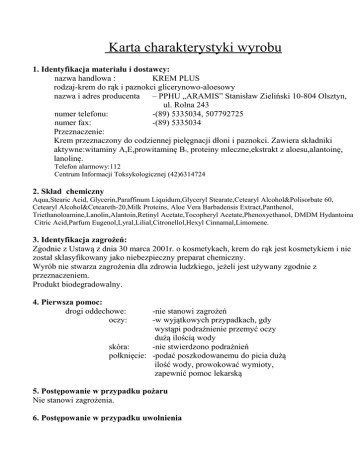 Karta charakterystyki wyrobu 1. Identyfikacja materiału i dostawcy: nazwa handlowa : KREM PLUS rodzaj-krem do rąk i paznokci glicerynowo-aloesowy nazwa i adres producenta – PPHU „ARAMIS” Stanisław Zieliński 10-804 Olsztyn, ul. Rolna 243 numer telefonu: -(89) 5335034, 507792725 numer fax: -(89) 5335034 Przeznaczenie: Krem przeznaczony do codziennej pielęgnacji dłoni i paznokci. Zawiera składniki aktywne:witaminy A,E,prowitaminę B5, proteiny mleczne,ekstrakt z aloesu,alantoinę, lanolinę. Telefon alarmowy:112 Centrum Informacji Toksykologicznej (42)6314724 2. Skład chemiczny Aqua,Stearic Acid, Glycerin,Paraffinum Liquidum,Glyceryl Stearate,Cetearyl Alcohol&Polisorbate 60, Cetearyl Alcohol&Ceteareth-20,Milk Proteins, Aloe Vera Barbadensis Extract,Panthenol, Triethanoloamine,Lanolin,Alantoin,Retinyl Acetate,Tocopheryl Acetate,Phenoxyethanol, DMDM Hydantoina Citric Acid,Parfum Eugenol,Lyral,Lilial,Citronellol,Hexyl Cinnamal,Limomene. 3. Identyfikacja zagrożeń: Zgodnie z Ustawą z dnia 30 marca 2001r. o kosmetykach, krem do rąk jest kosmetykiem i nie został sklasyfikowany jako niebezpieczny preparat chemiczny. Wyrób nie stwarza zagrożenia dla zdrowia ludzkiego, jeżeli jest używany zgodnie z przeznaczeniem. Produkt biodegradowalny. 4. Pierwsza pomoc: drogi oddechowe: oczy: -nie stanowi zagrożeń -w wyjątkowych przypadkach, gdy wystąpi podrażnienie przemyć oczy dużą ilością wody skóra: -nie stwierdzono podrażnień połknięcie: -podać poszkodowanemu do picia dużą ilość wody, prowokować wymioty, zapewnić pomoc lekarską 5. Postępowanie w przypadku pożaru Nie stanowi zagrożenia. 6. Postępowanie w przypadku uwolnienia Spłukać wodą. 7. Przechowywanie Przechowywać w oryginalnych zamkniętych opakowaniach w temperaturze 5-35°C. 8. Kontrola narażenia (środki ochrony osobistej): Wyrób obojętny. Szczególne środki ochrony nie są konieczne. Kontrole sanitarne nie przewidziane. Ochrona rąk,oczu nie wymagane. Ochrona skóry fartuch ochronny. Ochrona techniczna magazynu:zadaszenie i ogrzewanie. 9. Właściwości fizykochemiczne: - jednolita emulsja bez zanieczyszczeń mechanicznych -barwa biała -zapach aloesowy -pH 4,5 -6,5 - badania mikrobiologiczne i dermatologiczne nr 3378/15,nr referencyjny CPNP:2084088 10.Stabilność i reaktywność Stabilność w temperaturze: +40 st. C w ciągu 24 godz. całkowita - 3 st. C w ciągu 24 godz. całkowita 11.Informacje toksykologiczne: Klasa toksyczności nie dotyczy. 12.Informacje ekologiczne: Wyrób biodegradalny. 13.Postępowanie z odpadami Przestrzegać przepisów o obowiązku odzysku i recyklingu odpadów opakowaniowych dotyczących ustawy z dnia 11 maja 2001r. Dz.U. Nr 63, poz 639 14. Informacja o transporcie: Nie stwarza zagrożenia przy transporcie. Transport powinien odbywać się w opakowaniach zbiorczych, chroniących opakowania jednostkowe przed uszkodzeniem. 15. Informacje dotyczące uregulowań prawnych: Klasyfikacja i etykietykowanie:znormalizowane. Rodzj zagrożenia-wskazówki R: nie znajdują zastosowania. Porady ostrzegawcze-wskazówki S: nie znajdują zastosowania. Ustawa o kosmetykach z dnia 30 marca 2001 roku Dz. U. Nr 42, poz. 473 Notyfikacja w Krajowym Systemie Informowania o Kosmetykach Wprowadzonych do Obrotu- Nr w rejestrze RK/249351/2009 Rozporządzenie Parlamentu Europejskiego i Rady (WE) nr 1223/2009 Rejestracja kosmetyku w bazie ECAS,zgłoszenie CPNP nr 2084088 Produkt posiada Raport Bezpieczeństwa Kosmetyku. 16. Inne informacje Powyższe informacje opracowano na podstawie najnowszej wiedzy. Opisują produkt z punktu widzenia wymogów ochrony zdrowia i środowiska naturalnego. nie mogą być przenoszone na produkty podobne i wykorzystane jako dokument prawny. Olsztyn 01.08.2008 Aktualizacja 30.06.2016