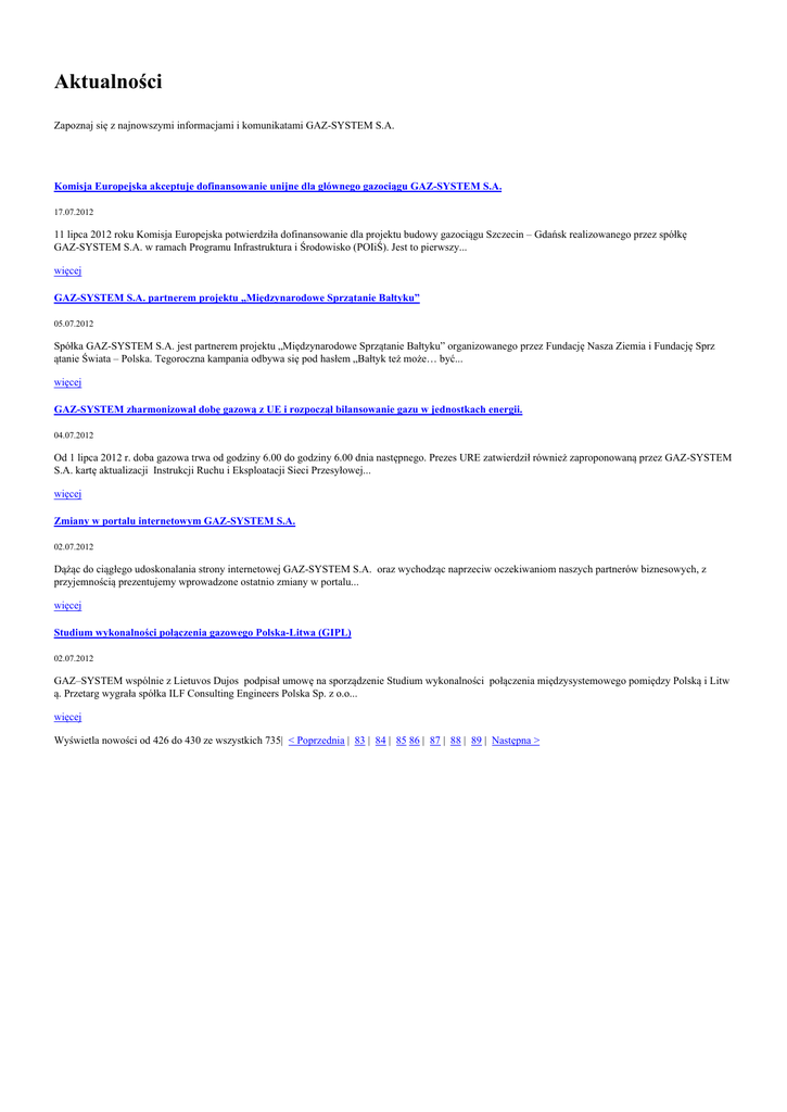 Aktualności Zapoznaj się z najnowszymi informacjami i komunikatami GAZ-SYSTEM S.A. Komisja Europejska akceptuje dofinansowanie unijne dla głównego gazociągu GAZ-SYSTEM S.A. 17.07.2012 11 lipca 2012 roku Komisja Europejska potwierdziła dofinansowanie dla projektu budowy gazociągu Szczecin – Gdańsk realizowanego przez spółkę GAZ-SYSTEM S.A. w ramach Programu Infrastruktura i Środowisko (POIiŚ). Jest to pierwszy... więcej GAZ-SYSTEM S.A. partnerem projektu „Międzynarodowe Sprzątanie Bałtyku” 05.07.2012 Spółka GAZ-SYSTEM S.A. jest partnerem projektu „Międzynarodowe Sprzątanie Bałtyku” organizowanego przez Fundację Nasza Ziemia i Fundację Sprz ątanie Świata – Polska. Tegoroczna kampania odbywa się pod hasłem „Bałtyk też może… być... więcej GAZ-SYSTEM zharmonizował dobę gazową z UE i rozpoczął bilansowanie gazu w jednostkach energii. 04.07.2012 Od 1 lipca 2012 r. doba gazowa trwa od godziny 6.00 do godziny 6.00 dnia następnego. Prezes URE zatwierdził również zaproponowaną przez GAZ-SYSTEM S.A. kartę aktualizacji Instrukcji Ruchu i Eksploatacji Sieci Przesyłowej... więcej Zmiany w portalu internetowym GAZ-SYSTEM S.A. 02.07.2012 Dążąc do ciągłego udoskonalania strony internetowej GAZ-SYSTEM S.A. oraz wychodząc naprzeciw oczekiwaniom naszych partnerów biznesowych, z przyjemnością prezentujemy wprowadzone ostatnio zmiany w portalu... więcej Studium wykonalności połączenia gazowego Polska-Litwa (GIPL) 02.07.2012 GAZ–SYSTEM wspólnie z Lietuvos Dujos podpisał umowę na sporządzenie Studium wykonalności połączenia międzysystemowego pomiędzy Polską i Litw ą. Przetarg wygrała spółka ILF Consulting Engineers Polska Sp. z o.o... więcej Wyświetla nowości od 426 do 430 ze wszystkich 735| < Poprzednia | 83 | 84 | 85 86 | 87 | 88 | 89 | Następna >