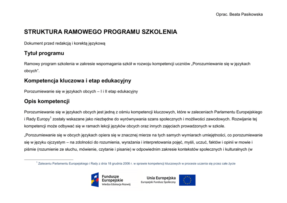 Oprac. Beata Pasikowska STRUKTURA RAMOWEGO PROGRAMU SZKOLENIA Dokument przed redakcją i korektą językową Tytuł programu Ramowy program szkolenia w zakresie wspomagania szkół w rozwoju kompetencji uczniów „Porozumiewanie się w językach obcych”. Kompetencja kluczowa i etap edukacyjny Porozumiewanie się w językach obcych – I i II etap edukacyjny Opis kompetencji Porozumiewanie się w językach obcych jest jedną z ośmiu kompetencji kluczowych, które w zaleceniach Parlamentu Europejskiego i Rady Europy1 zostały wskazane jako niezbędne do wyrównywania szans społecznych i możliwości zawodowych. Rozwijanie tej kompetencji może odbywać się w ramach lekcji języków obcych oraz innych zajęciach prowadzonych w szkole. „Porozumiewanie się w obcych językach opiera się w znacznej mierze na tych samych wymiarach umiejętności, co porozumiewanie się w języku ojczystym – na zdolności do rozumienia, wyrażania i interpretowania pojęć, myśli, uczuć, faktów i opinii w mowie i piśmie (rozumienie ze słuchu, mówienie, czytanie i pisanie) w odpowiednim zakresie kontekstów społecznych i kulturalnych (w 1 Zaleceniu Parlamentu Europejskiego i Rady z dnia 18 grudnia 2006 r. w sprawie kompetencji kluczowych w procesie uczenia się przez całe życie Oprac. Beata Pasikowska edukacji i szkoleniu, pracy, domu i czasie wolnym) w zależności od chęci lub potrzeb danej osoby. Porozumiewanie się w obcych językach wymaga również takich umiejętności, jak mediacja i rozumienie różnic kulturowych. Stopień opanowania języka przez daną osobę może być różny w przypadku czterech kompetencji językowych (rozumienie ze słuchu, mówienie, czytanie i pisanie) i poszczególnych języków oraz zależny od społecznego i kulturowego kontekstu osobistego, otoczenia oraz potrzeb lub zainteresowań danej osoby. Wiedza Kompetencja porozumiewania się w obcych językach wymaga znajomości słownictwa i gramatyki funkcjonalnej oraz świadomości głównych typów interakcji słownej i rejestrów języka. Istotna jest również znajomość konwencji społecznych oraz aspektu kulturowego i zmienności języków. Umiejętności Na niezbędne umiejętności w zakresie komunikacji w językach obcych składa się zdolność rozumienia komunikatów słownych, inicjowania, podtrzymywania i kończenia rozmowy oraz czytania, rozumienia i pisania tekstów, odpowiednio do potrzeb danej osoby. Osoby powinny także być w stanie właściwie korzystać z pomocy oraz uczyć się języków również w nieformalny sposób w ramach uczenia się przez całe życie. Postawy Pozytywna postawa obejmuje świadomość różnorodności kulturowej, a także zainteresowanie i ciekawość języków i komunikacji międzykulturowej.” Oprac. Beata Pasikowska Specyfika kształcenia kompetencji „porozumiewanie się w językach obcych” na I i II etapie edukacyjnym Rozwój dziecka a rozwój kompetencji porozumiewania się w językach obcych Na I i II etapie edukacyjnym kształtowane są u uczniów wszystkie sprawności (mówienie, słuchanie, pisanie, czytanie) służące rozwijaniu kompetencji językowych. W kontekście kształtowania kompetencji językowych najważniejsze jest jednak rozwijanie umiejętności posługiwania się językiem obcym w celach komunikacyjnych. Dzieci w tym wieku są bardziej otwarte na inność, ponieważ nie wykształciły jeszcze w swych umysłach sztywnych ram i schematów, mogących być przeszkodą w rozwoju kompetencji w języku obcym. Pierwsze 10 lat życia jest okresem bardzo efektywnym w nauczaniu języka obcego (plastyczność narządów artykulacyjnych, niezakończony proces lateralizacji mózgu oraz znaczący rozwój kompetencji językowych w języku ojczystym). Na I etapie edukacyjnym poziom czynności umysłowych uczniów jest uzależniony przede wszystkim od konkretnej treści. Staje się oni w coraz większym stopniu zdolne do koncentracji uwagi, spostrzeżeń i obserwacji zjawisk, jednak wciąż kierują swoją uwagę w stronę konkretnych przedmiotów i zjawisk najbliższego otoczenia. W tym okresie rozwijają się podstawowe funkcje sfery intelektualnej, takie jak: analiza i synteza wzrokowa, słuchowa oraz kinestetyczno-ruchowa. Na II etapie edukacji występują wyraźne zmiany w sferze intelektualnej i w osobowości dziecka. Dziecko posługuje się coraz bardziej złożonymi pojęciami, doskonalą się takie umiejętności, jak: porównywanie, klasyfikowanie, abstrahowanie i uogólnianie oraz procesy analizy i syntezy. Uczeń skupia swą uwagę nie tylko na zjawiskach najbliższego otoczenia, lecz również na własnych czynnościach psychicznych i właściwościach osobowości. W tym okresie wzrasta również sprawność posługiwania się językiem ojczystym, który nie jest już Oprac. Beata Pasikowska wyłącznie środkiem komunikacji, ale także przedmiotem analizy i głębszego poznania. 2 Nauka może teraz bazować nie tylko na pamięci mechanicznej, lecz także w coraz większym stopniu na pamięci logicznej. Inaczej mówiąc, dziecko dysponuje znacznie lepszym niż na wcześniejszym etapie edukacyjnym aparatem poznawczym, wykorzystywanym w nauce języka. Jest to również okres, kiedy następuje znaczący społeczny i kognitywny rozwój uczniów. W porównaniu do okresu wczesnoszkolnego dziecko jest w stanie wytrzymać większy wysiłek związany z nauką w szkole, lepiej rozumieć swoje emocje i emocje innych oraz wyrażać je na różne sposoby, rośnie również zdolność do współpracy i zrozumienia innych ludzi. Biorąc po uwagę różne czynniki psychopedagogiczne (poznawcze, afektywne i językowe) uczeń szkoły podstawowej posiada doskonałe predyspozycje do nauki języków obcych. Charakteryzuje go naturalna ciekawość świata, brak barier językowych i traktowanie języka obcego w sposób holistyczny (jeden z kanałów komunikacyjnych). Kompetencje porozumiewanie się w językach obcych w zapisach podstawy programowej3 Specyfikę ksz