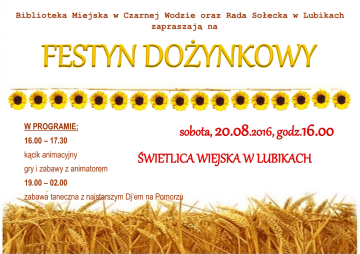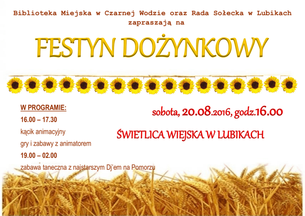 Biblioteka Miejska w Czarnej Wodzie oraz Rada Sołecka w Lubikach zapraszają na FESTYN DOŻYNKOWY W PROGRAMIE: 16.00 – 17.30 kącik animacyjny gry i zabawy z animatorem sobota, 20.08.2016, godz.16.00 ŚWIETLICA WIEJSKA W LUBIKACH 19.00 – 02.00 zabawa taneczna z najstarszym Dj’em na Pomorzu