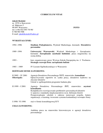 CURRICULUM VITAE Jakub Iksi ski ur. 1970 w Karczewie ul. Makowa 5 09-897 Warszawa tel: (+48) 022 893 78 90/ 0 780 903 908 E-mail: [email protected] FOTO WYKSZTAŁCENIE: 1994 -1996 Studium Podyplomowe, Wydział Marketingu, kierunek: Doradztwo personalne 1989 -1994 Uniwersytet Warszawski, Wydział Marketingu i Zarz dzania; kierunek: Zarz dzanie zasobami ludzkimi; praca magisterska na ocen dobr 1993 - kurs organizowany przez Wy sz Szkoł Europejsk im. J. TischneraStrategie rozwoju firm: zarz dzanie lud mi 1985 – 1989 IV Liceum Ogólnokształc ce w Warszawie DO WIADCZENIE ZAWODOWE: II 2005 – IV 2001 Obowi zki: Agencja Doradztwa Personalnego YUT, stanowisko: konsultant Opracowywanie raportów nt. rynku pracy, doradztwo kadrowe na zlecenie klientów Udział w ogólnopolskim programie badania płac II 1999 – I 2001 Agencja Doradztwa Personalnego IYT, stanowisko: asystent konsultanta Kompleksowe rozwi zywanie problemów personalnych klientów w oparciu o standardy mi dzynarodowe m.in. Infoteam Zurich Przeprowadzanie szkole z zakresu motywacji zespołu, kutury organizacji, e-learning, tworzenie systemu komunikacji wewn trz firmy I 1998- VI 1998 sta w firmie konsultingowej IUY CELE ZAWODOWE: Ambitna praca na stanowisku kierowniczym w agencji doradztwa personalnego OBSŁUGA KOMPUTERA: Biegła znajomo MS Office, Windows, Excel, PowerPoint Wykorzystywanie systemów informatycznych w zarz dzaniu zasobami ludzkimi J ZYKI: J zyk angielski J zyk francuski - poziom dobry w mowie i pi mie (uko czony dwusemestralny kurs Business English) poziom bardzo dobry w mowie i pi mie (zdany egzamin…) DODATKOWE UMIEJ TNO CI: Prawo jazdy - kat. B Bezwzrokowe pisanie na komputerze Prowadzenie szkole w atrakcyjny sposób (potwierdzone referencjami firm KIY, KYT) Wyra am zgod na przetwarzanie danych osobowych zawartych w ofercie pracy dla potrzeb realizacji procesu rekrutacji (zgodnie z ustaw z dnia 29.08.1997 r. o ochronie danych osobowych Dz. U. nr 133, poz. 883)