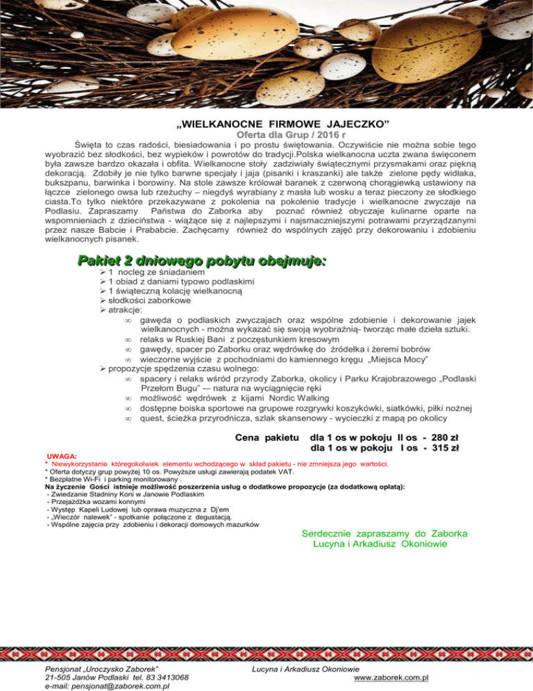 „WIELKANOCNE FIRMOWE JAJECZKO” Oferta dla Grup / 2016 r Święta to czas radości, biesiadowania i po prostu świętowania. Oczywiście nie można sobie tego wyobrazić bez słodkości, bez wypieków i powrotów do tradycji.Polska wielkanocna uczta zwana święconem była zawsze bardzo okazała i obfita. Wielkanocne stoły zadziwiały świątecznymi przysmakami oraz piękną dekoracją. Zdobiły je nie tylko barwne specjały i jaja (pisanki i kraszanki) ale także zielone pędy widłaka, bukszpanu, barwinka i borowiny. Na stole zawsze królował baranek z czerwoną chorągiewką ustawiony na łączce zielonego owsa lub rzeżuchy – niegdyś wyrabiany z masła lub wosku a teraz pieczony ze słodkiego ciasta.To tylko niektóre przekazywane z pokolenia na pokolenie tradycje i wielkanocne zwyczaje na Podlasiu. Zapraszamy Państwa do Zaborka aby poznać również obyczaje kulinarne oparte na wspomnieniach z dzieciństwa - wiążące się z najlepszymi i najsmaczniejszymi potrawami przyrządzanymi przez nasze Babcie i Prababcie. Zachęcamy również do wspólnych zajęć przy dekorowaniu i zdobieniu wielkanocnych pisanek. P Paakkiieett 22 ddnniioow weeggoo ppoobbyyttuu oobbeejjm muujjee:: 1 nocleg ze śniadaniem 1 obiad z daniami typowo podlaskimi 1 świąteczną kolację wielkanocną słodkości zaborkowe atrakcje: • gawęda o podlaskich zwyczajach oraz wspólne zdobienie i dekorowanie jajek wielkanocnych - można wykazać się swoją wyobraźnią- tworząc małe dzieła sztuki. • relaks w Ruskiej Bani z poczęstunkiem kresowym • gawędy, spacer po Zaborku oraz wędrówkę do źródełka i żeremi bobrów • wieczorne wyjście z pochodniami do kamiennego kręgu „Miejsca Mocy” propozycje spędzenia czasu wolnego: • spacery i relaks wśród przyrody Zaborka, okolicy i Parku Krajobrazowego „Podlaski Przełom Bugu” -– natura na wyciągnięcie ręki • możliwość wędrówek z kijami Nordic Walking • dostępne boiska sportowe na grupowe rozgrywki koszykówki, siatkówki, piłki nożnej • quest, ścieżka przyrodnicza, szlak skansenowy - wycieczki z mapą po okolicy Cena pakietu dla 1 os w pokoju II os - 280 zł dla 1 os w pokoju I os - 315 zł UWAGA: * Niewykorzystanie któregokolwiek elementu wchodzącego w skład pakietu - nie zmniejsza jego wartości. * Oferta dotyczy grup powyżej 10 os. Powyższe usługi zawierają podatek VAT. * Bezpłatne Wi-Fi i parking monitorowany . Na życzenie Gości istnieje możliwość poszerzenia usług o dodatkowe propozycje (za dodatkową opłatą): - Zwiedzanie Stadniny Koni w Janowie Podlaskim - Przejażdżka wozami konnymi - Występ Kapeli Ludowej lub oprawa muzyczna z Dj’em - „Wieczór nalewek” - spotkanie połączone z degustacją. - Wspólne zajęcia przy zdobieniu i dekoracji domowych mazurków Serdecznie zapraszamy do Zaborka Lucyna i Arkadiusz Okoniowie Pensjonat „Uroczysko Zaborek” 21-505 Janów Podlaski tel. 83 3413068 e-mail: [email protected] Lucyna i Arkadiusz Okoniowie www.zaborek.com.pl