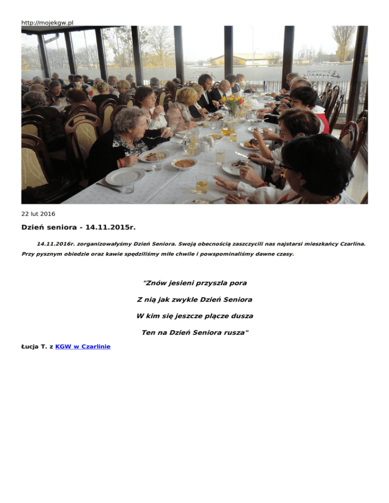 http://mojekgw.pl 22 lut 2016 Dzień seniora - 14.11.2015r. 14.11.2016r. zorganizowałyśmy Dzień Seniora. Swoją obecnością zaszczycili nas najstarsi mieszkańcy Czarlina. Przy pysznym obiedzie oraz kawie spędziliśmy miłe chwile i powspominaliśmy dawne czasy. "Znów jesieni przyszla pora Z nią jak zwykle Dzień Seniora W kim się jeszcze plącze dusza Ten na Dzień Seniora rusza" Łucja T. z KGW w Czarlinie