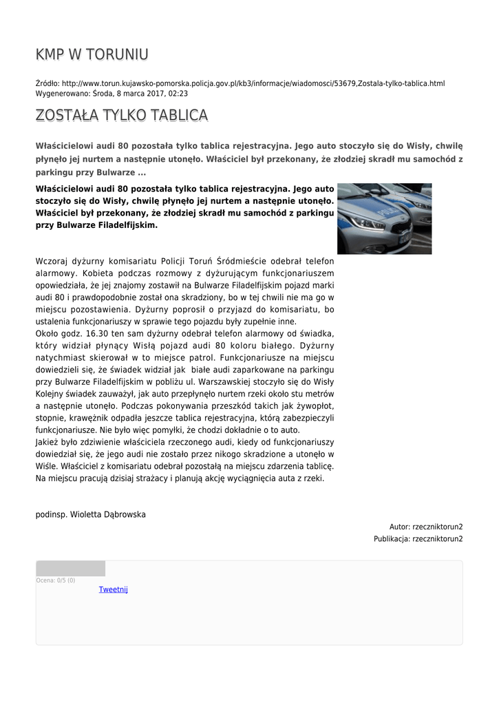 KMP W TORUNIU Źródło: http://www.torun.kujawsko-pomorska.policja.gov.pl/kb3/informacje/wiadomosci/53679,Zostala-tylko-tablica.html Wygenerowano: Środa, 8 marca 2017, 02:23 ZOSTAŁA TYLKO TABLICA Właścicielowi audi 80 pozostała tylko tablica rejestracyjna. Jego auto stoczyło się do Wisły, chwilę płynęło jej nurtem a następnie utonęło. Właściciel był przekonany, że złodziej skradł mu samochód z parkingu przy Bulwarze ... Właścicielowi audi 80 pozostała tylko tablica rejestracyjna. Jego auto stoczyło się do Wisły, chwilę płynęło jej nurtem a następnie utonęło. Właściciel był przekonany, że złodziej skradł mu samochód z parkingu przy Bulwarze Filadelfijskim. Wczoraj dyżurny komisariatu Policji Toruń Śródmieście odebrał telefon alarmowy. Kobieta podczas rozmowy z dyżurującym funkcjonariuszem opowiedziała, że jej znajomy zostawił na Bulwarze Filadelfijskim pojazd marki audi 80 i prawdopodobnie został ona skradziony, bo w tej chwili nie ma go w miejscu pozostawienia. Dyżurny poprosił o przyjazd do komisariatu, bo ustalenia funkcjonariuszy w sprawie tego pojazdu były zupełnie inne. Około godz. 16.30 ten sam dyżurny odebrał telefon alarmowy od świadka, który widział płynący Wisłą pojazd audi 80 koloru białego. Dyżurny natychmiast skierował w to miejsce patrol. Funkcjonariusze na miejscu dowiedzieli się, że świadek widział jak białe audi zaparkowane na parkingu przy Bulwarze Filadelfijskim w pobliżu ul. Warszawskiej stoczyło się do Wisły Kolejny świadek zauważył, jak auto przepłynęło nurtem rzeki około stu metrów a następnie utonęło. Podczas pokonywania przeszkód takich jak żywopłot, stopnie, krawężnik odpadła jeszcze tablica rejestracyjna, którą zabezpieczyli funkcjonariusze. Nie było więc pomyłki, że chodzi dokładnie o to auto. Jakież było zdziwienie właściciela rzeczonego audi, kiedy od funkcjonariuszy dowiedział się, że jego audi nie zostało przez nikogo skradzione a utonęło w Wiśle. Właściciel z komisariatu odebrał pozostałą na miejscu zdarzenia tablicę. Na miejscu pracują dzisiaj strażacy i planują akcję wyciągnięcia auta z rzeki. podinsp. Wioletta Dąbrowska Autor: rzeczniktorun2 Publikacja: rzeczniktorun2 Ocena: 0/5 (0) Tweetnij
