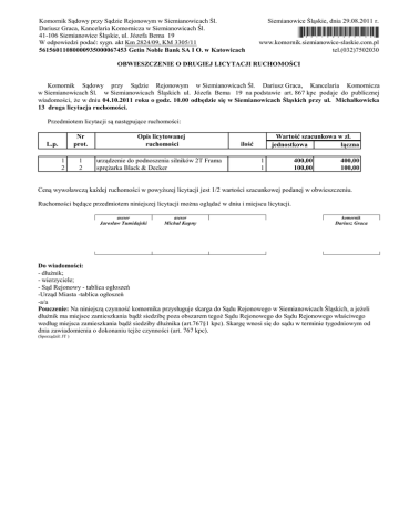 Komornik Sądowy przy Sądzie Rejonowym w Siemianowicach Śl. Dariusz Graca, Kancelaria Komornicza w Siemianowicach Śl. 41-106 Siemianowice Śląskie, ul. Józefa Bema 19 W odpowiedzi podać: sygn. akt Km 2824/09, KM 3305/11 56156011080000935000067453 Getin Noble Bank SA I O. w Katowicach Siemianowice Śląskie, dnia 29.08.2011 r. *8011082900134* www.komornik.siemianowice-slaskie.com.pl tel.(032)7502030 OBWIESZCZENIE O DRUGIEJ LICYTACJI RUCHOMOŚCI Komornik Sądowy przy Sądzie Rejonowym w Siemianowicach Śl. Dariusz Graca, Kancelaria Komornicza w Siemianowicach Śl. w Siemianowicach Śląskich ul. Józefa Bema 19 na podstawie art. 867 kpc podaje do publicznej wiadomości, że w dniu 04.10.2011 roku o godz. 10.00 odbędzie się w Siemianowicach Śląskich przy ul. Michałkowicka 13 druga licytacja ruchomości. Przedmiotem licytacji są następujące ruchomości: Nr prot. L.p. 1 2 1 2 Opis licytowanej ruchomości urządzenie do podnoszenia silników 2T Frama sprężarka Black & Decker Wartość szacunkowa w zł. jednostkowa łączna ilość 1 1 400,00 100,00 400,00 100,00 Ceną wywoławczą każdej ruchomości w powyższej licytacji jest 1/2 wartości szacunkowej podanej w obwieszczeniu. Ruchomości będące przedmiotem niniejszej licytacji można oglądać w dniu i miejscu licytacji. asesor asesor komornik Jarosław Tumidajski Michał Kupny Dariusz Graca Do wiadomości: - dłużnik; - wierzyciele; - Sąd Rejonowy - tablica ogłoszeń -Urząd Miasta -tablica ogłoszeń -a/a Pouczenie: Na niniejszą czynność komornika przysługuje skarga do Sądu Rejonowego w Siemianowicach Śląskich, a jeżeli dłużnik ma miejsce zamieszkania bądź siedzibę poza obszarem tegoż Sądu Rejonowego do Sądu Rejonowego właściwego według miejsca zamieszkania bądź siedziby dłużnika (art.767§1 kpc). Skargę wnosi się do sądu w terminie tygodniowym od dnia zawiadomienia o dokonaniu tejże czynności (art. 767 kpc). (Sporządził: JT )