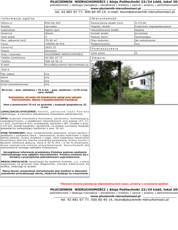 PŁUCIENNIK NIERUCHOMOŚCI | Aleja Politechniki 22/24 Łódź, lokal 201 pośrednictwo | obsługa transakcji | doradztwo | kredyty | opinie | analizy | administrowani _______________ www.pluciennik-nieruchomosci.pl _______________ tel. 42 681 67 77, 500 60 40 14, e-mail: [email protected] Informacje ogólne Nieruchomość Oferta nr PIH-DS-403 Powierzchnia działki [m2] 1179.00 Rodzaj sprzedaż Zagosp. działki częściowo zagospodarowana Lokalizacja Zgierz (gw) Ukształtowanie działki płaska Dzielnica Słowik Kształt działki prostokąt Ilość pokoi 3 Rodzaj domu wolnostojący Pow. całkowita [m2] 75.00 m² Stan budynku do wykończenia Cena 199000.00 PLN Podpiwniczenie nie Cena/m2 2653.33 Status aktualna Imię i nazwisko PŁUCIENNIK NIERUCHOMOŚCI Telefon komórkowy 42 681 67 77 Telefon 500 60 40 14 E-mail [email protected] Pomieszczenia Ilość pokoi 3 Zdjęcia Opis Plac zabaw nie Alarm nie Winda nie Drzwi antywłamaniowe nie 90 m.kw. - pow. zabudowy | 75 m.kw. - pow. użytkowa | 1179 m.kw. - pow. działki Zapraszamy, od wielu lat świadczymy usługi przy zakupie nieruchomości, dbamy o bezpieczeństwo transakcji. Dom o powierzchni 75 m2 na sprzedaż | budynek gospodarczy 32 m.kw. LOKALIZACJA/OTOCZENIE: S ł o w i k , p ó ł n o c n a c z ę ś ć P o w i a t u Zgierskiego, w otoczeniu zabudowania mieszkalne jednorodzinne. OPIS: b u d y n e k m i e s z k a l n y m u r o w a n y , p a r t e r o w y , w o l n o s t o j ą c y, niepodpiwniczony, z poddaszem nieużytkowym, trzy pokoje (27, 11, 11 m2), kuchnia(14 m2), przedpokój, łazienka z WC. Działka o pow. 1179 m2, kształt kwadratu, ogrodzona, na działce murowany budynek gospodarczy wolnostojący parterowy o pow. 32 m2. STAN TECHNICZNY: ławy fundamentowe betonowe, ściany parteru i poddasza z pustaków żwiro - betonowych, ściany kominowe z cegły pełnej palonej, ściany działowe z cegły, dach kopertowy konstrukcji drewnianej pokryty blachą szwedzką powlekaną, ściany kuchni i łazienki wyłożone glazurą. okna w 50 % PCV i w 50 % drewniane, drzwi zewnętrzne szklone antywłamaniowe. Nieruchomość dla zamieszkania wymaga nakładów finansowych. Szczegółowe informacje przekażemy Państwu podczas spotkania informacyjnego oraz oględzin nieruchomości. Prosimy umawiać się z doradcą z przynajmniej jednodniowym wyprzedzeniem. MEDIA/INSTALACJE: kanalizacja do osadnika ścieków, c.o. z pieca węglowego na groszek typu Stąporków, energia elektryczna na działce, wodociąg na działce. Mamy klucze, prezentacja nieruchomości jest możliwa w obecności pośrednika prowadzącego ofertę, właściciel dziękuje za zrozumienie. Klientom chcemy poświęcać odpowiednią ilość czasu, prosimy o umawianie spotkań. PŁUCIENNIK NIERUCHOMOŚCI | Aleja Politechniki 22/24 Łódź, lokal 201 pośrednictwo | obsługa transakcji | doradztwo | kredyty | opinie | analizy | administrowani _______________ www.pluciennik-nieruchomosci.pl _______________ tel. 42 681 67 77, 500 60 40 14, [email protected]