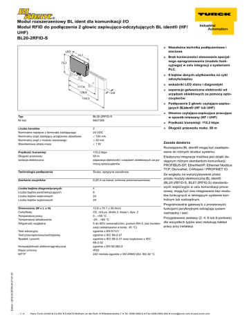 Moduł rozszerzeniowy BL ident dla komunikacji I/O Moduł RFID do podłączenia 2 głowic zapisująco-odczytujących BL ident® (HF/ UHF) BL20-2RFID-S ■ Niezależna technika podłączeniowa i sieciowa ■ Brak konieczności stosowania specjalnego oprogramowania (modułu funkcyjnego) w celu integracji z systemami PLC. ■ 8 bajtów danych użytkownika na cykl odczytu/zapisu ■ wskaźniki LED stanu i diagnostyki ■ separacja galwaniczna elektroniki od urządzeń obiektowych za pomocą optocouplerów ■ Podłączenie 2 głowic czytająco-zapisujących BLident® (HF lub UHF) Typ Nr kat. BL20-2RFID-S 6827306 Liczba kanałów Nominalne napięcie z terminala zasilającego Nominalny prąd zasilający urządzenie obiektowe Nominalny prąd z modułu sieciowego Standardowa strata mocy 2 24 VDC ð 100 mA ð 30 mA ð1W Prędkość transmisji Długość przewodu Izolacja elektryczna 115,2 kbps 50 m separacja elektroniki i urządzeń obiektowych za pomocą optocouplerów Technologia podłączenia Śruba, sprężyna zaciskowa Zasilanie czujników 0,25 A na kanał, ochrona przeciwzwarciowa Liczba bajtów diagnostycznych Liczba bajtów parametryzujących Liczba bajtów wejściowych Liczba bajtów wyjściowych 4 8 24 24 Dimensions (W x L x H) Certyfikaty Temperatura pracy Temperatura składowania Wilgotność względna 12.6 x 74.1 x 55.4mm CE, cULus, strefa 2, klasa I, dyw. 2 0…+55 °C -25…+85 °C 5 do 95% (wewnętrznie), poziom RH-2, bez kondensacji (składowanie w temp. 45 °C) zgodnie z EN 61131 zgodnie z IEC 68-2-27 zgodnie z IEC 68-2-31 oraz częściowo z IEC 68-2-32 zgodnie z EN 50,082-2 IP20 242 rok/lata zgodnie z SN 29500 (Ed. 99) 40 °C Test wibracyjny Test przeciążeniowy/wstrząsowy Spadek i powrót ■ Prędkość transmisji: 115,2 kbps ■ Długość przewodu maks. 50 m Zasada działania Rozwiązania BL ident® mogą być zaadaptowane do różnych struktur systemu. Elastyczna integracja możliwa jest dzięki dostępnym różnym standardom komunikacji: PROFIBUS-DP, EtherNet/IP, Ethernet Modbus TCP, DeviceNet, CANopen i PROFINET IO. Ze względu na wykorzystywanie przez proste moduły elektroniczne BL ident® (BL20-2RFID-S, BL67-2RFID-S) standardowych wejść/wyjść w celu komunikacji procesowej, mogą być one integrowane bez modułów funkcyjnych w istniejącym systemie kontrolnym lub nadrzędnym. Programowalne gateway'e z procesowymi funkcjami peryferyjnymi odciążają system nadrzędny i sieć. Przygotowane zestawy (2, 4, 6 lub 8-portowe) dla wszystkich typów sieci redukują nakład pracy przy instalacji. Edition • 2016-02-20T04:04:27+01:00 Kompatybilność elektromagnetyczna Klasa ochrony MTTF ■ Głowice czytająco-zapisujące pracujące w sposób mieszany (HF i UHF) 1/4 Hans Turck GmbH & Co.KG ñ D-45472 Mülheim an der Ruhr ñ Witzlebenstraße 7 ñ Tel. 0208 4952-0 ñ Fax 0208 4952-264 ñ [email protected] ñ www.turck.com Moduł rozszerzeniowy BL ident dla komunikacji I/O Moduł RFID do podłączenia 2 głowic zapisująco-odczytujących BL ident® (HF/ UHF) BL20-2RFID-S kompatybilny moduł bazowy Rysunek wymiarowy Type BL20-S4T-SBBS 6827046 Tension spring connection Pin configuration Złącze …/S2503 BL20-S4S-SBBS 6827047 Screw connection Złącza …/S2501 Edition • 2016-02-20T04:04:27+01:00 Złącze …/S2503 2/4 Hans Turck GmbH & Co.KG ñ D-45472 Mülheim an der Ruhr ñ Witzlebenstraße 7 ñ Tel. 0208 4952-0 ñ Fax 0208 4952-264 ñ [email protected] ñ www.turck.com Moduł rozszerzeniowy BL ident dla komunikacji I/O Moduł RFID do podłączenia 2 głowic zapisująco-odczytujących BL ident® (HF/ UHF) BL20-2RFID-S Wskaźniki LED LED Kolor D CZERWONY Stan Opis wył. Aktywna diagnostyka lub raport o błędzie. zał. Błąd komunikacja MODBUS. Sprawdź czy odłączone zostały więcej niż dwa sąsiadujące moduły elektroniczne. Należy ich poszukiwać między gateway'em a bieżącym modułem. CZERWONY MIGANIE (0.5 Hz) Następująca diagnostyka modułu wył. Brak etykiety, wyłączona diagnostyka ZIELONY zał. Etykieta dostępna ZIELONY MIGANIE (2 Hz) Wymiana danych z załączoną etykietą CZERWONY zał. Błąd głowicy czytająco-zapisującej CZERWONY MIGANIE (2 Hz) Zwarcie na linii zasilania głowicy czytająco-zapisującej RW0 / RW1 Compatible gateways: Ident Type Communication Version and hi- Application 6827234 BL20-GW-DPV1 PROFIBUS-DP FW 1.11 6827168 BL20-GWBR-DNET DeviceNet™ FW 6.02 PLC systems with DeviceNet™ scanner (master). 6827167 BL20-GWBR-CANOPEN CANopen FW 3.02 PLC systems with CANopen master. Special services or function modules 6827237 BL20-GW-EN Modbus TCP FW 1.5.0.2 6827247 BL20-GW-EN-IP EtherNet/IP™ FW 1.9.0.11 Version and hi- Application gher PLC systems with PROFIBUS-DP master. Acyclic services or function modules are not required. are not required. PLC systems with Modbus TCP Master or PC based solution using a Modbus driver software PLC systems with EtherNet/IP™ scanner (master). Compatible economy gateways: Ident Type Communication 6827250 BL20-E-GW-DP PROFIBUS-DP FW 1.12 PLC systems with PROFIBUS-DP master. DPV1 is not required. 6827301 BL20-E-GW-DN DeviceNet™ FW 1.16 PLC systems with DeviceNet™ scanner (master). 6827252 BL20-E-GW-CO CANopen FW 2.00 PLC systems with CANopen master. Special services or function modules 6827329 BL20-E-GW-EN Modbus TCP FW 1.0.0.1 6827330 BL20-E-GW-EN-IP EtherNet/IP™ FW 1.9.0.15 gher are not required. PLC systems with Modbus TCP Master or PC based solution using a Modbus driver software PLC systems with EtherNet/IP™ scanner (master). Compatible CoDeSys programmable gateways Ident Type Communication Version and hi- Application 6827249 BL20-PG-EN Modbus TCP FW 1.5.0.2 6827248 BL20-PG-EN-IP EtherNet/IP™ FW 1.9.0.11 gher PLC systems with Modbus TCP Master or PC based solution using a Modbus driver software Edition • 2016-02-20T04:04:27+01:00 PLC systems with EtherNet/IP™ scanner (master). 3/4 Hans Turck GmbH & Co.KG ñ D-45472 Mülheim an der Ruhr ñ Witzlebenstraße 7 ñ Tel. 0208 4952-0 ñ F