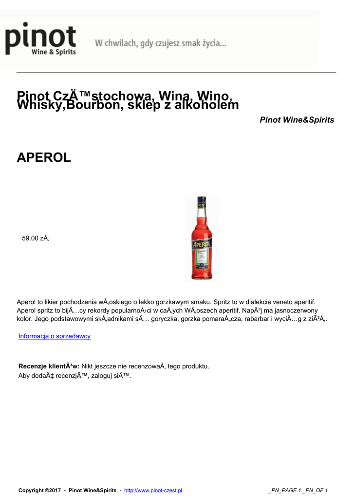 Pinot CzÄ™stochowa, Wina, Wino, Whisky,Bourbon, sklep z alkoholem Pinot Wine&Spirits APEROL 59.00 zÅ‚ Aperol to likier pochodzenia wÅ‚oskiego o lekko gorzkawym smaku. Spritz to w dialekcie veneto aperitif. Aperol spritz to bijÄ…cy rekordy popularnoÅ›ci w caÅ‚ych WÅ‚oszech aperitif. Napój ma jasnoczerwony kolor. Jego podstawowymi skÅ‚adnikami sÄ… goryczka, gorzka pomaraÅ„cza, rabarbar i wyciÄ…g z ziół. Informacja o sprzedawcy Recenzje klientów: Nikt jeszcze nie recenzowaÅ‚ tego produktu. Aby dodać recenzjÄ™, zaloguj siÄ™. Copyright ©2017 - Pinot Wine&Spirits - http://www.pinot-czest.pl _PN_PAGE 1 _PN_OF 1