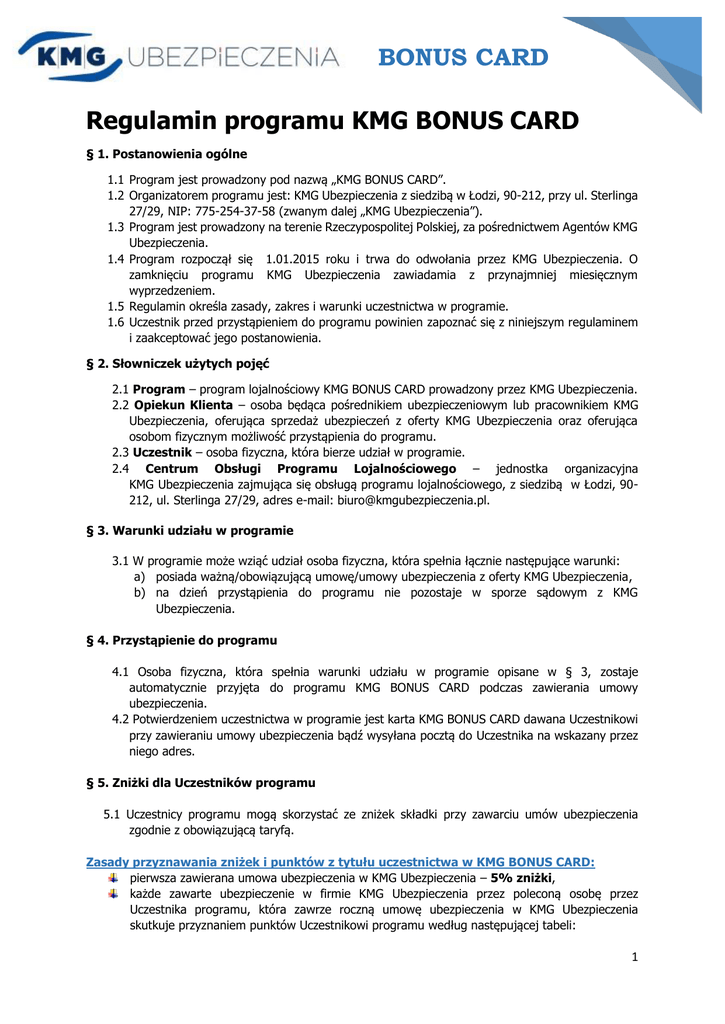 BONUS CARD Regulamin programu KMG BONUS CARD § 1. Postanowienia ogólne 1.1 Program jest prowadzony pod nazwą „KMG BONUS CARD”. 1.2 Organizatorem programu jest: KMG Ubezpieczenia z siedzibą w Łodzi, 90-212, przy ul. Sterlinga 27/29, NIP: 775-254-37-58 (zwanym dalej „KMG Ubezpieczenia”). 1.3 Program jest prowadzony na terenie Rzeczypospolitej Polskiej, za pośrednictwem Agentów KMG Ubezpieczenia. 1.4 Program rozpoczął się 1.01.2015 roku i trwa do odwołania przez KMG Ubezpieczenia. O zamknięciu programu KMG Ubezpieczenia zawiadamia z przynajmniej miesięcznym wyprzedzeniem. 1.5 Regulamin określa zasady, zakres i warunki uczestnictwa w programie. 1.6 Uczestnik przed przystąpieniem do programu powinien zapoznać się z niniejszym regulaminem i zaakceptować jego postanowienia. § 2. Słowniczek użytych pojęć 2.1 Program – program lojalnościowy KMG BONUS CARD prowadzony przez KMG Ubezpieczenia. 2.2 Opiekun Klienta – osoba będąca pośrednikiem ubezpieczeniowym lub pracownikiem KMG Ubezpieczenia, oferująca sprzedaż ubezpieczeń z oferty KMG Ubezpieczenia oraz oferująca osobom fizycznym możliwość przystąpienia do programu. 2.3 Uczestnik – osoba fizyczna, która bierze udział w programie. 2.4 Centrum Obsługi Programu Lojalnościowego – jednostka organizacyjna KMG Ubezpieczenia zajmująca się obsługą programu lojalnościowego, z siedzibą w Łodzi, 90212, ul. Sterlinga 27/29, adres e-mail: [email protected]. § 3. Warunki udziału w programie 3.1 W programie może wziąć udział osoba fizyczna, która spełnia łącznie następujące warunki: a) posiada ważną/obowiązującą umowę/umowy ubezpieczenia z oferty KMG Ubezpieczenia, b) na dzień przystąpienia do programu nie pozostaje w sporze sądowym z KMG Ubezpieczenia. § 4. Przystąpienie do programu 4.1 Osoba fizyczna, która spełnia warunki udziału w programie opisane w § 3, zostaje automatycznie przyjęta do programu KMG BONUS CARD podczas zawierania umowy ubezpieczenia. 4.2 Potwierdzeniem uczestnictwa w programie jest karta KMG BONUS CARD dawana Uczestnikowi przy zawieraniu umowy ubezpieczenia bądź wysyłana pocztą do Uczestnika na wskazany przez niego adres. § 5. Zniżki dla Uczestników programu 5.1 Uczestnicy programu mogą skorzystać ze zniżek składki przy zawarciu umów ubezpieczenia zgodnie z obowiązującą taryfą. Zasady przyznawania zniżek i punktów z tytułu uczestnictwa w KMG BONUS CARD: pierwsza zawierana umowa ubezpieczenia w KMG Ubezpieczenia – 5% zniżki, każde zawarte ubezpieczenie w firmie KMG Ubezpieczenia przez poleconą osobę przez Uczestnika programu, która zawrze roczną umowę ubezpieczenia w KMG Ubezpieczenia skutkuje przyznaniem punktów Uczestnikowi programu według następującej tabeli: 1 BONUS CARD Rodzaj ubezpieczenia Ubezpieczenie mieszkania / domu Ubezpieczenie indywidualne na życie Ubezpieczenie komunikacyjne AC Ubezpieczenie komunikacyjne OC Liczba punktów 5 5 3 2 5.2 Za każde uzyskane 50 punktów klient otrzymuje BONY ZAKUPOWE o łącznej wartości 50 zł . 5.3 W trakcie trwania programu decyzją KMG Ubezpieczenia Uczestnikom mogą zostać przyznane również inne bonusy, o czym KMG Ubezpieczenia będzie informować drogą mailową bądź poprzez swoich Opiekunów Klienta. § 6. Dodatkowe przywileje dla Uczestników programu 6.1 Każdy Uczestnik programu zostaje dodatkowo objęty pomocą w razie szkody. KMG Ubezpieczenia pomaga Uczestnikowi w załatwieniu formalności oraz służy pomocą doradztwem w zakresie dalszych postępowań z Towarzystwem Ubezpieczeniowym. § 7. Postanowienia końcowe 7.1 Uczestnik zobowiązany jest do aktualizacji swoich danych osobowych. Zmiana danych uczestnika, w tym adresu, numeru telefonu, adresu e-mail, dokonywane będzie na podstawie dyspozycji Uczestnika zgłoszonej Centrum Obsługi Programu Lojalnościowego. 7.2 Do regulaminu mogą być wprowadzane zmiany z zachowaniem niniejszego regulaminu i postanowień prawa. O wszelkich zmianach uczestnicy będą informowani w jednostkach sprzedaży oraz na stronie www.kmgubezpieczenia.pl Zmiany obowiązują wszystkich Uczestników programu, którzy po ich wprowadzeniu nie złożyli rezygnacji w najbliższym czasie, tj. w ciągu 14 dni. Program obowiązuje przez czas nieokreślony. Uczestnik ma prawo rezygnacji z udziału w programie w każdym momencie, bez zachowania okresu wypowiedzenia. 7.3 W przypadku rezygnacji Uczestnika z uczestnictwa w programie, przesyła on do Centrum Obsługi Programu Lojalnościowego KMG Ubezpieczenia pisemne oświadczenie o rezygnacji z Programu. Uczestnik potwierdza rezygnację z Programu podpisem na oświadczeniu. Z dniem złożenia rezygnacji Uczestnik traci wszystkie dotychczasowe uprawnienia wynikające z uczestnictwa w programie. 7.4 W przypadku rezygnacji z uczestnictwa, Uczestnik nie może przekazywać swoich uprawnień innym osobom. 7.5Regulamin programu jest dostępny do wglądu na stronie internetowej www.kmgubezpieczenia.pl . 7.6 reklamacje przyjmuje Centrum Obsługi Programu Lojalnościowego KMG Ubezpieczenia w Łodzi, 90-212 Łódź, ul. Sterlinga 27/29. 7.7 Termin rozpatrywania reklamacji wynosi 30 dni od dnia jej złożenia. 7.8 Niniejszy regulamin wchodzi w życie z dniem 01.01.2015 r. 7.9 Administratorem danych jest KMG Ubezpieczenia z siedzibą w Łodzi, 90-212, ul. Sterlinga 27/29, dane osobowe są zbierane w celu i w związku z uczestnictwem w programie KMG BONUS CARD, a także w celach analitycznych i archiwalnych. Uczestnictwo w programie KMG BONUS CARD jest dobrowolne. Klient posiada prawo do dostępu do treści swoich danych oraz ich poprawiania. 8.0 Wszystkie prawa autorskie do programu KMG BONUS CARD zastrzeżone dla KMG Ubezpieczenia z siedzibą w 90- 212 Łodzi, ul. Sterlinga 27/29. 2