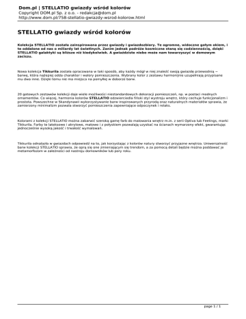 Dom.pl | STELLATIO gwiazdy wśród kolorów Copyright DOM.pl Sp. z o.o. - [email protected] http://www.dom.pl/758-stellatio-gwiazdy-wsrod-kolorow.html STELLATIO gwiazdy wśród kolorów Kolekcja STELLATIO została zainspirowana przez gwiazdy i gwiazdozbiory. Te ogromne, widoczne gołym okiem, i te oddalone od nas o miliardy lat świetlnych. Zanim jednak podróże kosmiczne staną się codziennością, dzięki STELLATIO galaktyki są bliższe niż kiedykolwiek. A gwiaździste niebo może nam towarzyszyć w domowym zaciszu. Nowa kolekcja Tikkurila została opracowana w taki sposób, aby każdy mógł w niej znaleźć swoją gwiazdę przewodnią − barwę, która najlepiej odda charakter i walory pomieszczenia. Wybrany kolor z zestawu harmonijnie uzupełniają przypisane mu dwa inne. Dzięki temu nie ma miejsca na pomyłkę w doborze barw. 20 gotowych zestawów kolekcji daje wiele możliwości niestandardowych dekoracji pomieszczeń, np. w postaci modnych ornamentów. Co więcej, harmonia kolorów STELLATIO odzwierciedla fiński styl wystroju wnętrz, który cechuje funkcjonalizm i prostota. Powszechne w Skandynawii wykorzystywanie barw inspirowanych przyrodą oraz naturalnych materiałów sprawia, że zamierzony minimalizm pozwala stworzyć pomieszczenia zapewniające odpoczynek i relaks. Kolorami z kolekcji STELLATIO można zabarwić szeroką gamę farb do malowania wnętrz m.in. z serii Optiva lub Feelings, marki Tikkurila. Farby te lateksowe i akrylowe, matowe i z połyskiem pozwalają uzyskać na ścianach wymarzony efekt, gwarantując jednocześnie wysoką jakość i trwałość wymalowań. Tikkurila odnalazła w gwiazdach odpowiedź na to, jak korzystając z kolorów natury stworzyć przyjazne wnętrza. Uniwersalność barw kolekcji STELLATIO sprawia, że oprą się one zmieniającym się trendom, a za pomocą detali będzie można poddawać je metamorfozom w zależności od nastroju domowników lub pory roku. page 1 / 1