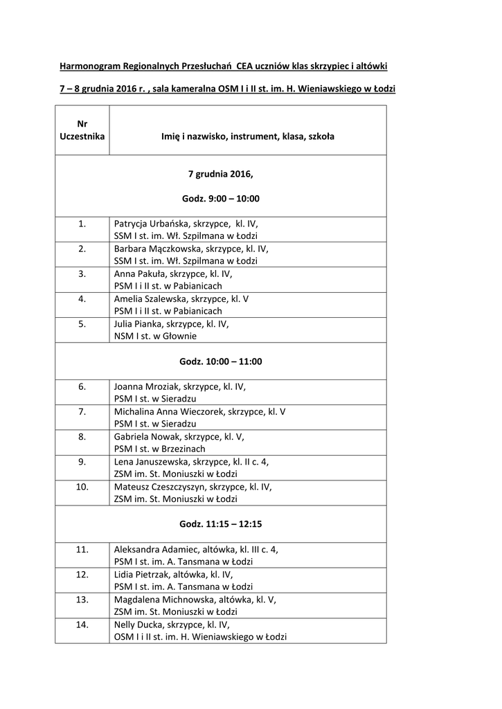 Harmonogram Regionalnych Przesłuchań CEA uczniów klas skrzypiec i altówki 7 – 8 grudnia 2016 r. , sala kameralna OSM I i II st. im. H. Wieniawskiego w Łodzi Nr Uczestnika Imię i nazwisko, instrument, klasa, szkoła 7 grudnia 2016, Godz. 9:00 – 10:00 1. 2. 3. 4. 5. Patrycja Urbańska, skrzypce, kl. IV, SSM I st. im. Wł. Szpilmana w Łodzi Barbara Mączkowska, skrzypce, kl. IV, SSM I st. im. Wł. Szpilmana w Łodzi Anna Pakuła, skrzypce, kl. IV, PSM I i II st. w Pabianicach Amelia Szalewska, skrzypce, kl. V PSM I i II st. w Pabianicach Julia Pianka, skrzypce, kl. IV, NSM I st. w Głownie Godz. 10:00 – 11:00 6. 7. 8. 9. 10. Joanna Mroziak, skrzypce, kl. IV, PSM I st. w Sieradzu Michalina Anna Wieczorek, skrzypce, kl. V PSM I st. w Sieradzu Gabriela Nowak, skrzypce, kl. V, PSM I st. w Brzezinach Lena Januszewska, skrzypce, kl. II c. 4, ZSM im. St. Moniuszki w Łodzi Mateusz Czeszczyszyn, skrzypce, kl. IV, ZSM im. St. Moniuszki w Łodzi Godz. 11:15 – 12:15 11. 12. 13. 14. Aleksandra Adamiec, altówka, kl. III c. 4, PSM I st. im. A. Tansmana w Łodzi Lidia Pietrzak, altówka, kl. IV, PSM I st. im. A. Tansmana w Łodzi Magdalena Michnowska, altówka, kl. V, ZSM im. St. Moniuszki w Łodzi Nelly Ducka, skrzypce, kl. IV, OSM I i II st. im. H. Wieniawskiego w Łodzi Godz. 12:15 – 13:30 15. 16. 17. 18. 19. Natalia Fender, skrzypce, kl. V, OSM I i II st. im. H. Wieniawskiego w Łodzi Kacper Zaremba, skrzypce, kl. IV, MSM I st. w Gostyninie Katarzyna Korpowska, skrzypce, kl. V, MSM I st. w Gostyninie Julia Bułacińska, skrzypce, kl. IV, PSM I i II st. im. I. J. Paderewskiego w Piotrkowie Trybunalskim Dawid Kasprzak, skrzypce, kl. V, OSM I i II st. im. H. Wieniawskiego w Łodzi Przerwa obiadowa Godz. 14:30 – 15:30 20. 21. 22. 23. 24. Weronika Jakimiec, skrzypce, kl. II c. 4, PSM I st. im. A. Tansmana w Łodzi Maria Angerman, skrzypce, kl. IV, PSM I i II st. w Zduńskiej Woli Hanna Józefowicz, skrzypce, kl. V, PSM I i II st. w Zduńskiej Woli Lena Matusiak, skrzypce, kl. IV, PSM I i II st. w Zduńskiej Woli Adriana Ciszewska, skrzypce, kl. V, PSM I i II st. w Zduńskiej Woli Godz. 15:30 – 16:30 25. 26. 27. 28. 29. Magdalena Nowak, skrzypce, kl. IV, PSM I st. w Opocznie Weronika Hes, skrzypce, kl. IV, PSM I i II st. im. prof. T. Wrońskiego w Tomaszowie Mazowieckim Iga Lewandowska, skrzypce, kl. IV, PSM I i II st. im. prof. T. Wrońskiego w Tomaszowie Mazowieckim Marta Kiedrzyńska, skrzypce, kl. V, PSM I i II st. im. prof. T. Wrońskiego w Tomaszowie Mazowieckim Weronika Boratyńska, skrzypce, kl. IV, ZSM im. St. Moniuszki w Łodzi Godz. 16:45 – 18:00 30. Krystyna Karwowska, skrzypce, kl. V, ZSM im. St. Moniuszki w Łodzi 31. 32. 33. 34. 35. 36. Zofia Kalukin, skrzypce, kl. IV, NSM I st. Stowarzyszenia Przyjaciół Szkół Katolickich w Łodzi Maria Gajda, skrzypce, kl. IV, NSM I st. Stowarzyszenia Przyjaciół Szkół Katolickich w Łodzi Tymoteusz Wojciechowski, skrzypce, kl. V, NSM I st. Stowarzyszenia Przyjaciół Szkół Katolickich w Łodzi Magdalena Grzegorczyk, skrzypce, kl. II c. 4, PSM I st. im. G. Bacewicz w Radomsku Hubert Grabowski, skrzypce, kl. IV, PSM I st. im. G. Bacewicz w Radomsku Joanna Hebda, skrzypce, kl. V, PSM I st. im. G. Bacewicz w Radomsku Godz. 18:00 – 19:00 37. 38. 39. 40. Zuzanna Wilczyńska, skrzypce, kl. IV PSM I st. im. F. Chopina w Skierniewicach Maja Piwek, skrzypce, kl. V, PSM I st. im. F. Chopina w Skierniewicach Amelia Bąk, skrzypce, kl. IV, PSM I st. w Końskich Katarzyna Byczkowska, skrzypce, kl. V, PSM I st. w Końskich. 8 grudnia 2016 r. godz. 9:00 – 10:00 41. 42. 43. 44. 45. Gabriela Raczyńska, skrzypce, kl. V, SM I st. ZNP w Łodzi. Agata Stańczyk, skrzypce, kl. III c. 4, PSM I st. im. A. Tansmana w Łodzi Aleksandra Żak, skrzypce, kl. IV, PSM I st. im. A. Tansmana w Łodzi Julia Gajda, skrzypce, kl. IV, PSM I st. im. A. Tansmana w Łodzi Łukasz Lesiewicz, skrzypce, kl. V, PSM I st. im. A. Tansmana w Łodzi Godz. 10:00 – 11:00 46. 47. 48. 49. Kamila Filipiak, skrzypce, kl. II c. 4, PSM I i II st. im. K. Kurpińskiego w Kutnie Szymon Walczak, skrzypce, kl. III c. 4 PSM I i II st. im. K. Kurpińskiego w Kutnie Zofia Antosik, skrzypce, kl. V, PSM I i II st. im. K. Kurpińskiego w Kutnie Anna Najman, skrzypce, kl. V, PSM I i II st. im. K. Kurpińskiego w Kutnie 50. Zuzanna Piasecka, skrzypce, kl. V, PSM I i II st. im. K. Kurpińskiego w Kutnie Godz. 11:15 – 12:00 51. 52. 53. 54. Maja Niewiadomska, skrzypce, kl. IV, PSM I st. w Bełchatowie Lena Lasota, skrzypce, kl. V, PSM I st. w Bełchatowie Weronika Adamus, skrzypce, kl. IV, PSM I st. w Wieluniu Hanna Stochniałek, skrzypce, kl. V PSM I st. w Wieluniu Godz. 12:00 – 13:00 55. 56. 57. 58. Aniela Pabjańczyk, skrzypce, kl. IV, PSM I st. w Zgierzu Agata Morawska, skrzypce, kl. V, PSM I st. w Zgierzu Aleksandra Kraft, skrzypce, kl. IV NSM I st. w Łowiczu. Wiktoria Graczyk, skrzypce, kl. V NSM I st. w Łowiczu Uwaga. Organizatorzy proszą o gotowość do występu przynajmniej pół godziny przed planowanym czasem.