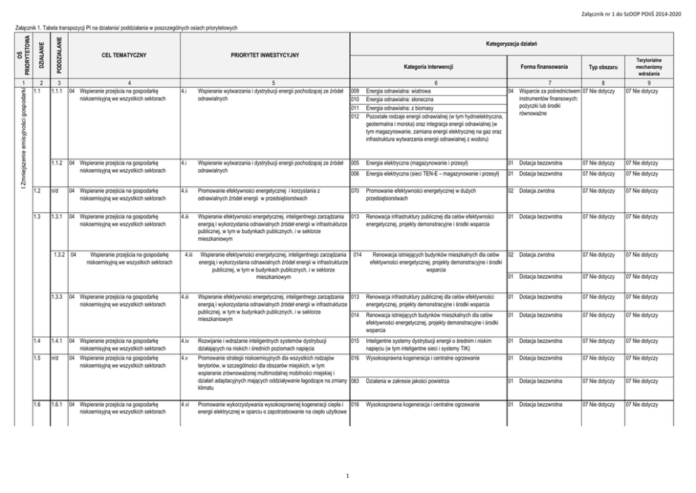 Załącznik nr 1 do SzOOP POIiŚ 2014-2020 I Zmniejszenie emisyjności gospodarki 1 2 1.1 PODDZIAŁANIE DZIAŁANIE OŚ PRIORYTETOWA Załącznik 1. Tabela transpozycji PI na działania/ poddziałania w poszczególnych osiach priorytetowych Kategoryzacja działań CEL TEMATYCZNY PRIORYTET INWESTYCYJNY Kategoria interwencji 3 1.1.1 4 04 Wspieranie przejścia na gospodarkę niskoemisyjną we wszystkich sektorach 1.1.2 04 Wspieranie przejścia na gospodarkę niskoemisyjną we wszystkich sektorach 4.i 4.i 5 Wspieranie wytwarzania i dystrybucji energii pochodzącej ze źródeł odnawialnych 009 010 011 012 07 Nie dotyczy 07 Nie dotyczy 006 Energia elektryczna (sieci TEN-E – magazynowanie i przesył) 01 Dotacja bezzwrotna 07 Nie dotyczy 07 Nie dotyczy 070 Promowanie efektywności energetycznej w dużych przedsiębiorstwach 02 Dotacja zwrotna 07 Nie dotyczy 07 Nie dotyczy Renowacja infrastruktury publicznej dla celów efektywności energetycznej, projekty demonstracyjne i środki wsparcia 01 Dotacja bezzwrotna 07 Nie dotyczy 07 Nie dotyczy 02 Dotacja zwrotna 07 Nie dotyczy 07 Nie dotyczy 01 Dotacja bezzwrotna 07 Nie dotyczy 07 Nie dotyczy Promowanie efektywności energetycznej i korzystania z odnawialnych źródeł energii w przedsiębiorstwach 1.3 1.3.1 04 Wspieranie przejścia na gospodarkę niskoemisyjną we wszystkich sektorach 4.iii Wspieranie efektywności energetycznej, inteligentnego zarządzania 013 energią i wykorzystania odnawialnych źródeł energii w infrastrukturze publicznej, w tym w budynkach publicznych, i w sektorze mieszkaniowym 1.3.3 04 Wspieranie przejścia na gospodarkę niskoemisyjną we wszystkich sektorach 4.iii 9 07 Nie dotyczy 01 Dotacja bezzwrotna 4.ii 4.iii 6 7 8 Energia odnawialna: wiatrowa 04 Wsparcie za pośrednictwem 07 Nie dotyczy instrumentów finansowych: Energia odnawialna: słoneczna pożyczki lub środki Energia odnawialna: z biomasy równoważne Pozostałe rodzaje energii odnawialnej (w tym hydroelektryczna, geotermalna i morska) oraz integracja energii odnawialnej (w tym magazynowanie, zamiana energii elektrycznej na gaz oraz infrastruktura wytwarzania energii odnawialnej z wodoru) Energia elektryczna (magazynowanie i przesył) 04 Wspieranie przejścia na gospodarkę niskoemisyjną we wszystkich sektorach Wspieranie przejścia na gospodarkę niskoemisyjną we wszystkich sektorach Terytorialne mechanizmy wdrażania 005 n/d 04 Typ obszaru Wspieranie wytwarzania i dystrybucji energii pochodzącej ze źródeł odnawialnych 1.2 1.3.2 Forma finansowania Wspieranie efektywności energetycznej, inteligentnego zarządzania 014 energią i wykorzystania odnawialnych źródeł energii w infrastrukturze publicznej, w tym w budynkach publicznych, i w sektorze mieszkaniowym Renowacja istniejących budynków mieszkalnych dla celów efektywności energetycznej, projekty demonstracyjne i środki wsparcia Wspieranie efektywności energetycznej, inteligentnego zarządzania 013 energią i wykorzystania odnawialnych źródeł energii w infrastrukturze publicznej, w tym w budynkach publicznych, i w sektorze 014 mieszkaniowym Renowacja infrastruktury publicznej dla celów efektywności energetycznej, projekty demonstracyjne i środki wsparcia 01 Dotacja bezzwrotna 07 Nie dotyczy 07 Nie dotyczy Renowacja istniejących budynków mieszkalnych dla celów efektywności energetycznej, projekty demonstracyjne i środki wsparcia 01 Dotacja bezzwrotna 07 Nie dotyczy 07 Nie dotyczy Inteligentne systemy dystrybucji energii o średnim i niskim napięciu (w tym inteligentne sieci i systemy TIK) 01 Dotacja bezzwrotna 07 Nie dotyczy 07 Nie dotyczy 1.4 1.4.1 04 Wspieranie przejścia na gospodarkę niskoemisyjną we wszystkich sektorach 4.iv Rozwijanie i wdrażanie inteligentnych systemów dystrybucji działających na niskich i średnich poziomach napięcia 1.5 n/d 04 Wspieranie przejścia na gospodarkę niskoemisyjną we wszystkich sektorach 4.v Promowanie strategii niskoemisyjnych dla wszystkich rodzajów 016 terytoriów, w szczególności dla obszarów miejskich, w tym wspieranie zrównoważonej multimodalnej mobilności miejskiej i działań adaptacyjnych mających oddziaływanie łagodzące na zmiany 083 klimatu Wysokosprawna kogeneracja i centralne ogrzewanie 01 Dotacja bezzwrotna 07 Nie dotyczy 07 Nie dotyczy Działania w zakresie jakości powietrza 01 Dotacja bezzwrotna 07 Nie dotyczy 07 Nie dotyczy Promowanie wykorzystywania wysokosprawnej kogeneracji ciepła i 016 energii elektrycznej w oparciu o zapotrzebowanie na ciepło użytkowe Wysokosprawna kogeneracja i centralne ogrzewanie 01 Dotacja bezzwrotna 07 Nie dotyczy 07 Nie dotyczy 1.6 1.6.1 04 Wspieranie przejścia na gospodarkę niskoemisyjną we wszystkich sektorach 4.vi 015 1 1.6 1 2 1.7 Załącznik nr 1 do SzOOP POIiŚ 2014-2020 3 1.6.2 1.7.1 4 04 Wspieranie przejścia na gospodarkę niskoemisyjną we wszystkich sektorach 04 Wspieranie przejścia na gospodarkę niskoemisyjną we wszystkich sektorach 1.7.2 04 Wspieranie przejścia na gospodarkę niskoemisyjną we wszystkich sektorach II Ochrona środowiska, w tym adaptacja do zmian klimatu 1.7.3 2.1 2.2 2.3 n/d n/d n/d 04 Wspieranie przejścia na gospodarkę niskoemisyjną we wszystkich sektorach 05 Promowanie dostosowania do zmiany klimatu, zapobiegania ryzyku i zarządzania ryzykiem 06 Zachowanie i ochrona i środowiska naturalnego i wspieranie efektywnego gospodarowania zasobami 06 Zachowanie i ochrona i środowiska naturalnego i wspieranie efektywnego gospodarowania zasobami 4.vi 4.iii 4.v 4.vi 5.ii 6.i 6.ii 5 Promowanie wykorzystywania wysokosprawnej kogeneracji ciepła i 016 energii elektrycznej w oparciu o zapotrzebowanie na ciepło użytkowe 7 01 Dotacja bezzwrotna 8 07 Nie dotyczy 9 07 Nie dotyczy Wspieranie efektywności energetycznej, inteligentnego zarządzania 014 Renowacja istniejących budynków mieszkalnych dla celów energią i wykorzystania odnawialnych źródeł energii w infrastrukturze efektywności energetycznej, projekty demonstracyjne i środki publiczne