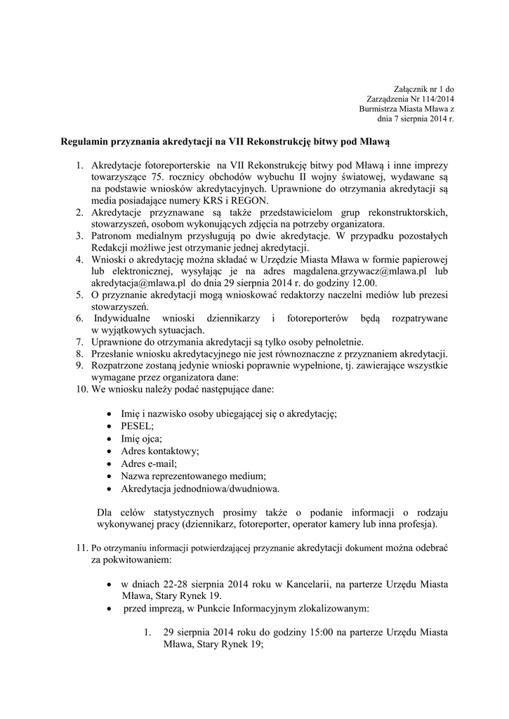 Załącznik nr 1 do Zarządzenia Nr 114/2014 Burmistrza Miasta Mława z dnia 7 sierpnia 2014 r. Regulamin przyznania akredytacji na VII Rekonstrukcję bitwy pod Mławą 1. Akredytacje fotoreporterskie na VII Rekonstrukcję bitwy pod Mławą i inne imprezy towarzyszące 75. rocznicy obchodów wybuchu II wojny światowej, wydawane są na podstawie wniosków akredytacyjnych. Uprawnione do otrzymania akredytacji są media posiadające numery KRS i REGON. 2. Akredytacje przyznawane są także przedstawicielom grup rekonstruktorskich, stowarzyszeń, osobom wykonujących zdjęcia na potrzeby organizatora. 3. Patronom medialnym przysługują po dwie akredytacje. W przypadku pozostałych Redakcji możliwe jest otrzymanie jednej akredytacji. 4. Wnioski o akredytację można składać w Urzędzie Miasta Mława w formie papierowej lub elektronicznej, wysyłając je na adres [email protected] lub [email protected] do dnia 29 sierpnia 2014 r. do godziny 12.00. 5. O przyznanie akredytacji mogą wnioskować redaktorzy naczelni mediów lub prezesi stowarzyszeń. 6. Indywidualne wnioski dziennikarzy i fotoreporterów będą rozpatrywane w wyjątkowych sytuacjach. 7. Uprawnione do otrzymania akredytacji są tylko osoby pełnoletnie. 8. Przesłanie wniosku akredytacyjnego nie jest równoznaczne z przyznaniem akredytacji. 9. Rozpatrzone zostaną jedynie wnioski poprawnie wypełnione, tj. zawierające wszystkie wymagane przez organizatora dane: 10. We wniosku należy podać następujące dane: Imię i nazwisko osoby ubiegającej się o akredytację; PESEL; Imię ojca; Adres kontaktowy; Adres e-mail; Nazwa reprezentowanego medium; Akredytacja jednodniowa/dwudniowa. Dla celów statystycznych prosimy także o podanie informacji o rodzaju wykonywanej pracy (dziennikarz, fotoreporter, operator kamery lub inna profesja). 11. Po otrzymaniu informacji potwierdzającej przyznanie akredytacji dokument można odebrać za pokwitowaniem: w dniach 22-28 sierpnia 2014 roku w Kancelarii, na parterze Urzędu Miasta Mława, Stary Rynek 19. przed imprezą, w Punkcie Informacyjnym zlokalizowanym: 1. 29 sierpnia 2014 roku do godziny 15:00 na parterze Urzędu Miasta Mława, Stary Rynek 19; 2. 30 sierpnia 2014 r. do godziny 15:00 na polu bitwy pod Mławą w Uniszkach Zawadzkich. 12. W przypadkach nieuregulowanych niniejszym regulaminem, ostateczne decyzje podejmuje rzecznik prasowy Urzędu Miasta Mława. 13. Informacja o przyznaniu bądź odmowie przyznania akredytacji jest wysyłana na e-mail podany we wniosku akredytacyjnym. 14. Osoba starająca się o akredytację powinna stosować się do poleceń służb porządkowych. 15. Organizator nie ponosi odpowiedzialności za szkody poniesione przez fotoreportera, dziennikarza lub operatora kamery, na skutek nieprzestrzegania zasad bezpieczeństwa na polu Rekonstrukcji bitwy pod Mławą oraz w czasie imprez towarzyszących.
