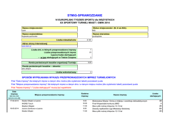 STMiG-SPRAWOZDANIE VI EUROPEJSKI TYDZIEŃ SPORTU dla WSZYSTKICH XX SPORTOWY TURNIEJ MIAST i GMIN 2014 Nazwa miejscowości: Status miejscowości (M, G lub MiG): Łasin MiG Nazwa województwa: Nazwa starostwa: grudziądzkie Kujawsko-pomorskie Liczba mieszkańców 8 181 Adres strony internetowej: www.lasin.pl Liczba dni, w których przeprowadzono imprezy Liczba przeprowadzonych imprez Łączna liczba startujących – w tym startujących w Teście Coopera_ 7 23 0 Kwota poniesionych kosztów organizacji Turnieju 0,00 Kwota poniesionych kosztów – słownie: zero złotych Liczba wolontariuszy 0 SPOSÓB WYPEŁNIANIA WYKAZU PRZEPROWADZONYCH IMPREZ TURNIEJOWYCH Pole "Data imprezy" dla kolejnych imprez w danym dniu można (dla czytelności tabeli) pozostawić puste Pole "Miejsce przeprowadzenia imprezy" dla kolejnych imprez w danym dniu i w danym miejscu można (dla czytelności tabeli) pozostawić puste Pola "Nazwa imprezy" i "Liczba startujących" muszą być wypełnione Data imprezy Miejsce przeprowadzenia imprezy [dd-mm-rrrr] lub [rrrr-mm-dd] 17-05-2014 18-05-2014 Godzina imprezy Stadion Miejski w Łasinie 9:00 WORD Toruń Stadion Miejski 10:00 11:00 Jezioro Zamkowe w Łasinie 8:00 Stadion Miejski 11:00 Nazwa imprezy Mistrzostwa Miasta i Gminy w trójboju i czwórboju lekkoatletycznym Finał Wojewódzki konkursu BRD Mecz piłki nożnej chłopców 14-15 lat Zawody wędkarskie Liga Młodzieży Szkolonej Mecz piłki nożnej chłopców 12-13 lat Liczba startujących 48 4 26 64 20 19-05-2014 20-05-2014 21-05-2014 22-05-2014 23-05-2014 Szkoła Podstawowa w Zawdzie 10:30 Muzyczne zabawy ruchowe ZUMBA KIDS Gimnazjum Nr 2 w Jankowicach 12:00 Dzień Sportu Szkoła Podstawowa w Zawdzie 12:30 Stadion Miejski 16:30 Stadion Miejski 18:00 Gimnazjum Nr 2 w Jankowicach 10:00 Stadion GKS Olimpia Grudziądz 11:00 Stadion Miejski 17:00 Eliminacje do konkursu BRD Zajęcia piłki nożnej chłopców 14-15 lat Zajęcia piłki nożnej chłopców 12-13 lat Turniej piłki siatkowej Finał powiatowy trójboju i czwórboju lekkoatletycznego Zajęcia piłki nożnej chłopców 7-10 lat Gimnazjum Nr 2 w Jankowicach 10:00 Turniej tenisa stołowego Szkoła Podstawowa w Zawdzie 11:30 Rytmiczne zabawy ruchowe Kompleks Orlik 17:00 Zajęcia piłki siatkowej dziewcząt 14-15 lat Trasa Zawda-Butowo - Zawda 9:00 Gimnazjum Nr 2 w Jankowicach 10:00 Stadion Miejski 16:30 Stadion Miejski 18:00 Rajd pieszy klas I-III zabytki przyrody Turniej piłki ręcznej Zajęcia piłki nożnej chłopców 14-15 lat Zajęcia piłki nożnej chłopców 12-13 lat Park Miejski 9:00 Akcja „Polska Biega” Gimnazjum Nr 2 w Jankowicach 10:00 Turniej piłki nożnej „piątek” Stadion Miejski 17:00 Zajęcia piłki nożnej chłopców 7-10 lat 24 55 19 16 16 24 12 15 12 24 14 32 28 14 16 189 25 15