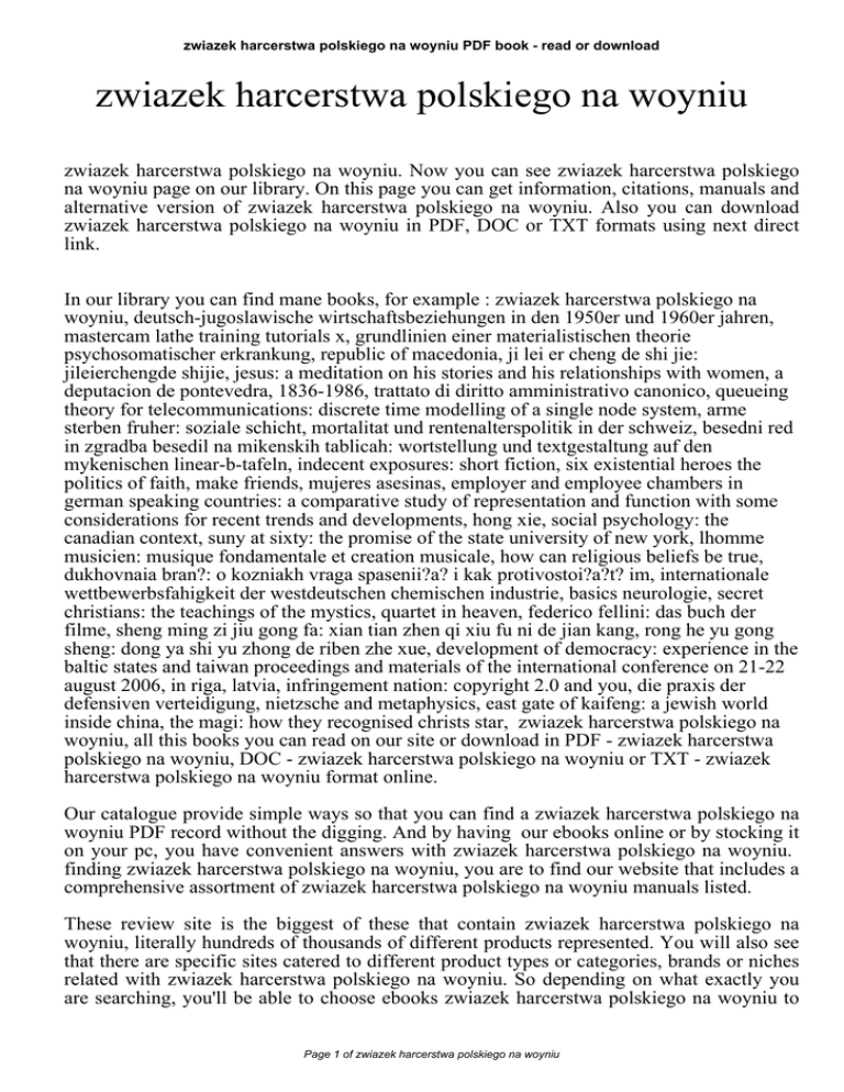 zwiazek harcerstwa polskiego na woyniu PDF book - read or download zwiazek harcerstwa polskiego na woyniu zwiazek harcerstwa polskiego na woyniu. Now you can see zwiazek harcerstwa polskiego na woyniu page on our library. On this page you can get information, citations, manuals and alternative version of zwiazek harcerstwa polskiego na woyniu. Also you can download zwiazek harcerstwa polskiego na woyniu in PDF, DOC or TXT formats using next direct link. In our library you can find mane books, for example : zwiazek harcerstwa polskiego na woyniu, deutsch-jugoslawische wirtschaftsbeziehungen in den 1950er und 1960er jahren, mastercam lathe training tutorials x, grundlinien einer materialistischen theorie psychosomatischer erkrankung, republic of macedonia, ji lei er cheng de shi jie: jileierchengde shijie, jesus: a meditation on his stories and his relationships with women, a deputacion de pontevedra, 1836-1986, trattato di diritto amministrativo canonico, queueing theory for telecommunications: discrete time modelling of a single node system, arme sterben fruher: soziale schicht, mortalitat und rentenalterspolitik in der schweiz, besedni red in zgradba besedil na mikenskih tablicah: wortstellung und textgestaltung auf den mykenischen linear-b-tafeln, indecent exposures: short fiction, six existential heroes the politics of faith, make friends, mujeres asesinas, employer and employee chambers in german speaking countries: a comparative study of representation and function with some considerations for recent trends and developments, hong xie, social psychology: the canadian context, suny at sixty: the promise of the state university of new york, lhomme musicien: musique fondamentale et creation musicale, how can religious beliefs be true, dukhovnaia bran?: o kozniakh vraga spasenii?a? i kak protivostoi?a?t? im, internationale wettbewerbsfahigkeit der westdeutschen chemischen industrie, basics neurologie, secret christians: the teachings of the mystics, quartet in heaven, federico fellini: das buch der filme, sheng ming zi jiu gong fa: xian tian zhen qi xiu fu ni de jian kang, rong he yu gong sheng: dong ya shi yu zhong de riben zhe xue, development of democracy: experience in the baltic states and taiwan proceedings and materials of the international conference on 21-22 august 2006, in riga, latvia, infringement nation: copyright 2.0 and you, die praxis der defensiven verteidigung, nietzsche and metaphysics, east gate of kaifeng: a jewish world inside china, the magi: how they recognised christs star, zwiazek harcerstwa polskiego na woyniu, all this books you can read on our site or download in PDF - zwiazek harcerstwa polskiego na woyniu, DOC - zwiazek harcerstwa polskiego na woyniu or TXT - zwiazek harcerstwa polskiego na woyniu format online. Our catalogue provide simple ways so that you can find a zwiazek harcerstwa polskiego na woyniu PDF record without the digging. And by having our ebooks online or by stocking it on your pc, you have convenient answers with zwiazek harcerstwa polskiego na woyniu. finding zwiazek harcerstwa polskiego na woyniu, you are to find our website that includes a comprehensive assortment of zwiazek harcerstwa polskiego na woyniu manuals listed. These review site is the biggest of these that contain zwiazek harcerstwa polskiego na woyniu, literally hundreds of thousands of different products represented. You will also see that there are specific sites catered to different product types or categories, brands or niches related with zwiazek harcerstwa polskiego na woyniu. So depending on what exactly you are searching, you'll be able to choose ebooks zwiazek harcerstwa polskiego na woyniu to Page 1 of zwiazek harcerstwa polskiego na woyniu zwiazek harcerstwa polskiego na woyniu PDF book - read or download suit your own needs, zwiazek harcerstwa polskiego na woyniu. Page 2 of zwiazek harcerstwa polskiego na woyniu