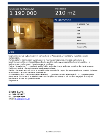DOM na SPRZEDAŻ 1 190 000 Piaseczno 210 m2 72/4005/ODS 1 190 000 PLN 210 189 195 2008 Brick Secondary CeramicTile Opis Segment w nowo wybudowanym kompleksie w Piasecznie, wykończony wysokiej jakości materiałami. Parter; salon z kominkiem wykończonym marmurem,łazienka, miejsce na kuchnię z jadalnią(wszystkie przyłącza).Na podłodze parkiet dębowy, w części kuchennej ,wejściu i w łazience gres polerowany i podgrzewana podłoga. Piętro ; 3 sypialnie.Przy sypialni małżeńskiej łazienka;druga łazienka wspólna dla dwóch pokoi. Poddasze; pokój z łazienką.w dachu okna połaciowe. Każda z łazienek wykończona w wysokim standardzie.W całym domu na podłodze parkiet dębowy , w łazienkach gres.Okna drewniane.Garaż. Dom oddany pod klucz(z wyjątkiem kuchni) , z garażem w bliskiej odległości od kolejki(szybkie połączenie z miastem), w sąsiedztwie domów jednorodzinnych, za oknami zagajnik z różnymi gatunkami drzew.Wszystkie media. Segment F Biuro Sural tel. 536223377 tel. 224066750 email: [email protected] Sural Nieruchomości Powered by TCPDF (www.tcpdf.org)