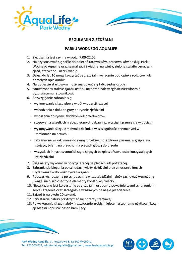 vv REGULAMIN ZJEŻDŻALNI PARKU WODNEGO AQUALIFE 1. Zjeżdżalnia jest czynna w godz. 7:00-22:00. 2. Należy stosować się ściśle do poleceń ratowników, pracowników obsługi Parku Wodnego Aqualife oraz sygnalizacji świetlnej na wieży; zielone światło oznacza zjazd, czerwone - oczekiwanie. 3. Dzieci do lat 10 mogą korzystać ze zjeżdżalni wyłącznie pod opieką rodziców lub dorosłych opiekunów. 4. Na podeście startowym może znajdować się tylko jedna osoba. 5. Zauważone w trakcie zjazdu usterki urządzeń należy zgłosić niezwłocznie dyżurującemu ratownikowi. 6. Bezwzględnie zabrania się: · wykonywania ślizgu głową w dół w pozycji leżącej · wchodzenia z dołu do góry po rynnie zjeżdżalni · wnoszenia do rynny jakichkolwiek przedmiotów · stosowania wszelkich niebezpiecznych zabaw np. wyścigi, łączenie się w pociągi · wykonywania ślizgu z małymi dziećmi, a w szczególności trzymanymi w ramionach na brzuchu · zabrania się wskakiwanie do rynny z rozbiegu, zjeżdżania parami, w grupie, na stojąco, tyłem, na brzuchu, na plecach głową do przodu · wszystkich innych czynności zagrażających bezpieczeństwu osób korzystających ze zjeżdżalni 7. Ślizg należy wykonać w pozycji leżącej na plecach lub półleżącej. 8. Zabrania się biegania po schodach wieży zjeżdżalni oraz zmuszania innych użytkowników do wykonywania zjazdu. 9. Podczas wchodzenia po schodach na wieże zjeżdżalni należy zachować wzmożoną uwagę na nisko osadzone elementy konstrukcji wierzy. 10. Niewskazane jest korzystanie ze zjeżdżalni osobom z poważniejszymi schorzeniami serca i krążenia oraz szczególnie wrażliwych na nagle przeciążenia. 11. Zajazd trwa około 20 sekund. 12. Przy starcie należy przytrzymać się poręczy startowej. 13. Po wykonaniu ślizgu należy niezwłocznie zrobić miejsce następnemu użytkownikowi zjeżdżalni i opuścić basen hamujący. Park Wodny Aqualife, ul. Koszarowa 8, 62-300 Września. Tel. 726 555 012, [email protected], www.basenwrześnia.pl vv 14. Osobom, które nie przestrzegają postanowień Regulaminu grozi zakaz wykonywania dalszych zjazdów, a w sytuacjach wyjątkowych – wydalenie z terenu pływalni. 15. W wypadku stwierdzenia wystąpienia zagrożenia bezpieczeństwa korzystania ze zjeżdżalni należy niezwłocznie powiadomić ratownika. 16. W razie wypadku spowodowanego nie przestrzeganiem regulaminu zjeżdżalni wszelka odpowiedzialność ponosi użytkownik. Park Wodny Aqualife zastrzega sobie prawo do interpretacji i wprowadzania zmian do niniejszego regulaminu. Regulamin obowiązuje od dnia: 01.10.2015r. Park Wodny Aqualife, ul. Koszarowa 8, 62-300 Września. Tel. 726 555 012, [email protected], www.basenwrześnia.pl