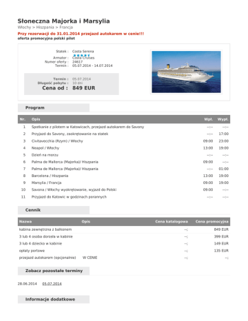 Słoneczna Majorka i Marsylia Włochy > Hiszpania > Francja Przy rezerwacji do 31.01.2014 przejazd autokarem w cenie!!! oferta promocyjna polski pilot Statek : Armator : Numer oferty : Termin : Termin : Długość pobytu : Costa Serena Costa Cruises 24617 05.07.2014 - 14.07.2014 05.07.2014 10 dni Cena od : 849 EUR Program Nr. Opis Wpł. Wypł. 1 Spotkanie z pilotem w Katowicach, przejazd autokarem do Savony --:-- --:-- 2 Przyjazd do Savony, zaokrętowanie na statek --:-- 17:00 3 Civitavecchia (Rzym) / Włochy 09:00 23:00 4 Neapol / Włochy 13:00 19:00 5 Dzień na morzu --:-- --:-- 6 Palma de Mallorca (Majorka)/ Hiszpania 09:00 --:-- 7 Palma de Mallorca (Majorka)/ Hiszpania --:-- 01:00 8 Barcelona / Hiszpania 13:00 19:00 9 Marsylia / Francja 09:00 19:00 10 Savona / Włochy wyokrętowanie, wyjazd do Polski 09:00 --:-- 11 Przyjazd do Katowic w godzinach porannych --:-- --:-- Cennik Nazwa Opis Cena katalogowa Cena promocyjna kabina zewnętrzna z balkonem --; 849 EUR 3 lub 4 osoba dorosła w kabinie --; 399 EUR 3 lub 4 dziecko w kabinie --; 149 EUR opłaty portowe --; 135 EUR --; --; przejazd autokarem (opcjonalnie) Zobacz pozostałe terminy 28.06.2014 05.07.2014 Informacje dodatkowe W CENIE cena obejmuje: rejs statkiem Costa Serena ****+; zakwaterowanie w kabinie wybranej kategorii (7 noclegów); serwis bagażowy i kabinowy; wyżywienie – 3 główne posiłki, przekąski między posiłkami, bufet lub przekąski o północy; korzystanie z basenu i innych urządzeń sportowo-rekreacyjnych; udział we wszystkich imprezach organizowanych na statku, przejazd autokarem na trasie Katowice – Savona - Katowice, opiekę polskiego pilota. cena nie obejmuje: opłat portowych i podatków, ubezpieczenia KL, NW i bagażu (135€/os.); ewentualnych noclegów w hotelu przed/po rejsie i transferów (na zapytanie); wycieczek fakultatywnych; korzystania z punktów usługowych (pralnia, fotograf, salon piękności i odnowy biologicznej, internet); napojów do obiadów i kolacji, drinków oraz napiwków obowiązkowych dla obsługi statku (ok. 7€/dzień/osobę dorosłą; 3,5€/dzień/dziecko). uwagi: kabiny 3/4 osobowe nie są dostępne we wszystkich kategoriach, a ich liczba jest ograniczona – sprzedaż tylko po potwierdzeniu. Grupa realizowana przy min. 20 osobach. DOJAZD WŁASNY: w przypadku dojazdu własnego zniżka w wysokości 70€/os. ALL INCLUSIVE (opcja) istnieje możliwość wykupienia pakietu ALL INCLUSIVE obejmującego wybrane napoje alkoholowe i bezalkoholowe dostępne bez ograniczeń we wszystkich barach. Cena pakietu 19,5€/dzień/osoba dorosła i 10€/dzień/dziecko. Warunkiem skorzystania z pakietu all inclusive jest wykupienie pakietu przez wszystkich pasażerów w kabinie na czas całego rejsu. WYCIECZKI FAKULTATYWNE Słoneczna Majorka i Marsylia