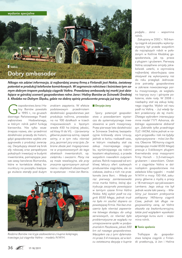 wydanie specjalne Valtra Dobry ambasador Nikogo nie zdziwi informacja, iż najbardziej znaną firmą z Finlandii jest Nokia, światowy potentat w produkcji telefonów komórkowych. W segmencie rolnictwa i leśnictwa tym samym dobrym tropem podążają ciągniki Valtra. Prawdziwą ambasadą tej marki jest działające w górskiej scenerii gospodarstwo rolne Jana i Haliny Baniów ze Ścinawki Średniej k. Kłodzka na Dolnym Śląsku, gdzie na dobrą opinię producenta pracują już trzy Valtry. G ospodarstwo Jana i Haliny Baniów powstało w 1995 r., na gruzach dawnego Państwowego Przedsiębiorstwa Hodowlanego, w którym rolnik pełnił funkcję kierownika. Nie tylko wcześniejsza nazwa, ale i przedmiot działalności przeszły do historii, gdyż gospodarstwo szybko zrezygnowało z produkcji zwierzęcej. Decydujący okazał się brak siły roboczej oraz perspektywa pokaźnych inwestycji w budynki inwentarskie, pamiętające jeszcze czasy kanclerza Bismarcka, które w kontekście słabej koniunktury na początku bieżącego stulecia stanęły pod dużym znakiem zapytania. W efekcie podstawowym przedmiotem działalności gospodarstwa jest produkcja roślinna, prowadzona na 100 działkach w trzech miejscowościach o łącznym areale 450 ha (różnej jakości, od klasy III do VI). – Uprawiamy głównie pszenicę ozimą, rzepak ozimy, a w tym roku również jary, jęczmień jary oraz żyto. Zebrane zboże jest magazynowane w przystosowanych do tego obiektach inwentarskich, np. cielętniku i owczarni. Plony nie są może rewelacyjne, ale przy znacznie ograniczonym zatrudnieniu i dopłatach obszarowych to wystarcza – mówi Jan Bania. Rodzina Baniów nie kryje zadowolenia z kupna kolejnego, trzeciego już ciągnika Valtra – modelu N141H. 36 17-18/2011 Decyzja żony Spory potencjał gospodarstwa z powodzeniem wystarcza do systematycznego inwestowania w park maszynowy. Przez pierwsze lata działalności w Ścinawce Średniej bezapelacyjnie królowały stare Ursusy, jednak w końcu nadszedł czas, w którym niezbędny stał się zakup mocniejszego ciągnika, wyróżniającego się niskimi kosztami eksploatacji, a przede wszystkim niewielkim zużyciem paliwa. Rolnik rozpoczął od wnikliwej lektury ofert czołowych producentów ciągników, ale co ciekawe, żadna z nich nie przekonała Jana Bani. – Wtedy po raz pierwszy zainteresowała mnie marka Valtra, której dystrybucję zaczynała powstająca w tamtym czasie firma Valtra Polska. Mój wybór padł na ciągnik 8550 Mega, jednak trudno było mi zaufać dopiero co powstającej firmie. Nie bez znaczenia było również zapewnienie łatwego dostępu do usług serwisowych, co również było problematyczne ze względu na umiejscowienie spółki w podpoznańskim Paczkowie, jakieś 300 km od naszego gospodarstwa. Męczyłem się z tymi dylematami przez 3-4 miesiące, aż w końcu ostateczną decyzję o kupnie podjęła… żona – wspomina rolnik. Zakupiony w 2002 r. 165-konny ciągnik od początku wykorzystywany był przede wszystkim do najcięższych robót w położonym w Kotlinie Kłodzkiej gospodarstwie, jak np. praca z pługiem i gruberem. Pierwszą Valtrę szczęśliwie omijały jakiekolwiek usterki, a czynnością najbardziej absorbującą czas okazywał się wykonywany raz do roku przegląd. Jednocześnie potrzeby gospodarstwa w zakresie nowoczesnego parku maszynowego, ze względu na kaprysy aury i górzyste położenie, stale rosły. W 2008 r. niezbędny stał się zakup kolejnego ciągnika. Wybór od razu padł na Valtrę. – Już wtedy byłem przekonany do tej marki. Dlatego wybrałem interesujący mnie model T171 Advance, do którego wyposażenie dobierał syn. Zabrakło tylko przedniego TUZ i WOM, które jednak w naszym przypadku i tak nie byłyby wykorzystywane – mówi Jan Bania. Obecnie 180-konny ciągnik (zastępując model 8550 Mega) pracuje z 5-skibowym pługiem Kvernelanda oraz maszynami firmy Horsch – 3,5-metrowym gruberem i siewnikiem. Ostatni z ciągników Valtra w dolnośląskim gospodarstwie ma zaledwie kilka tygodni – model N141H o mocy 150 KM, zakupiony głównie z myślą o pracy z 18-metrowym opryskiwaczem Lemkena. Jego zakup nie był jednak wcale taki pewny. – Mieliśmy już bowiem praktycznie zaklepany 140-konny ciągnik Case, jednak tak długo negocjowaliśmy cenę, aż Valtra okazała się bezkonkurencyjna, także pod względem wysokości sztywnego kursu euro – wspomina rolnik. Tanie spalanie Trafiające do gospodarstwa kolejne ciągniki z Finlandii przekonują, iż Jan i Halina wydanie specjalne Baniowie mają o zakupionym sprzęcie dobrą opinię. Nie kryją zadowolenia z ciągników, jednak w skali szkolnej marce Valtra nie wystawiają piątki, a jedynie… czwórkę. Nie chodzi jednak o jakieś wady konstrukcyjne, czy niesprawdzające się rozwiązania techniczne. – Po prostu w jednym przypadku popełniłem błąd, gdyż kupując ciągnik T171 powinienem wybrać model o 20-30 KM mocniejszy. Są bowiem pola, na których tej mocy nieco brakuje – utyskuje rolnik. Wśród największych zalet fińskich ciągników na pierwszy plan wybija się przede wszystkim niewielkie zużycie paliwa. – Ciągnik N141H został zatankowany 180 litrami oleju napędowego, co wystarczyło do pracy przez 28 mth. O takich wynikach w starych Ursusach mogliśmy tylko po- 9-letni ciągnik Valtra 8550 Mega szczęśliwie omijają poważniejsze usterki. marzyć – komplementuje Jan Bania. Zwraca również uwagę na relatywnie niewielkie koszty bieżące wynikające z niezawodności zakupionego sprzętu, np. te związane z przeglądami zamykają się kwotą rzędu ok. 6 tys. zł w ciągu dwóch lat. Bo i usterek przez te lata było na- prawdę niewiele. - Cieszy mnie, że ciągniki nigdy nie zawiodły, kiedy faktycznie były potrzebne. W ciągniku Mega 8550 (z przebiegiem ponad 5 tys. mth) nie podnosiły się ramiona, gdyż jakiś czujnik nie przekazał sygnału, iż cięgna zostały zużyte. W modelu T171 (1400 mth) jeszcze