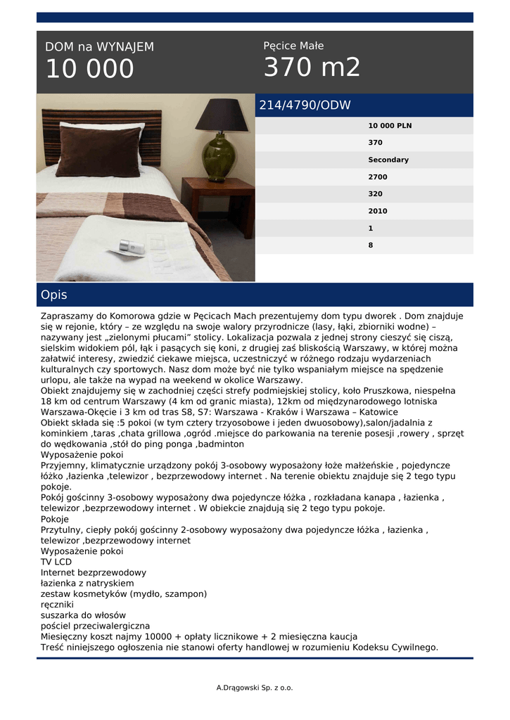 DOM na WYNAJEM 10 000 Pęcice Małe 370 m2 214/4790/ODW 10 000 PLN 370 Secondary 2700 320 2010 1 8 Opis Zapraszamy do Komorowa gdzie w Pęcicach Mach prezentujemy dom typu dworek . Dom znajduje się w rejonie, który – ze względu na swoje walory przyrodnicze (lasy, łąki, zbiorniki wodne) – nazywany jest „zielonymi płucami” stolicy. Lokalizacja pozwala z jednej strony cieszyć się ciszą, sielskim widokiem pól, łąk i pasących się koni, z drugiej zaś bliskością Warszawy, w której można załatwić interesy, zwiedzić ciekawe miejsca, uczestniczyć w różnego rodzaju wydarzeniach kulturalnych czy sportowych. Nasz dom może być nie tylko wspaniałym miejsce na spędzenie urlopu, ale także na wypad na weekend w okolice Warszawy. Obiekt znajdujemy się w zachodniej części strefy podmiejskiej stolicy, koło Pruszkowa, niespełna 18 km od centrum Warszawy (4 km od granic miasta), 12km od międzynarodowego lotniska Warszawa-Okęcie i 3 km od tras S8, S7: Warszawa - Kraków i Warszawa – Katowice Obiekt składa się :5 pokoi (w tym cztery trzyosobowe i jeden dwuosobowy),salon/jadalnia z kominkiem ,taras ,chata grillowa ,ogród .miejsce do parkowania na terenie posesji ,rowery , sprzęt do wędkowania ,stół do ping ponga ,badminton Wyposażenie pokoi Przyjemny, klimatycznie urządzony pokój 3-osobowy wyposażony łoże małżeńskie , pojedyncze łóżko ,łazienka ,telewizor , bezprzewodowy internet . Na terenie obiektu znajduje się 2 tego typu pokoje. Pokój gościnny 3-osobowy wyposażony dwa pojedyncze łóżka , rozkładana kanapa , łazienka , telewizor ,bezprzewodowy internet . W obiekcie znajdują się 2 tego typu pokoje. Pokoje Przytulny, ciepły pokój gościnny 2-osobowy wyposażony dwa pojedyncze łóżka , łazienka , telewizor ,bezprzewodowy internet Wyposażenie pokoi TV LCD Internet bezprzewodowy łazienka z natryskiem zestaw kosmetyków (mydło, szampon) ręczniki suszarka do włosów pościel przeciwalergiczna Miesięczny koszt najmy 10000 + opłaty licznikowe + 2 miesięczna kaucja Treść niniejszego ogłoszenia nie stanowi oferty handlowej w rozumieniu Kodeksu Cywilnego. A.Drągowski Sp. z o.o. Agnieszka Andruszkiewicz tel. 694151938 email: [email protected] A.Drągowski Sp. z o.o. Powered by TCPDF (www.tcpdf.org)