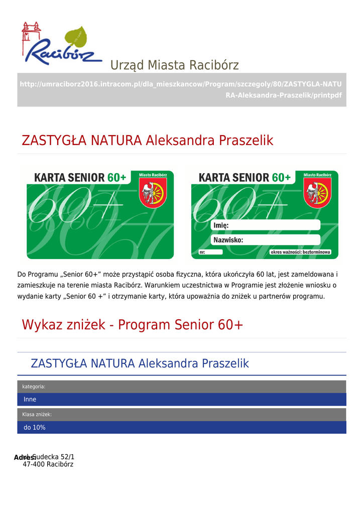 Urząd Miasta Racibórz http://umraciborz2016.intracom.pl/dla_mieszkancow/Program/szczegoly/80/ZASTYGLA-NATU RA-Aleksandra-Praszelik/printpdf ZASTYGŁA NATURA Aleksandra Praszelik Do Programu „Senior 60+” może przystąpić osoba fizyczna, która ukończyła 60 lat, jest zameldowana i zamieszkuje na terenie miasta Racibórz. Warunkiem uczestnictwa w Programie jest złożenie wniosku o wydanie karty „Senior 60 +” i otrzymanie karty, która upoważnia do zniżek u partnerów programu. Wykaz zniżek - Program Senior 60+ ZASTYGŁA NATURA Aleksandra Praszelik kategoria: Inne Klasa zniżek: do 10% ul. Sudecka 52/1 Adres: 47-400 Racibórz 032 418-13-74, 513 193 889 Tel: www:www.groby.zastygla-natura.biz, www.sklep.zastygla-natura.biz, www.zastygla-natura.blogspot.com 10% zniżki na wykonanie dekoracji nagrobnych, palm, wieńców wiązanek pogrzebowych, 10% zniżki za opiekę nad grobami oraz usługi porządkowe, ZOBACZ NA WIĘKSZEJ MAPIE ZOBACZ NA MAPIE ESIM Poprzednia kategoria: senior [4] format pdf Nazwa pliku uchwała.pdf Data publikacji Rozmiar 13-09-26 13:34 118.64KB Pobierz pobierz plik: uchwała.pdf pdf REGULAMIN SENIOR 60+.pdf 13-09-26 13:34 21.02KB pobierz plik: REGULAMIN SENIOR 60+.pdf doc wniosek.doc 13-09-26 13:35 25.5KB pobierz plik: wniosek.doc doc Wykaz ulg w ramach Programu SENIOR 60 + .doc 14-10-02 10:14 12.08MB pobierz plik: Wykaz ulg w ramach Programu SENIOR 60 + .doc