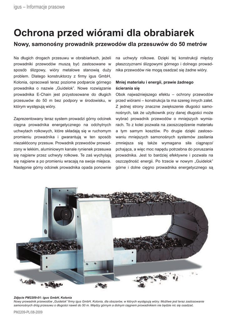 igus – Informacje prasowe Ochrona przed wiórami dla obrabiarek Nowy, samonośny prowadnik przewodów dla przesuwów do 50 metrów Na długich drogach przesuwu w obrabiarkach, jeżeli na uchwyty rolkowe. Dzięki tej konstrukcji między prowadniki przewodów muszą być zastosowane w płaszczyznami ślizgowymi górnego i dolnego prowad- sposób ślizgowy, wióry metalowe stanowią duży nika przewodów nie mogą osadzać się żadne wióry. problem. Dlatego konstruktorzy z firmy igus GmbH, Kolonia, opracowali teraz poziome podparcie górnego Mniej materiału i energii, prawie żadnego prowadnika o nazwie „Guidelok”. Nowe rozwiązanie ścierania się prowadnika E-Chain jest przystosowane do długich Obok najważniejszego efektu – ochrony przewodów przesuwów do 50 m bez podpory w środowisku, w przed wiórami – konstrukcja ta ma szereg innych zalet. którym występują wióry. Z jednej strony znaczne zwiększenie długości samonośnych, tak że użytkownik przy danej długości może Zaprezentowany teraz system prowadzi górny odcinek wybrać prowadnik przewodów o mniejszych wymia- cięgna prowadnika energetycznego na odchylnych rach. To z kolei pozwala na zaoszczędzenie materiału uchwytach rolkowych, które składają się w ruchomym a tym samym kosztów. Po drugie dzięki zastoso- promieniu prowadnika i gwarantują w ten sposób waniu mniejszych samonośnych systemów zasilania niezakłócony przesuw. Prowadnik przewodów prowad- zmniejsza zony w lekkim, aluminiowym kanale rynienek przesuwa pchająca, a więc moc napędu potrzebna do poruszania się najpierw przez uchwyty rolkowe. Te zaś wychylają prowadnika. Jest to bardziej efektywne i pozwala na się najpierw a po promieniu wracają na swoje miejsce. oszczędność energii. Po trzecie w nowym „Guidelok” Następnie górny odcinek prowadnika opada ponownie górne i dolne cięgno prowadnika energetycznego są się także wymagana siła ciągnąco/ Zdjęcie PM2209-01: igus GmbH, Kolonia Nowy prowadnik przewodów „Guidelok” firmy igus GmbH, Kolonia, dla obszarów, w których występują wióry. Możliwe jest teraz zastosowanie samonośnych dróg przesuwu o długości nawet do 50 m. Między górnym a dolnym cięgnem prowadnikiem nie będzie nic się osadzać. PM2209-PL/08-2009 igus – Informacje prasowe Zdjęcie PM2209-02: igus GmbH, Kolonia W promieniu prowadnik przewodów przesuwa się obok uchylnych uchwytów rolkowych (z lewej), odchyla je i po promieniu wracają one do swojego położenia (na środku), następnie górna część prowadnika opada z powrotem na uchwyty (z prawej). rozdzielone od siebie w sposób redukujący ciężar. Dzięki niewielkiemu oddziaływaniu sił zmniejsza się tarcie i zużywanie się i jeszcze bardziej zwiększa żywotność. Już zastosowane w przemyśle Nowy system prowadników przewodów, dopiero niedawno wprowadzony, jest już z powodzeniem stosowany na skalę przemysłową przez niemieckiego producenta obrabiarek. Wymieniono tam ciężki prowadnik stalowy na „Guidelok”. Wymiana na smukły, ślizgowy prowadnik z tworzywa sztucznego nie była możliwa. Metalowe wióry o wielkości monety dwuzłotowej zatrzymywałyby się na wewnętrznym promieniu między górnym a dolnym prowadnikiem i uszkadzałyby go. Natomiast nowy system dla długich, niepodpartych odcinków jest przystosowany do właśnie takich zastosowań. Prowadnik przewodów „Guidelok” ma konstrukcję modułową, z niewielką ilością części, opcjonalnie także bez bocznej rynienki i jest od zaraz dostępny z magazynu. Na stronie www.igus.eu/guidelok znajdą Państwo m.in. w prezentację pokazującą nową zasadę konstrukcji. Producent igus zwraca uwagę, że dostawa może nastąpić w ciągu 24 godzin albo nawet tego samego dnia dzięki znacznym zapasom magazynowym. Tylko z dziedziny prowadników przewodów, przewodów elektrycznych, pneumatycznych, wtyczek, peszli i innego osprzętu oferta obejmuje ponad 70.000 artykułów. www.igus.eu/machinetools KONTAKT PRASOWY: André Kluth Corporate Communication Manager igus GmbH Spicher Str. 1a D-51147 Köln Tel. +49 (0) 22 03 / 96 49 - 611 Fax +49 (0) 22 03 / 96 49 - 631 [email protected] www.igus.de DIN ISO 9001:2000 “igus, Chainflex, Easy Chain, E-Chain, E-Chain System, Energy Chain, Energy Chain System, Flizz, ReadyChain, ReadyCable, invis, Triflex, TwisterChain, DryLin, iglidur, igubal, xiros, plastics for longer life en manus“ są znakami towarowymi chronionymi prawem w Republice Federalnej Niemiec i na całym świecie. PM2209-PL/08-2009