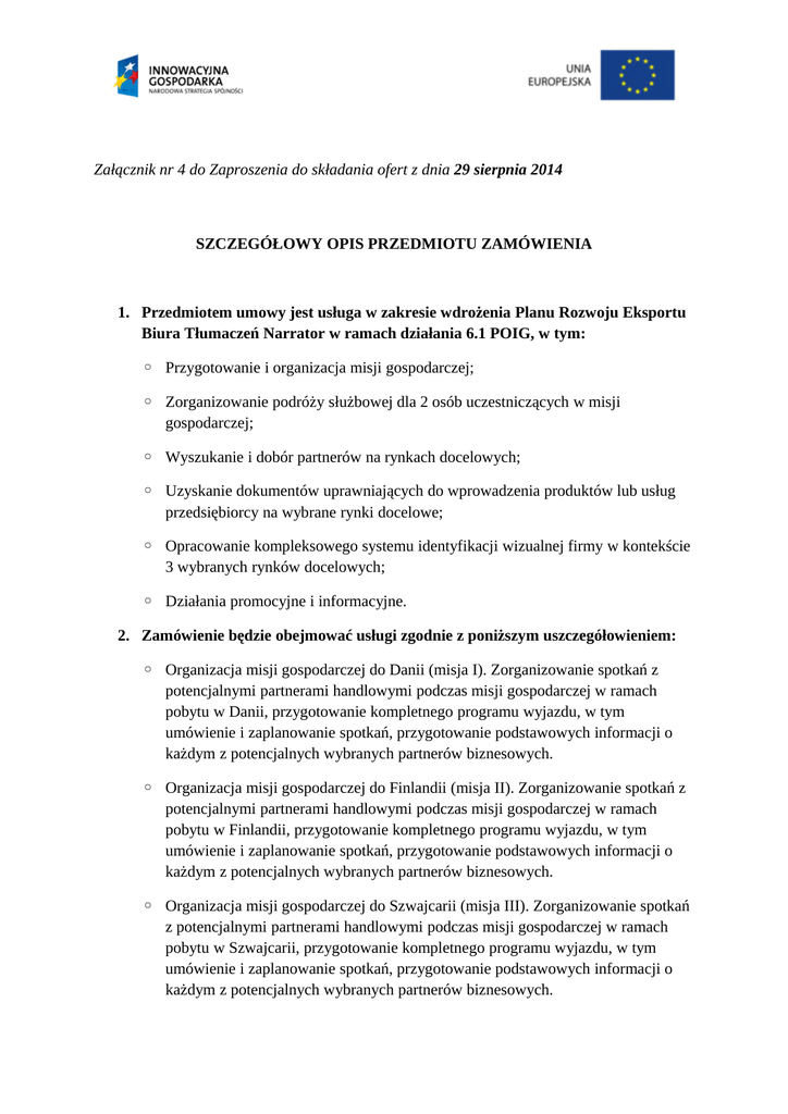Załącznik nr 4 do Zaproszenia do składania ofert z dnia 29 sierpnia 2014 SZCZEGÓŁOWY OPIS PRZEDMIOTU ZAMÓWIENIA 1. Przedmiotem umowy jest usługa w zakresie wdrożenia Planu Rozwoju Eksportu Biura Tłumaczeń Narrator w ramach działania 6.1 POIG, w tym: ◦ Przygotowanie i organizacja misji gospodarczej; ◦ Zorganizowanie podróży służbowej dla 2 osób uczestniczących w misji gospodarczej; ◦ Wyszukanie i dobór partnerów na rynkach docelowych; ◦ Uzyskanie dokumentów uprawniających do wprowadzenia produktów lub usług przedsiębiorcy na wybrane rynki docelowe; ◦ Opracowanie kompleksowego systemu identyfikacji wizualnej firmy w kontekście 3 wybranych rynków docelowych; ◦ Działania promocyjne i informacyjne. 2. Zamówienie będzie obejmować usługi zgodnie z poniższym uszczegółowieniem: ◦ Organizacja misji gospodarczej do Danii (misja I). Zorganizowanie spotkań z potencjalnymi partnerami handlowymi podczas misji gospodarczej w ramach pobytu w Danii, przygotowanie kompletnego programu wyjazdu, w tym umówienie i zaplanowanie spotkań, przygotowanie podstawowych informacji o każdym z potencjalnych wybranych partnerów biznesowych. ◦ Organizacja misji gospodarczej do Finlandii (misja II). Zorganizowanie spotkań z potencjalnymi partnerami handlowymi podczas misji gospodarczej w ramach pobytu w Finlandii, przygotowanie kompletnego programu wyjazdu, w tym umówienie i zaplanowanie spotkań, przygotowanie podstawowych informacji o każdym z potencjalnych wybranych partnerów biznesowych. ◦ Organizacja misji gospodarczej do Szwajcarii (misja III). Zorganizowanie spotkań z potencjalnymi partnerami handlowymi podczas misji gospodarczej w ramach pobytu w Szwajcarii, przygotowanie kompletnego programu wyjazdu, w tym umówienie i zaplanowanie spotkań, przygotowanie podstawowych informacji o każdym z potencjalnych wybranych partnerów biznesowych. ◦ Organizacja misji gospodarczej do Danii (misja IV). Zorganizowanie spotkań z potencjalnymi partnerami handlowymi podczas misji gospodarczej w ramach pobytu w Danii, przygotowanie kompletnego programu wyjazdu, w tym umówienie i zaplanowanie spotkań, przygotowanie podstawowych informacji o każdym z potencjalnych wybranych partnerów biznesowych. ◦ Organizacja misji gospodarczej do Finlandii (misja V). Zorganizowanie spotkań z potencjalnymi partnerami handlowymi podczas misji gospodarczej w ramach pobytu w Finlandii, przygotowanie kompletnego programu wyjazdu, w tym umówienie i zaplanowanie spotkań, przygotowanie podstawowych informacji o każdym z potencjalnych wybranych partnerów biznesowych. ◦ Organizacja misji gospodarczej do Szwajcarii (misja VI). Zorganizowanie spotkań z potencjalnymi partnerami handlowymi podczas misji gospodarczej w ramach pobytu w Szwajcarii, przygotowanie kompletnego programu wyjazdu, w tym umówienie i zaplanowanie spotkań, przygotowanie podstawowych informacji o każdym z potencjalnych wybranych partnerów biznesowych. ◦ Zorganizowanie podróży służbowej: przelotów i 3 noclegów dla 2 osób uczestniczących w misji gospodarczej zorganizowanej w Danii wraz z ubezpieczeniem (misja nr I). ◦ Zorganizowanie podróży służbowej: przelotów i 3 noclegów dla 2 osób uczestniczących w misji gospodarczej zorganizowanej w Finlandii wraz z ubezpieczeniem (misja nr II). ◦ Zorganizowanie podróży służbowej: przelotów i 3 noclegów dla 2 osób uczestniczących w misji gospodarczej zorganizowanej w Szwajcarii wraz z ubezpieczeniem (misja nr III). ◦ Zorganizowanie podróży służbowej: przelotów i 3 noclegów dla 2 osób uczestniczących w misji gospodarczej zorganizowanej w Danii wraz z ubezpieczeniem (misja nr VI). ◦ Zorganizowanie podróży służbowej: przelotów i 3 noclegów dla 2 osób uczestniczących w misji gospodarczej zorganizowanej w Finlandii wraz z ubezpieczeniem (misja nr V). ◦ Zorganizowanie podróży służbowej: przelotów i 3 noclegów dla 2 osób uczestniczących w misji gospodarczej zorganizowanej w Szwajcarii wraz z ubezpieczeniem (misja nr VI). ◦ Wyszukanie i dobór partnerów na rynkach docelowych – bazy danych, ◦ Zakup usług doradczych obejmujących przygotowania firmy do uzyskania certyfikatu za zgodność z normą ISO 9001 oraz PN-EN 15038. Wydatek oszacowano na podstawie rozpoznania ryku i wstępnej oferty firmy wdrażającej systemy zarządzania jakością. ◦ Konsultacje prawne związane ze specyficznymi aspektami świadczenia usług tłumaczeniowych na 3 wybranych rynkach docelowych; ◦ Wystawienie i wydanie certyfikatu ISO 9001 i PN-EN 15038. ◦ Opracowanie kompleksowego systemu identyfikacji wizualnej firmy w kontekście 3 wybranych rynków docelowych (logo, wizytówki,ulotki, foldery, teczki, nadruki na różnych materiałach promocyjnych, strona internetowa, szablon prezentacji). ◦ Tłumaczenie tekstów na stronę i do katalogów na język angielski ◦ Tłumaczenie tekstów na stronę i do katalogów na język francuski ◦ Tłumaczenie tekstów na stronę i do katalogów na język niemiecki ◦ Tłumaczenie tekstów na stronę i do katalogów na język duński ◦ Tłumaczenie tekstów na stronę i do katalogów na język fiński ◦ Wydrukowanie teczek ofertowych ◦ Wydrukowanie wizytówek firmowych ◦ Wykonanie folderów reklamowych w 5 wersjach językowych ◦ Wykonanie strony internetowej według projektu graficznego