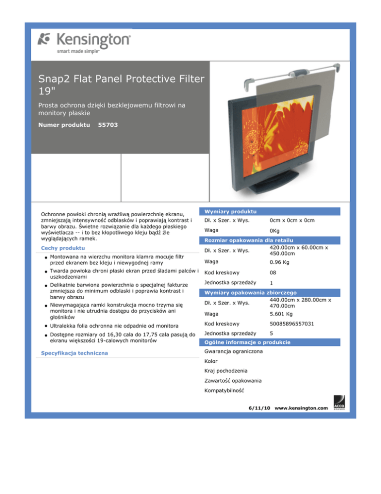 Snap2 Flat Panel Protective Filter 19" Prosta ochrona dzięki bezklejowemu filtrowi na monitory płaskie Numer produktu 55703 Ochronne powłoki chronią wrażliwą powierzchnię ekranu, zmniejszają intensywność odblasków i poprawiają kontrast i barwy obrazu. Świetne rozwiązanie dla każdego płaskiego wyświetlacza -- i to bez kłopotliwego kleju bądź źle wyglądających ramek. Cechy produktu • Montowana na wierzchu monitora klamra mocuje filtr przed ekranem bez kleju i niewygodnej ramy • Twarda powłoka chroni płaski ekran przed śladami palców i uszkodzeniami • Delikatnie barwiona powierzchnia o specjalnej fakturze zmniejsza do minimum odblaski i poprawia kontrast i barwy obrazu • Niewymagająca ramki konstrukcja mocno trzyma się monitora i nie utrudnia dostępu do przycisków ani głośników Wymiary produktu Dł. x Szer. x Wys. 0cm x 0cm x 0cm Waga 0Kg Rozmiar opakowania dla retailu 420.00cm x 60.00cm x Dł. x Szer. x Wys. 450.00cm Waga 0.96 Kg Kod kreskowy 08 Jednostka sprzedaży 1 Wymiary opakowania zbiorczego 440.00cm x 280.00cm x Dł. x Szer. x Wys. 470.00cm Waga 5.601 Kg • Ultralekka folia ochronna nie odpadnie od monitora Kod kreskowy 50085896557031 • Dostępne rozmiary od 16,30 cala do 17,75 cala pasują do ekranu większości 19-calowych monitorów Jednostka sprzedaży 5 Specyfikacja techniczna Ogólne informacje o produkcie Gwarancja ograniczona Kolor Kraj pochodzenia Zawartość opakowania Kompatybilność 6/11/10 www.kensington.com