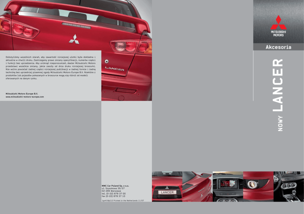 Akcesoria LANCER Dołożyliśmy wszelkich starań, aby zawartość niniejszej ulotki była dokładna i aktualna w chwili druku. Zastrzegamy prawo zmiany specyfikacji, numerów części i funkcji bez uprzedzenia. Aby uniknąć nieporozumień, dealer Mitsubishi Motors przedstawi wszelkie zmiany, jakie zaszły od dnia druku niniejszej broszurki. Nie wolno powielać żadnej części niniejszej publikacji w żadnej formie i żadną techniką bez uprzedniej pisemnej zgody Mitsubishi Motors Europe B.V. Niektóre z produktów lub pojazdów pokazanych w broszurce mogą się różnić od modeli oferowanych na danym rynku. NOWY Mitsubishi Motors Europe B.V. www.mitsubishi-motors-europe.com MMC Car Poland Sp. z o.o. ul. Szyszkowa 35/37 02-285 Warszawa tel. (0-22) 878 37 00 fax (0-22) 878 37 10 1gs418pl12 Printed in the Netherlands 11/07 WYRÓŻNIJ SIĘ! Po co zawracać sobie głowę akcesoriami, możesz zapytać. Wystarczy umieścić w projekcie samochodu wszystko, co tylko przychodzi do głowy i proszę, oto samochód doskonały. Jednak jednym z powodów, dla których korzystamy z opcji i akcesoriów jest to, że Twoja definicja ideału prawdopodobnie różni się od naszej. Kolejnym powodem jest to, że samochód odzwierciedla indywidualny styl, gust oraz charakter swojego właściciela. Wszyscy się różnimy i lubimy jak inni nas w ten sposób postrzegają. Dlatego, jako Mitsubishi Motors, zbudowaliśmy Lancera korzystając z wszystkich najnowszych technologii w dziedzinie motoryzacji, jako pojazd, który nie tylko spełnia, ale i przekracza wymagania stawiane współczesnym samochodom. Jednocześnie, nasz Lancer Tobie właśnie pozwala określić doskonałość. Szeroki wybór opcji i akcesoriów przedstawionych w tej broszurze pozwoli Ci tak dopasować Twojego nowego Lancera, aby jak najlepiej odpowiadał on Twoim potrzebom. Stylizacja zewnętrzna 4 - 11 Stylizacja wnętrza 12 - 13 Radioodtwarzacze, nawigacja 14 - 15 Komfort 16 - 17 Bezpieczeństwo 18 - 21 Transport 22 - 24 Towary handlowe i prezenty 25 - 26 Wykaz numerów katalogowych 27 Lancer (w tle) ma zamontowany spojler zderzaka przedniego, czarną atrapę górną, czarną folię zderzaka, aluminiowe ramki lamp przeciwmgielnych, listwy progowe z czarną folią, osłony lusterek typ „Carbon“, dekoracyjną folię na słupki środkowe, duży spojler tylny typu sportowego oraz felgi aluminiowe 18“. STYLIZACJA ZEWNĘTRZNA Lancer (na pierwszym planie) ma zamontowany spojler zderzaka przedniego, listwy progowe ze srebrną folią, spojler zderzaka tylnego, spojler tylny typu „Elegant“, chromowane nakładki klamek, chromowane nakładki lusterek oraz felgi aluminiowe 16“. LANCERA NIE SPOSÓB NIE ZAUWAŻYĆ Lancer to auto wyraźnie widoczne zarówno na ulicach, jak i na drogach. Muskularne nadwozie i zdecydowane linie przykuwają uwagę od Londynu aż po Tokio. Aby postawić kropkę nad „i”, projektanci Mitsubishi przygotowali pełen zestaw opcji i dodatków, dzięki którym wygląd samochodu można dopasować do własnego gustu. Wszystkie opcje i dodatki opracowano specjalnie dla modelu Lancer, co gwarantuje doskonałą harmonię oraz bezkompromisowo wysoki poziom bezpieczeństwa. 4 4 5 5 ^ Atrapa sportowa, górna Ramki lamp ≥ przeciwmgielnych Czarna siatka z czarną, matową ramką. 7450A095 ^ Spojler zderzaka tylnego Dostarczany w wersji do lakierowania, może być lakierowany w kolorze nadwozia. Może być montowany razem z hakiem holowniczym. MZ314035 Wygląd aluminium. MZ314061 Folia zderzaka przedniego Tylny spojler Duży, typ sportowy. Patrz strona 27. Czarna, matowa folia. MZ314054 STYLIZACJA ZEWNĘTRZNA Końcówka rury wydechowej Spojler zderzaka przedniego MZ314052 Dostępny we wszystkich kolorach nadwozia. Szukaj w wykazie numerów katalogowych. Ramki lamp przeciwmgielnych MZ314061. ^ Osłony lusterek zewnętrznych ^ Osłony lusterek zewnętrznych ^ Osłony lusterek zewnętrznych Wzór “Carbon”. Naklejane. MZ314059 Wygląd aluminium. Naklejane. MZ314060 Chromowane. Zamienne z osłonami oryginalnymi. MZ569719EX ^ Tylny spojler Duży, typ sportowy. Dostępny we wszystkich kolorach nadwozia. Szukaj w wykazie numerów katalogowych. Folia spojlera tylnego Czarna matowa, do dużego spojlera typu sportowego. MZ314053 6 7 ≤ Lancer pokazany na zdjęciu ma zamontowany tylny spojler oraz spojler zderzaka tylnego, końcówkę rury wydechowej, progi boczne z czarną folią, dekoracyjną folię na słupki środkowe oraz felgi aluminiowe 16”. Lancer pokazany na ≥ zdjęciu ma zamontowany tylny spojler typu „Elegant”, listwę pokrywy bagażnika, spojler zderzaka tylnego, końcówkę rury wydechowej, progi boczne ze srebrną folią, chromowane nakładki klamek drzwi oraz felgi aluminiowe 16”. STYLIZACJA ZEWNĘTRZNA ^ Tylny spojler ^ Tylny spojler ≤ Tylny spojler Duży, typ sportowy. Dostępny we wszystkich kolorach nadwozia. Szukaj w wykazie numerów katalogowych. Typ “Sportive”. Dostarczany w wersji do lakierowania, może być lakierowany w kolorze nadwozia. MR936196 Typ “Elegant”. Dostępny we wszystkich kolorach nadwozia. Szukaj w wykazie numerów katalogowych. ≤ Końcówka rury wydechowej Listwa pokrywy bagażnika ≥ Stal nierdzewna. Do wersji 1.5L Do wersji 1.8 & 2.0L Do wersji 2.0 DI-D MZ314027 MZ314028 MZ314052 Wygląd aluminium. MZ314058 Chromowana (bez zdjęcia). MZ314104 8 9 ^ Tylny spojler Listwy progowe Typ “Sportive”. MR936196 Dostępne we wszystkich kolorach nadwozia. Szukaj w wykazie numerów katalogowych. Spojler zderzaka tylnego MZ314035 Folia ochronna listew progowych Końcówka rury wydechowej Matowa czarna. MZ314055 Folia dekoracyjna na słupki środkowe Spojler zderzaka przedniego ^ Spojler zderzaka przedniego MZ314057 Patrz strona 27. Patrz strona 27. Osłony lusterek zewnętrznych Ramki lamp przeciwmgielnych Wzór “Carbon”. MZ314059 MZ314061 Listwy progowe Dostępne we wszystkich kolorach nadwozia. Szukaj w wykazie numerów katalogowych. Folia ochronna listew progowych Nakładk