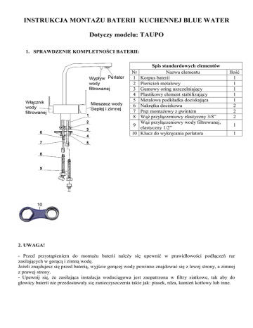 INSTRUKCJA MONTAśU BATERII KUCHENNEJ BLUE WATER Dotyczy modelu: TAUPO 1. SPRAWDZENIE KOMPLETNOŚCI BATERII: Nr 1 2 3 4 5 6 7 8 9 10 Spis standardowych elementów Nazwa elementu Korpus baterii Pierścień metalowy Gumowy oring uszczelniający Plastikowy element stabilizujący Metalowa podkładka dociskająca Nakrętka dociskowa Pręt montaŜowy z gwintem WąŜ przyłączeniowy elastyczny 3/8” WąŜ przyłączeniowy wody filtrowanej, elastyczny 1/2” Klucz do wykręcania perlatora Ilość 1 1 1 1 1 2 2 2 1 1 2. UWAGA! - Przed przystąpieniem do montaŜu baterii naleŜy się upewnić w prawidłowości podłączeń rur zasilających w gorącą i zimną wodę. JeŜeli znajdujesz się przed baterią, wyjście gorącej wody powinno znajdować się z lewej strony, a zimnej z prawej strony. - Upewnij się, Ŝe zasilająca instalacja wodociągowa jest zaopatrzona w filtry siatkowe, tak aby do głowicy baterii nie przedostawały się zanieczyszczenia takie jak: piasek, rdza, kamień kotłowy lub inne. 3. INSTRUKCJA MONTAśU BATERII: - Przepłukać instalację wodociągową. - Wkręcić pręty montaŜowe z gwintem (7) do korpusu baterii (1) i wykręcić nakrętki dociskowe (6). - W pierścień metalowy (2) włoŜyć gumowy oring uszczelniający (3). - Pierścień metalowy (2) z gumowym oringiem (3) załoŜyć na korpus baterii (1). - Wkręcić ręką węŜe przyłączeniowe (8 i 9) w przewidziane dla nich otwory. - Baterię włoŜyć do otworu w zlewozmywaku. - Pod zlewozmywakiem nałoŜyć plastikowy element stabilizujący (4). - Na wystające końcówki prętów montaŜowych (7) załoŜyć metalową podkładkę dociskającą (5) i przykręcić baterię do zlewozmywaka przy pomocy nakrętek dociskowych (6). Czynność tą najlepiej dokonać za pomocą klucza nasadowego, aŜ bateria będzie mocno przymocowana do zlewozmywaka. - Podłączyć węŜe przyłączeniowe elastyczne (8) do zaworów kątowych z filtrami siatkowymi (które nie znajdują się w komplecie z baterią) tak, aby nie były załamane (naleŜy zwrócić uwagę Ŝeby w węŜach były uszczelki gumowe, które są w komplecie z węŜami). - Do instalacji filtrów podłączyć wąŜ przyłączeniowy wody filtrowanej (9) za pomocą nypla (w zaleŜności od typu filtra odpowiedni nypel naleŜy dokupić). - Za pomocą klucza (10) wykręcić perlator i dobrze przepłukać baterię. - Za pomocą klucza (10) wkręcić perlator. Klient zobowiązany jest do regularnego odkręcania i czyszczenia perlatorów (dysz mieszających) z kamienia, rdzy i innych ciał obcych. Przy duŜym zanieczyszczeniu perlatora naleŜy wymienić go na nowy. Ciśnienie robocze wody: do 6 atmosfer – przy wyŜszym ciśnieniu zastosować reduktor ciśnienia. Temperatura wody: 4°C - 90°C. UWAGA! Niniejsza instrukcja jest tylko informacyjna, montaŜu baterii musi dokonać osoba wykwalifikowana. Zastrzegamy sobie prawo do zmian technicznych. Prosimy zapoznać się z treścią karty gwarancyjnej.