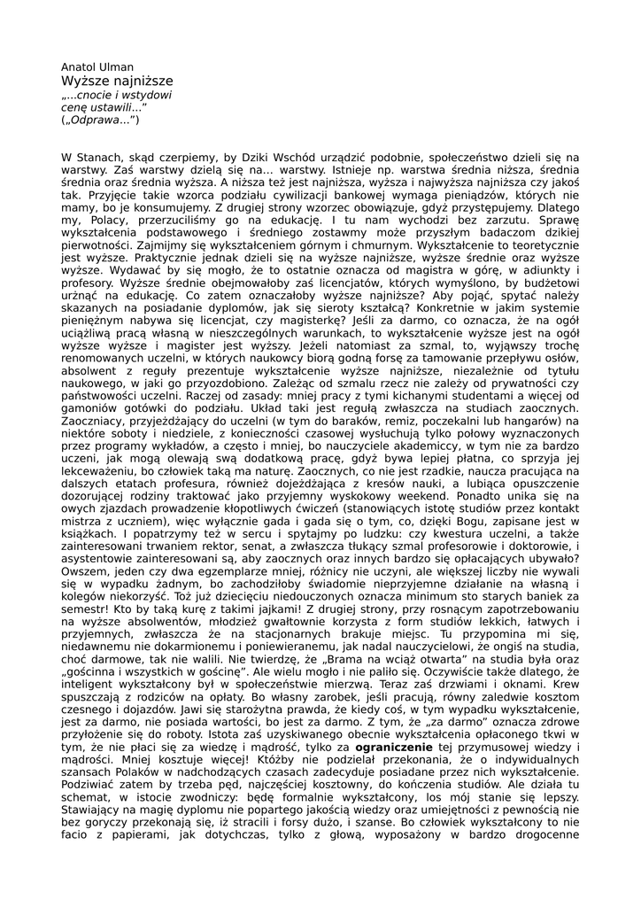Anatol Ulman Wyższe najniższe „...cnocie i wstydowi cenę ustawili...” („Odprawa...”) W Stanach, skąd czerpiemy, by Dziki Wschód urządzić podobnie, społeczeństwo dzieli się na warstwy. Zaś warstwy dzielą się na… warstwy. Istnieje np. warstwa średnia niższa, średnia średnia oraz średnia wyższa. A niższa też jest najniższa, wyższa i najwyższa najniższa czy jakoś tak. Przyjęcie takie wzorca podziału cywilizacji bankowej wymaga pieniądzów, których nie mamy, bo je konsumujemy. Z drugiej strony wzorzec obowiązuje, gdyż przystępujemy. Dlatego my, Polacy, przerzuciliśmy go na edukację. I tu nam wychodzi bez zarzutu. Sprawę wykształcenia podstawowego i średniego zostawmy może przyszłym badaczom dzikiej pierwotności. Zajmijmy się wykształceniem górnym i chmurnym. Wykształcenie to teoretycznie jest wyższe. Praktycznie jednak dzieli się na wyższe najniższe, wyższe średnie oraz wyższe wyższe. Wydawać by się mogło, że to ostatnie oznacza od magistra w górę, w adiunkty i profesory. Wyższe średnie obejmowałoby zaś licencjatów, których wymyślono, by budżetowi urżnąć na edukację. Co zatem oznaczałoby wyższe najniższe? Aby pojąć, spytać należy skazanych na posiadanie dyplomów, jak się sieroty kształcą? Konkretnie w jakim systemie pieniężnym nabywa się licencjat, czy magisterkę? Jeśli za darmo, co oznacza, że na ogół uciążliwą pracą własną w nieszczególnych warunkach, to wykształcenie wyższe jest na ogół wyższe wyższe i magister jest wyższy. Jeżeli natomiast za szmal, to, wyjąwszy trochę renomowanych uczelni, w których naukowcy biorą godną forsę za tamowanie przepływu osłów, absolwent z reguły prezentuje wykształcenie wyższe najniższe, niezależnie od tytułu naukowego, w jaki go przyozdobiono. Zależąc od szmalu rzecz nie zależy od prywatności czy państwowości uczelni. Raczej od zasady: mniej pracy z tymi kichanymi studentami a więcej od gamoniów gotówki do podziału. Układ taki jest regułą zwłaszcza na studiach zaocznych. Zaoczniacy, przyjeżdżający do uczelni (w tym do baraków, remiz, poczekalni lub hangarów) na niektóre soboty i niedziele, z konieczności czasowej wysłuchują tylko połowy wyznaczonych przez programy wykładów, a często i mniej, bo nauczyciele akademiccy, w tym nie za bardzo uczeni, jak mogą olewają swą dodatkową pracę, gdyż bywa lepiej płatna, co sprzyja jej lekceważeniu, bo człowiek taką ma naturę. Zaocznych, co nie jest rzadkie, naucza pracująca na dalszych etatach profesura, również dojeżdżająca z kresów nauki, a lubiąca opuszczenie dozorującej rodziny traktować jako przyjemny wyskokowy weekend. Ponadto unika się na owych zjazdach prowadzenie kłopotliwych ćwiczeń (stanowiących istotę studiów przez kontakt mistrza z uczniem), więc wyłącznie gada i gada się o tym, co, dzięki Bogu, zapisane jest w książkach. I popatrzymy też w sercu i spytajmy po ludzku: czy kwestura uczelni, a także zainteresowani trwaniem rektor, senat, a zwłaszcza tłukący szmal profesorowie i doktorowie, i asystentowie zainteresowani są, aby zaocznych oraz innych bardzo się opłacających ubywało? Owszem, jeden czy dwa egzemplarze mniej, różnicy nie uczyni, ale większej liczby nie wywali się w wypadku żadnym, bo zachodziłoby świadomie nieprzyjemne działanie na własną i kolegów niekorzyść. Toż już dziecięciu niedouczonych oznacza minimum sto starych baniek za semestr! Kto by taką kurę z takimi jajkami! Z drugiej strony, przy rosnącym zapotrzebowaniu na wyższe absolwentów, młodzież gwałtownie korzysta z form studiów lekkich, łatwych i przyjemnych, zwłaszcza że na stacjonarnych brakuje miejsc. Tu przypomina mi się, niedawnemu nie dokarmionemu i poniewieranemu, jak nadal nauczycielowi, że ongiś na studia, choć darmowe, tak nie walili. Nie twierdzę, że „Brama na wciąż otwarta” na studia była oraz „gościnna i wszystkich w gościnę”. Ale wielu mogło i nie paliło się. Oczywiście także dlatego, że inteligent wykształcony był w społeczeństwie mierzwą. Teraz zaś drzwiami i oknami. Krew spuszczają z rodziców na opłaty. Bo własny zarobek, jeśli pracują, równy zaledwie kosztom czesnego i dojazdów. Jawi się starożytna prawda, że kiedy coś, w tym wypadku wykształcenie, jest za darmo, nie posiada wartości, bo jest za darmo. Z tym, że „za darmo” oznacza zdrowe przyłożenie się do roboty. Istota zaś uzyskiwanego obecnie wykształcenia opłaconego tkwi w tym, że nie płaci się za wiedzę i mądrość, tylko za ograniczenie tej przymusowej wiedzy i mądrości. Mniej kosztuje więcej! Któżby nie podzielał przekonania, że o indywidualnych szansach Polaków w nadchodzących czasach zadecyduje posiadane przez nich wykształcenie. Podziwiać zatem by trzeba pęd, najczęściej kosztowny, do kończenia studiów. Ale działa tu schemat, w istocie zwodniczy: będę formalnie wykształcony, los mój stanie się lepszy. Stawiający na magię dyplomu nie popartego jakością wiedzy oraz umiejętności z pewnością nie bez goryczy przekonają się, iż stracili i forsy dużo, i szanse. Bo człowiek wykształcony to nie facio z papierami, jak dotychczas, tylko z głową, wyposażony w bardzo drogocenne właściwości, bo pracowity, zdolny do samodzielnego myślenia, twórczy, odpowiedzialny. A takich się w Polsce mało kształci, na studiach zaś pieniężnych w ogóle, bo tam przydzielają wyższe najniższe. Z tym wyższym najniższym wykształceniem to jest tak, jakby zidiociały od wykonywania przez całe życie rozkazów jakiś kapral ustawił armię w dwuszeregu i kazał równać do najniższego. Zatem nie tylko wojak średniego wzrostu ale drągal grenadier musiałby się skurczyć, bo życzenie przełożonego rzecz święta. Ten kapral w edukacji nazywa się szmal. Był taki niejaki rewolucjonista, zresztą kumpel Żeromskiego (pierwowzór Andrzeja Radka), który „