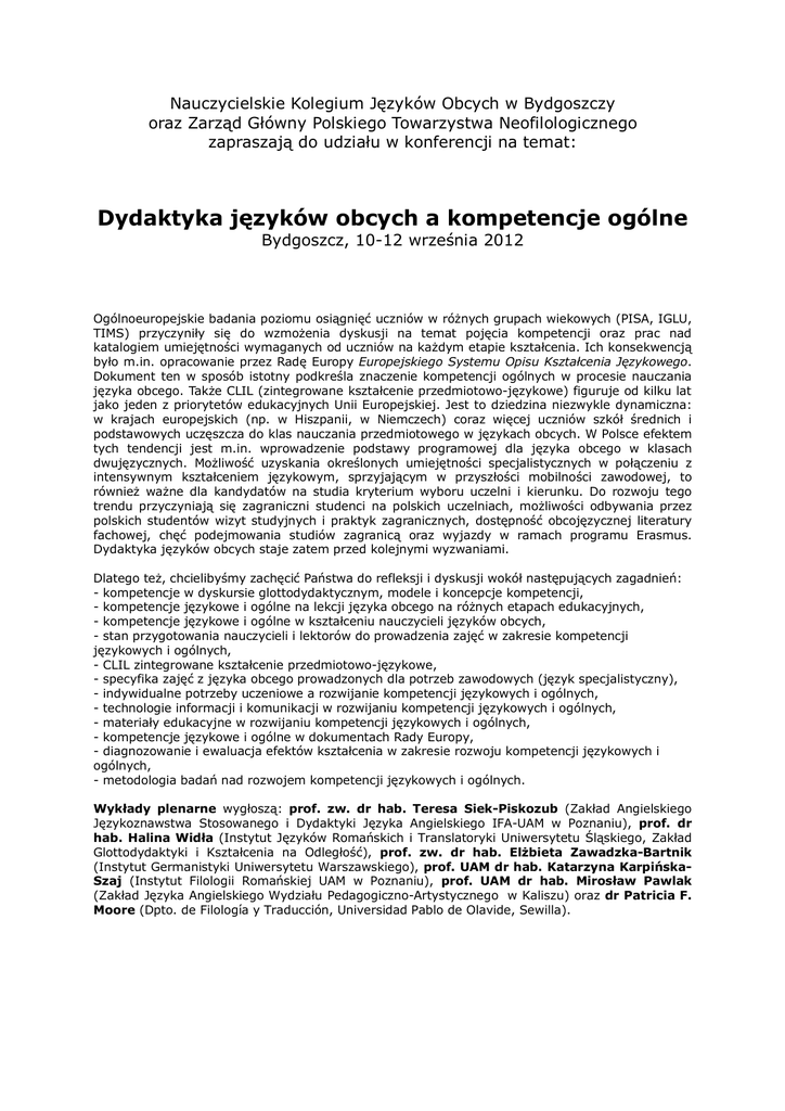 Nauczycielskie Kolegium Języków Obcych w Bydgoszczy oraz Zarząd Główny Polskiego Towarzystwa Neofilologicznego zapraszają do udziału w konferencji na temat: Dydaktyka języków obcych a kompetencje ogólne Bydgoszcz, 10-12 września 2012 Ogólnoeuropejskie badania poziomu osiągnięć uczniów w różnych grupach wiekowych (PISA, IGLU, TIMS) przyczyniły się do wzmożenia dyskusji na temat pojęcia kompetencji oraz prac nad katalogiem umiejętności wymaganych od uczniów na każdym etapie kształcenia. Ich konsekwencją było m.in. opracowanie przez Radę Europy Europejskiego Systemu Opisu Kształcenia Językowego. Dokument ten w sposób istotny podkreśla znaczenie kompetencji ogólnych w procesie nauczania języka obcego. Także CLIL (zintegrowane kształcenie przedmiotowo-językowe) figuruje od kilku lat jako jeden z priorytetów edukacyjnych Unii Europejskiej. Jest to dziedzina niezwykle dynamiczna: w krajach europejskich (np. w Hiszpanii, w Niemczech) coraz więcej uczniów szkół średnich i podstawowych uczęszcza do klas nauczania przedmiotowego w językach obcych. W Polsce efektem tych tendencji jest m.in. wprowadzenie podstawy programowej dla języka obcego w klasach dwujęzycznych. Możliwość uzyskania określonych umiejętności specjalistycznych w połączeniu z intensywnym kształceniem językowym, sprzyjającym w przyszłości mobilności zawodowej, to również ważne dla kandydatów na studia kryterium wyboru uczelni i kierunku. Do rozwoju tego trendu przyczyniają się zagraniczni studenci na polskich uczelniach, możliwości odbywania przez polskich studentów wizyt studyjnych i praktyk zagranicznych, dostępność obcojęzycznej literatury fachowej, chęć podejmowania studiów zagranicą oraz wyjazdy w ramach programu Erasmus. Dydaktyka języków obcych staje zatem przed kolejnymi wyzwaniami. Dlatego też, chcielibyśmy zachęcić Państwa do refleksji i dyskusji wokół następujących zagadnień: - kompetencje w dyskursie glottodydaktycznym, modele i koncepcje kompetencji, - kompetencje językowe i ogólne na lekcji języka obcego na różnych etapach edukacyjnych, - kompetencje językowe i ogólne w kształceniu nauczycieli języków obcych, - stan przygotowania nauczycieli i lektorów do prowadzenia zajęć w zakresie kompetencji językowych i ogólnych, - CLIL zintegrowane kształcenie przedmiotowo-językowe, - specyfika zajęć z języka obcego prowadzonych dla potrzeb zawodowych (język specjalistyczny), - indywidualne potrzeby uczeniowe a rozwijanie kompetencji językowych i ogólnych, - technologie informacji i komunikacji w rozwijaniu kompetencji językowych i ogólnych, - materiały edukacyjne w rozwijaniu kompetencji językowych i ogólnych, - kompetencje językowe i ogólne w dokumentach Rady Europy, - diagnozowanie i ewaluacja efektów kształcenia w zakresie rozwoju kompetencji językowych i ogólnych, - metodologia badań nad rozwojem kompetencji językowych i ogólnych. Wykłady plenarne wygłoszą: prof. zw. dr hab. Teresa Siek-Piskozub (Zakład Angielskiego Językoznawstwa Stosowanego i Dydaktyki Języka Angielskiego IFA-UAM w Poznaniu), prof. dr hab. Halina Widła (Instytut Języków Romańskich i Translatoryki Uniwersytetu Śląskiego, Zakład Glottodydaktyki i Kształcenia na Odległość), prof. zw. dr hab. Elżbieta Zawadzka-Bartnik (Instytut Germanistyki Uniwersytetu Warszawskiego), prof. UAM dr hab. Katarzyna KarpińskaSzaj (Instytut Filologii Romańskiej UAM w Poznaniu), prof. UAM dr hab. Mirosław Pawlak (Zakład Języka Angielskiego Wydziału Pedagogiczno-Artystycznego w Kaliszu) oraz dr Patricia F. Moore (Dpto. de Filología y Traducción, Universidad Pablo de Olavide, Sewilla). Obok referatów w sekcjach tematycznych (20 minut + 10 minut na dyskusję), dużo uwagi pragniemy poświęcić „dobrej praktyce”, dlatego obradom towarzyszyć będą warsztaty metodyczne dla nauczycieli języków obcych, w ramach których proponujemy doskonalenie umiejętności zawodowych: - dla nauczycieli języka specjalistycznego na uczelniach technicznych, - dla nauczycieli języka obcego w zintegrowanym kształceniu przedmiotowo-językowym. Warsztaty poprowadzą: dr hab. Magdalena Sowa (KUL) i dr Liliana Szczuka-Dorna (UAM) – język specjalistyczny oraz prof. zw. dr hab. Teresa Siek-Piskozub (IFA UAM), mgr Renata Majewska (NKJO Bydgoszcz) i mgr Elżbieta Świerczyńska (Centrum Rozwoju i Edukacji dr Beaty Owczarskiej, VIII LO w Łodzi) – zintegrowane kształcenie przedmiotowo-językowe. Szczegółowe informacje ukażą się wkrótce w specjalnym komunikacie dostępnym na stronie NKJO w Bydgoszczy: www.nkjo.bydgoszcz.pl . Zgodnie z ideą PTN wspólnego rozwijania myśli naukowej oraz doświadczenia dydaktycznego, zarówno wykłady plenarne, sekcje tematyczne, jak i warsztaty metodyczne prowadzone będą w języku polskim (z wyjątkiem wykładu plenarnego dr Patricii F. Moore). Po zakończeniu konferencji planujemy publikację wybranych referatów w recenzowanym tomie monograficznym oraz w kolejnym numerze czasopisma Neofilolog. Konferencja odbędzie się w dniach 10-12 września 2012 r.: w Auditorium Novum Uniwersytetu Technologiczno-Przyrodniczego w Bydgoszczy przy ul. Kaliskiego 7 (10 września 2012 r.) oraz w budynku Nauczycielskiego Kolegium Języków Obcych w Bydgoszczy przy ul. Dworcowej 80 (11-12 września 2012 r.). Opłata konferencyjna wynosi 380 zł (dla Członków PTN 320 zł) i obejmuje wyżywienie oraz koszty organizacyjne i wydawnicze. Prosimy o dokonywanie wpłat na konto Nauczycielskiego Kolegium Języków Obcych w Bydgoszczy, ul. Dworcowa 80, 85-010 Bydgoszcz: 66 1090 1072 0000 0001 1532 6791, z dopiskiem: konferencja PTN 2012. Zapraszamy wszystkich P.T. Członków PTN do licznego udziału w konferencji. Proponujemy Państwu noclegi w hotelu „BRDA” przy ul. Dworcowej 94, www.hotelbrda.com.pl. Specjalna oferta cenowa dla Uczestników konferencji przedstawia się następująco: - pokoje 1-osobowe: Business - 200 zł/1dob