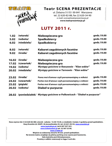Teatr SCENA PREZENTACJE ul. Żelazna 51/53 00-841 Warszawa tel. 22 620-82-88, fax 22 620-34-90 e-mail: [email protected] www.teatrprezentacje.pl LUTY 2011 r. 1.02 /wtorek/ 5.02 /sobota/ 6.02 /niedziela/ Niebezpieczna gra Spadkobiercy Spadkobiercy godz.19.00 godz.19.00 godz.19.00 8.02 /wtorek/ 9.02 /środa/ Kabaret zagubionych facetów Kabaret zagubionych facetów godz.19.00 godz.19.00 godz.19.00 godz.19.00 16.02 17.02 19.02 20.02 /środa/ /czwartek/ /sobota/ /niedziela/ Niebezpieczna gra Niebezpieczna gra 23.02 24.02 25.02 26.02 /środa/ /czwartek/ /piątek/ /sobota/ Parez moi d'amour czyli porozmawiajmy o miłości Występy gościnne w Rzeszowie - "Klan wdów" Występy gościnne w Tarnowie - "Klan wdów" Parlez moi d'amour czyli porozmawiajmy o miłości Parlez moi d'amour czyli porozmawiajmy o miłości Diabeł w purpurze godz.19.00 godz.19.00 godz.19.00 godz.19.00 28.02 /poniedziałek/ Występy gościnne w Polkowicach - "Diabeł w purpurze" godz.19.00 Kasa czynna (tel. 0 22 620-82-88): wtorek –sobota: 12.30-19.30, w niedziele i święta: 3 godziny przed spektaklem. Kasy Eventim (d. ZASP) Al.Jerozolimskie 25, tel. 22 621-94-54, www.eventim.pl www.teatralium.pl, tel.0 507 357 357, www.ticketonline.pl tel. 22 567 22 00, www.e-bilet.pl Wejście na widownię otwarte 30 min. przed spektaklem. Na terenie teatru znajduje się płatny parking oraz czynna jest kawiarnia. Sala teatralna jest klimatyzowana. Prosimy o odbiór rezerwacji w ciągu 3-ech dni.