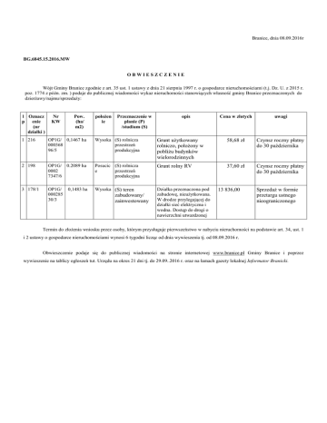 Branice, dnia 08.09.2016r BG.6845.15.2016.MW OBWIESZCZENIE Wójt Gminy Branice zgodnie z art. 35 ust. 1 ustawy z dnia 21 sierpnia 1997 r. o gospodarce nieruchomościami (t.j. Dz. U. z 2015 r. poz. 1774 z późn. zm. ) podaje do publicznej wiadomości wykaz nieruchomości stanowiących własność gminy Branice przeznaczonych do dzierżawy/najmu/sprzedaży: l Oznacz p enie (nr działki ) Nr KW Pow. (ha/ m2) położen ie Przeznaczenie w planie (P) /studium (S) opis Cena w złotych uwagi 1 216 OP1G/ 0,1467 ha 000368 96/5 Wysoka (S) rolnicza przestrzeń produkcyjna Grunt użytkowany rolniczo, położony w pobliżu budynków wielorodzinnych 58,68 zł Czynsz roczny płatny do 30 października 2 198 OP1G/ 0.2089 ha 0002 7347/6 Posucic (S) rolnicza e przestrzeń produkcyjna Grunt rolny RV 37,60 zł Czynsz roczny płatny do 30 października 3 178/1 OP1G/ 000285 30/3 Wysoka (S) teren Działka przeznaczona pod zabudowę, nieużytkowana. W drodze przylegającej do działki sieć elektryczna i wodna. Dostęp do drogi o nawierzchni utwardzonej 0,1483 ha zabudowany/ zainwestowany 13 836,00 Sprzedaż w formie przetargu ustnego nieograniczonego Termin do złożenia wniosku przez osoby, którym przysługuje pierwszeństwo w nabyciu nieruchomości na podstawie art. 34, ust. 1 i 2 ustawy o gospodarce nieruchomościami wynosi 6 tygodni licząc od dnia wywieszenia tj. od 08.09.2016 r. Obwieszczenie podaje się do publicznej wiadomości na stronie internetowej www.branice.pl Gminy Branice i poprzez wywieszenie na tablicy ogłoszeń tut. Urzędu na okres 21 dni tj. do 29.09..2016 r. oraz na łamach gazety lokalnej Informator Branicki.