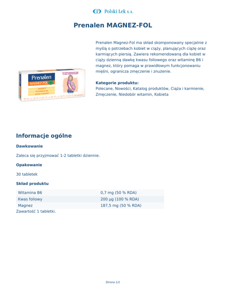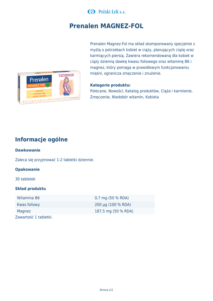 Prenalen MAGNEZ-FOL Prenalen Magnez-Fol ma skład skomponowany specjalnie z myślą o potrzebach kobiet w ciąży, planujących ciążę oraz karmiących piersią. Zawiera rekomendowaną dla kobiet w ciąży dzienną dawkę kwasu foliowego oraz witaminę B6 i magnez, który pomaga w prawidłowym funkcjonowaniu mięśni, ogranicza zmęczenie i znużenie. Kategorie produktu: Polecane, Nowości, Katalog produktów, Ciąża i karmienie, Zmęczenie, Niedobór witamin, Kobieta Informacje ogólne Dawkowanie Zaleca się przyjmować 1-2 tabletki dziennie. Opakowanie 30 tabletek Skład produktu Witamina B6 0,7 mg (50 % RDA) Kwas foliowy 200 μg (100 % RDA) Magnez 187,5 mg (50 % RDA) Zawartość 1 tabletki. Strona 1/1