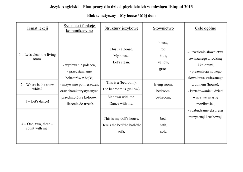 Język Angielski – Plan pracy dla dzieci pięcioletnich w miesiącu listopad 2013 Blok tematyczny – My house / Mój dom Temat lekcji Sytuacje i funkcje komunikacyjne Struktury językowe Słownictwo Cele ogólne house, 1 – Let's clean the living room. - wydawanie poleceń, This is a house. red, My house. blue, Let's clean. yellow, green - przedstawianie 3 – Let's dance! - nazywanie pomieszczeń, oraz charakterystycznych związanego z rodziną i kolorami, - prezentacja nowego słownictwa związanego bohaterów z bajki, 2 – Where is the snow white? - utrwalenie słownictwa This is a (bedroom). The bedroom is (yellow). przedmiotów i kolorów, Sit down with me. - liczenie do trzech. Dance with me. living room, z domem (house), bedroom, - kształtowanie u dzieci bathroom, wiary we własne możliwości, - rozbudzanie ekspresji 4 – One, two, three – count with me! This is my doll's house. bed, Here's the bed/the bath/the bath, sofa. sofa muzycznej i ruchowej, PORADNIK DLA RODZICÓW Zajęcia z języka angielskiego są prowadzone głównie metodą TPR (Total Physical Response) czyli metodą reagowania całym ciałem. Sprawdza się ona szczególnie wśród najmłodszych, gdyż zaspokaja ich naturalną potrzebę ruchu. Wykorzystuje się w niej naturalne naśladowanie ruchowe całym ciałem słownych poleceń nauczyciela, angażując przy tym wszystkie zmysły oraz szereg różnorodnych zabaw ruchowych. ● Początkujący uczniowie często przechodzą przez tzw. fazę ciszy (silent period), podczas którego uczą się rozumieć, rozróżniać elementy języka, słowa, reguły, a nie usiłują czy też nie chcą mówić w języku obcym. Jest to jak najbardziej normalny etap w nauce i my nauczyciele i rodzice, nie powinniśmy zmuszać dzieci, aby mówiły. Na pewno przyjdzie na to czas, a dziecko samo zdecyduje kiedy. ● Dziecko uczy się najpierw słuchać nowego języka, a następnie ruchem ciała reagować – uczy się rozumieć swojego nauczyciela. Najczęściej na początku są to proste polecenia; Wstań! (Stand up!), Usiądź (Sit down!), Podejdź do tablicy (Come to the blackboard) etc. Każde polecenie nauczyciela jest poparte odpowiednim ruchem, gestem. W ten sposób dziecko uczy się najpierw rozumieć język obcy, a dopiero potem porozumiewać w nim! Słowa i zwroty które pojawiły się podczas lekcji hello heleu witaj bye bye bje bje pa pa yes / no jes /neu tak / nie wave łejw pomachaj one łan jeden two tu dwa three fri trzy a house e haus dom colour kale(r) pokoloruj Domowe zabawy z językiem angielskim Powitanie i pożegnanie Poproś dziecko, aby przywitało się ze wszystkimi członkami rodziny, np.: ‘Hello, Mum’,‘Hello, Dad’. Powiedz dziecku, z kim ma się przywitać (podawaj imiona członków rodziny). Zaproponuj dziecku, żeby przywitało się ze swoimi pluszakami. Podobnie przy pożegnaniu, np. 'Bye, bye Mum' Kolory Poproś dziecko, by znalazło w domu i przyniosło ci jak najwięcej przedmiotów danego koloru, np. czerwonego(możesz użyć wyrażenia ‘Find something red’) lub niebieskiego. Akceptuj przedmioty o poproszonym go kolorze, mówiąc ‘yes’ i odrzucaj te w innych kolorach, mówiąc ‘no’. Następnie zamieńcie się rolami – przynieś dziecku kilka przedmiotów w innych kolorach, by musiało je odrzucić. Może także coś pokolorować według twoich instrukcji. Liczenie Można liczyć wszędzie i wszystko: zabawki, kredki, ubranka, palce u rąk itp.. Poproś dziecko aby policzyło coś razem z tobą po angielsku. Teksty piosenek i rymowanek / MY FIRST ENGLISH ADVENTURE 1/ autorzy: Mady Musiol i Magaly Villarroel 1. The living room,the living room Let´s clean the living room 2. Let´s dance! Let´s dance! Stand up and dance! Swish, swish, swish! Oh, Please Swish, swish, swish! Stand up and Swish, swish, swish! dance with me! Let´s clean the living room! No, no No, no! Sit down, sit down Oh, please Sit down, sit down with me