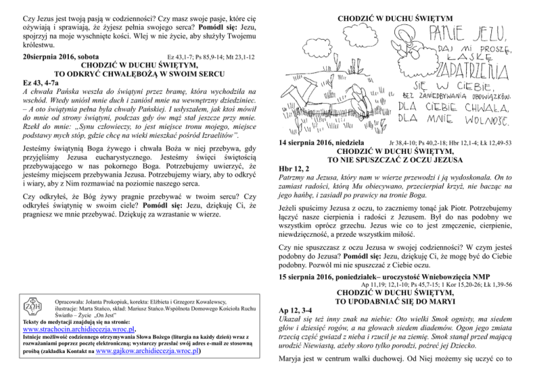 Czy Jezus jest twoją pasją w codzienności? Czy masz swoje pasje, które cię ożywiają i sprawiają, że żyjesz pełnia swojego serca? Pomódl się: Jezu, spojrzyj na moje wyschnięte kości. Wlej w nie życie, aby służyły Twojemu królestwu. CHODZIĆ W DUCHU ŚWIĘTYM 20sierpnia 2016, sobota Ez 43,1-7; Ps 85,9-14; Mt 23,1-12 CHODZIĆ W DUCHU ŚWIĘTYM, TO ODKRYĆ CHWAŁĘBOŻĄ W SWOIM SERCU Ez 43, 4-7a A chwała Pańska weszła do świątyni przez bramę, która wychodziła na wschód. Wtedy uniósł mnie duch i zaniósł mnie na wewnętrzny dziedziniec. – A oto świątynia pełna była chwały Pańskiej. I usłyszałem, jak ktoś mówił do mnie od strony świątyni, podczas gdy ów mąż stał jeszcze przy mnie. Rzekł do mnie: „Synu człowieczy, to jest miejsce tronu mojego, miejsce podstawy mych stóp, gdzie chcę na wieki mieszkać pośród Izraelitów”. Jesteśmy świątynią Boga żywego i chwała Boża w niej przebywa, gdy przyjęliśmy Jezusa eucharystycznego. Jesteśmy święci świętością przebywającego w nas pokornego Boga. Potrzebujemy uwierzyć, że jesteśmy miejscem przebywania Jezusa. Potrzebujemy wiary, aby to odkryć i wiary, aby z Nim rozmawiać na poziomie naszego serca. Czy odkryłeś, że Bóg żywy pragnie przebywać w twoim sercu? Czy odkryłeś świątynię w swoim ciele? Pomódl się: Jezu, dziękuję Ci, że pragniesz we mnie przebywać. Dziękuję za wzrastanie w wierze. 14 sierpnia 2016, niedziela Jr 38,4-10; Ps 40,2-18; Hbr 12,1-4; Łk 12,49-53 CHODZIĆ W DUCHU ŚWIĘTYM, TO NIE SPUSZCZAĆ Z OCZU JEZUSA Hbr 12, 2 Patrzmy na Jezusa, który nam w wierze przewodzi i ją wydoskonala. On to zamiast radości, którą Mu obiecywano, przecierpiał krzyż, nie bacząc na jego hańbę, i zasiadł po prawicy na tronie Boga. Jeżeli spuścimy Jezusa z oczu, to zaczniemy tonąć jak Piotr. Potrzebujemy łączyć nasze cierpienia i radości z Jezusem. Był do nas podobny we wszystkim oprócz grzechu. Jezus wie co to jest zmęczenie, cierpienie, niewdzięczność, a przede wszystkim miłość. Czy nie spuszczasz z oczu Jezusa w swojej codzienności? W czym jesteś podobny do Jezusa? Pomódl się: Jezu, dziękuję Ci, że mogę być do Ciebie podobny. Pozwól mi nie spuszczać z Ciebie oczu. 15 sierpnia 2016, poniedziałek– uroczystość Wniebowzięcia NMP Ap 11,19; 12,1-10; Ps 45,7-15; 1 Kor 15,20-26; Łk 1,39-56 Opracowała: Jolanta Prokopiuk, korekta: Elżbieta i Grzegorz Kowalewscy, ilustracje: Marta Stańco, skład: Mariusz Stańco.Wspólnota Domowego Kościoła Ruchu Światło – Życie „On Jest” Teksty do medytacji znajdują się na stronie: www.strachocin.archidiecezja.wroc.pl. Istnieje możliwość codziennego otrzymywania Słowa Bożego (liturgia na każdy dzień) wraz z rozważaniami poprzez pocztę elektroniczną; wystarczy przesłać swój adres e-mail ze stosowną prośbą (zakładka Kontakt na www.gajkow.archidiecezja.wroc.pl) CHODZIĆ W DUCHU ŚWIĘTYM, TO UPODABNIAĆ SIĘ DO MARYI Ap 12, 3-4 Ukazał się też inny znak na niebie: Oto wielki Smok ognisty, ma siedem głów i dziesięć rogów, a na głowach siedem diademów. Ogon jego zmiata trzecią część gwiazd z nieba i rzucił je na ziemię. Smok stanął przed mającą urodzić Niewiastą, ażeby skoro tylko porodzi, pożreć jej Dziecko. Maryja jest w centrum walki duchowej. Od Niej możemy się uczyć co to znaczyć walka duchowa. Jest w centrum walki, ponieważ niesie Boga żywego innym. Każdy kto niesie Boga jest zagrożeniem dla diabła. To nie tylko walka o ciało, ale przede wszystkim o wieczne zbawienie i przebywanie z Bogiem na wieki. Czy potrafisz walczyć o innych? Czy prosisz Maryję o wsparcie? Pomódl się: Jezu, dziękuję Ci za Twoją Matkę. Dziękuję za Jej walkę o człowieka. 16 sierpnia 2016, wtorek Ez 28,1-10; Ps: Pwt 32,26-36; Mt 19,23-30 CHODZIĆ W DUCHU ŚWIĘTYM, TO ODDAĆ SWOJE TALENTY BOGU ŻYWEMU Ez 28, 4-5 Dzięki swej przezorności i sprytowi zdobyłeś sobie majątek i nagromadziłeś złota i srebra w swoich skarbcach. Dzięki swojej wielkiej przezorności, dzięki swoim zdolnościom kupieckim pomnożyłeś swoje majętności, a serce twoje stało się wyniosłe z powodu twego majątku. Źle użyte talenty mogą zagrozić naszej wierze. Przez nasze zdolności możemy zdobyć majątek, wykształcenie i oddalić się od Boga żywego. Możemy myśleć, że wszystko zawdzięczamy sobie. Choć ludzka praca jest konieczna w przekraczaniu siebie, to jest zawsze wtórna. Bóg żywy jest zawsze pierwszą przyczyną naszego życia i naszego powodzenia. Czy oddałeś swoje talenty Bogu żywemu, aby służyły Jego królestwu? Czy dziękujesz Jezusowi za swoje talenty? Pomódl się: Jezu, dziękuję Ci za talenty, którymi mnie obdarzyłeś. Dziękuję, że mogą służyć twojemu królestwu. 17 sierpnia 2016, środa Ez 34,1-11; Ps 23,1-6; Mt 20,1-16 CHODZIĆ W DUCHU ŚWIĘTYM, TO ODKRYĆ, ŻE W KRÓLESTWIE BOŻYM NIE MA BEZROBOCIA Mt 20, 1-2 Jezus opowiedział swoim uczniom następującą przypowieść: Królestwo niebieskie podobne jest do gospodarza, który wyszedł wczesnym rankiem, aby nająć robotników do swej winnicy. Umówił się z robotnikami o denara za dzień i posłał ich do winnicy. Królestwo Boże to miejsce, w którym nie ma bezrobocia. W każdym czasie i w każdym miejscu człowiek jest wzywany do służby Jezusowi i jego królestwu. Zapłata jest dla każdego taka sama – oglądanie oblicza Jezusa w wieczności. Czy może być większe szczęście niż Bóg żywy i Jego królestwo? Czy służysz Jezusowi i Jego królestwu? Czy odkryłeś nadrzędną wartość królestwa Bożego w swoim życiu? Pomódl się: Jezu, dziękuję Ci za Twoje królestwo i służbę Twojemu królestwu. Dziękuję za dar wiary. 18 sierpnia 2016, czwartek Ez 36,23-28; Ps 51,12-19; Mt 22,1-14 CHODZIĆ W DUCHU ŚWIĘTYM, TO OTRZYMAĆ NOWE SERCE Ez 36, 26-28 I dam wam serca nowe i ducha nowego tchnę do waszego wnętrza, zabiorę wam serca kamienne, a dam wa