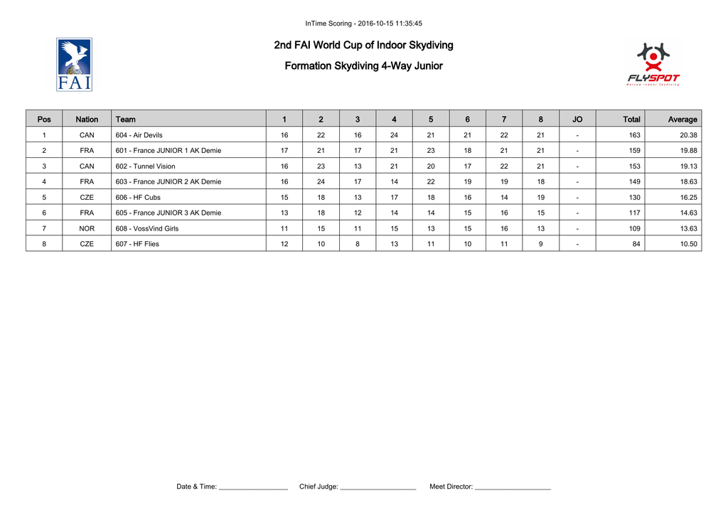 InTime Scoring - 2016-10-15 11:35:45 2nd FAI World Cup of Indoor Skydiving Formation Skydiving 4-Way Junior Pos Nation Team 1 2 3 4 5 6 7 8 JO 1 CAN 604 - Air Devils 16 22 16 24 21 21 22 21 2 FRA 601 - France JUNIOR 1 AK Demie 17 21 17 21 23 18 21 3 CAN 602 - Tunnel Vision 16 23 13 21 20 17 4 FRA 603 - France JUNIOR 2 AK Demie 16 24 17 14 22 5 CZE 606 - HF Cubs 15 18 13 17 6 FRA 605 - France JUNIOR 3 AK Demie 13 18 12 7 NOR 608 - VossVind Girls 11 15 8 CZE 607 - HF Flies 12 10 Date & Time: ____________________ Total Average - 163 20.38 21 - 159 19.88 22 21 - 153 19.13 19 19 18 - 149 18.63 18 16 14 19 - 130 16.25 14 14 15 16 15 - 117 14.63 11 15 13 15 16 13 - 109 13.63 8 13 11 10 11 9 - 84 10.50 Chief Judge: ______________________ Meet Director: ______________________
