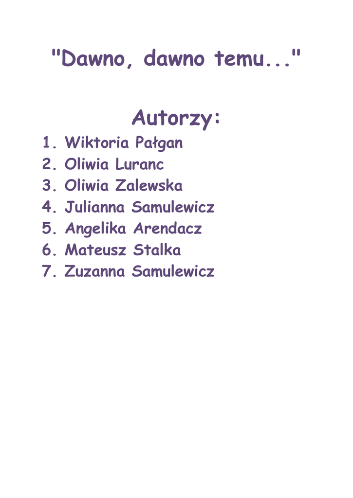 "Dawno, dawno temu..." Autorzy: 1. 2. 3. 4. 5. 6. 7. Wiktoria Pałgan Oliwia Luranc Oliwia Zalewska Julianna Samulewicz Angelika Arendacz Mateusz Stalka Zuzanna Samulewicz Baśń o uwięzionej królewnie Dawno, dawno temu, okropny smok uwięził królewnę w wysokiej wieży. Król ogłosił, że jeśli ktoś uratuje królewnę to on odda mu pół królestwa i królewnę za żonę. Było dużo chętnych, lecz smok ich wszystkich pokonał. W końcu zjawił się królewicz, który pokonał smoka i uwolnił królewnę. Król w nagrodę podarował królewiczowi pół królestwa i rękę księżniczki. Wyprawił huczne wesele a młodzi żyli długo i szczęśliwie. Wiktoria Pałgan Śpiew królowej Dawno, dawno temu żyła piękna królowa, która chciała pomagać ludziom i być ich przyjaciółką. Niestety, pewnego dnia spotkała złego czarownika, który uwięził królową w wieży. Ludzie stali się nieszczęśliwi po tym co spotkało ich ukochaną, piękną, o dobrym sercu królową. Aby czar prysnął, królowa musiała przez trzydzieści dni śpiewać piosenki. Na szczęście była bardzo wytrwała i po trzydziestu dniach uwolniła się z czarodziejskiej wieży. Żyła długo i szczęśliwie ze swoimi przyjaciółmi tak jak tego pragnęła. Oliwia Luranc Piękna i Bestia Dawno temu żył Książę, który był bardzo zły. Za karę na niego i cały zamek padł czar. Został zamieniony w Bestię. Za lasami żyła śliczna dziewczyna, która na imię miała Bella. Pewnego dnia jej ojciec Maurycy, jechał przez las i zabłądził. Schronił się w zamku Bestii. Bestia nie była z tego zadowolona i zamknęła Maurycego w lochu. Gdy koń Maurycego wrócił sam do wioski, Bella wiedziała, że jej tacie cos się stało i pojechała go szukać. Trafiła do zamku Bestii, bardzo się bała. Gdy zobaczyła Bestię, poprosiła żeby ją zamknął, a jej ojca wypuścił i tak się stało. Czas mijał, a Bella była zamknięta, ale nie była sama, bo na zamku byli zaczarowani: Trybik, Płomyk i Pani Imbryk. To oni wierzyli, że jak Bella i Bestia zakochają się, czar pryśnie. Bella pomału nabierała sympatii do Bestii, ale bardzo tęskniła za ojcem i wtedy Bestia pozwoliła jej go odwiedzić. Gdy była w wiosce, wszystko opowiedziała myśliwemu, który postanowił zabić Bestię. Tocząc walkę na zamku myśliwy zadał cios potworowi, a on sam spadł w przepaść. Kiedy Bella podbiegła do Bestii to potwór był umierający, nachylając się nad nim płakała. Wtedy jej łzy spadały na Bestię, a on ocknął się i powiedział Belli, że ją kocha. Cały czar prysnął i wszystko wróciło do normy, a Książę i Bella żyli długo i szczęśliwie. Oliwia Zalewska W pięknym pałacu mieszkała księżniczka. Każdy chłopak, który ją zobaczył mówił, że chce ją poślubić. Lecz ona nie mogła wyjść z pałacu, była zaczarowana przez swą złą matkę. Matka powiedziała, że jak wyjdzie z pałacu to umrze. Julianna Samulewicz Dawno, dawno temu za górami, za lasami, w pięknym pałacu mieszkali król, królowa i mała królewna. Królowa zmarła, gdy królewna była małą dziewczynką. Król ożenił się ponownie. Macocha nie lubiła królewny, dlatego zamknęła ją w wieży. Pewnego dnia do pałacu przybył Książę, który wykradł królewnę z wieży. Uciekli razem i żyli długo i szczęśliwie. Angelika Arendacz Dawno, dawno temu żyła sobie królewna uwięziona w wieży przez złego smoka, który bardzo dobrze strzegł wieży. Wielu rycerzy próbowało uwolnić księżniczkę, lecz żadnemu się nie udało. pewnego dnia pojawił się dzielny Książę, który swą odwagą pokonał smoka i uratował królewnę. Potem żyli długo i szczęśliwie. Mateusz Stalka Dawno temu za lasem w Krosinie stał pałac, w którym mieszkała piękna księżniczka. Pewnego dnia, idący leśniczy zobaczył księżniczkę w oknie pałacu. Zakochał się od pierwszego wejrzenia, ale nigdy więcej jej już nie ujrzał. Macocha nie pozwalała jej wychodzić, księżniczka miała tylko sprzątać. Pewnego dnia leśniczy postanowił porwać księżniczkę z pałacu. Kiedy ją porwał, pobrali się. Wesele było huczne, a oni żyli długo i szczęśliwie. Zuzanna Samulewicz