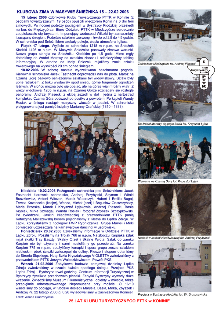 KLUBOWA ZIMA W MASYWIE ŚNIEŻNIKA 15 – 22.02.2006 15 lutego 2006 członkowie Klubu Turystycznego PTTK w Koninie (z osobami towarzyszącymi 19 osób) opuścili wieczorem Konin na 6 dni ferii zimowych. Po nocnej podróży pociągiem w Bystrzycy Kłodzkiej przesiedli na bus do Międzygórza. Biuro Oddziału PTTK w Międzygórzu serdecznie zaopiekowało się turystami. Imponujący wodospad Wilczki był zamarznięty i zasypany śniegiem. Podejście szlakiem czerwonym trwało od 2,5 do 4,5 godzin. W schronisku pod Śnieżnikiem czekały pokoje, ciepła atmosfera i gitara. Piątek 17 lutego. Wyjście ze schroniska 1218 m n.p.m. na Śnieżnik Kłodzki 1426 m n.p.m. W Masywie Śnieżnika panowały zimowe warunki. Nasza grupa stanęła na Śnieżniku Kłodzkim po 1,5 godz. Mimo mgły dotarliśmy do źródeł Morawy na czeskim zboczu i odśnieżyliśmy tablicę informacyjną. W drodze na Mały Śnieżnik mijaliśmy znaki szlaku rowerowego na wysokości 20 cm ponad śniegiem. 18.02.2006 W sobotę nastała wyczekiwana bezchmurna pogoda. Kierownik schroniska Jacek Fastnacht odprowadził nas do płota. Marsz na Czarną Górę bajkowo ośnieżonymi szlakami był widowiskowy. Szlaki były ubite ratrakiem. Z boku wystawały spod śniegu górne fragmenty ogrodzeń leśnych. W słońcu można było się opalać, ale na górze wiał mroźny wiatr. Z wieży widokowej 1205 m n.p.m. na Czarnej Górze rozciągały się rozległe panoramy. Andrzej Piasecki z ekipą zszedł w dół i jedną z nartostrad kompleksu Czarna Góra podszedł po posiłku z powrotem. Po kąpieli Wandy Rosiak w śniegu nastąpił muzyczny wieczór w jadalni. W schronisku pielęgnowana jest pamięć księżny Marianny Orańskiej (1810 - 1883). Zaśnieżone Międzygórze fot. Andrzej Piasecki Do źródeł Morawy sięgnęła Basia fot. Krzysztof Łyjak Wymarsz na Czarną Górę fot. Krzysztof Łyjak Niedziela 19.02.2006 Pożegnanie schroniska pod Śnieżnikiem: Jacek Fastnacht kierownik schroniska, Andrzej Przybylski, Szymon i Witold Buszkiewicz, Antoni Witczak, Marek Walerczyk, Hubert i Emilia Bugaj, Teresa Kozanecka (kasjer), Wanda, Michał (szef) i Bogusław Gruszczyńscy, Maria Brzoska, Marek i Krzysztof Łyjakowie, Andrzej Piasecki, Basia Krysiak, Mirka Szmagaj, Wanda Rosiak i fotograf Zbyszek Szczypkowski. Po zwiedzeniu Jaskini Niedźwiedziej z przewodnikiem PTTK panią Katarzyną Maliszewską busem pojechaliśmy z Kletna do Lądka Zdroju. W Lądku korzystaliśmy z noclegów FWP Rybniczanka. Grupa Marysi i Mirki co wieczór uczęszczała na karnawałowe dancingi w uzdrowisku. Poniedziałek 20.02.2006 Uzyskaliśmy informacje w Oddziale PTTK w Lądku Zdroju. Poszliśmy na Trojak 766 m n.p.m. Na zboczu Karpiaka szlak mijał skałki Trzy Baszty, Skalny Orzeł i Skalne Wrota. Szlak do zamku Karpień nie był używany i sami musieliśmy go przecierać. Na zamku Karpień 775 m n.p.m. spożyliśmy kanapki i spora grupa zeszła szlakiem niebieskim obok ścieżki zwierzęcej do doliny. Pieszo i stopem dotarliśmy do Stronia Śląskiego. Hutę Szkła Kryształowego VIOLETTA zwiedzaliśmy z przewodnikiem PTTK Jerzym Waleszkiewiczem. Powrót PKS. Wtorek 21.02.2006 Zabytkowe budowle zdrojowej dzielnicy Lądka Zdroju zwiedzaliśmy w szacie świeżo spadłego śniegu. Przejazd PKS Lądek Zdrój – Bystrzyca trwał godzinę. Centrum Informacji Turystycznej w Bystrzycy życzliwie przechowało plecaki. Zabytki Bystrzycy wywarły duże wrażenie. Zwiedziliśmy Muzeum Filumenistyczne i obiekty w mieście, także przepięknie odrestaurowanego Nepomucena przy moście. O 16:10 wsiedliśmy do pociągu, w Kłodzku dosiedli Marysia, Basia, Mirka, Zbyszek i Andrzej Pr. 22 lutego 2006 g. 0:28 wylądowaliśmy w zaśnieżonym Koninie! Tekst: Wanda Gruszczyńska Nacieki w Jaskini Niedźwiedziej fot. Andrzej Przybylski Pręgierz w Bystrzycy Kłodzkiej fot. W. Gruszczyńska 25 LAT KLUBU TURYSTYCZNEGO PTTK w KONINIE