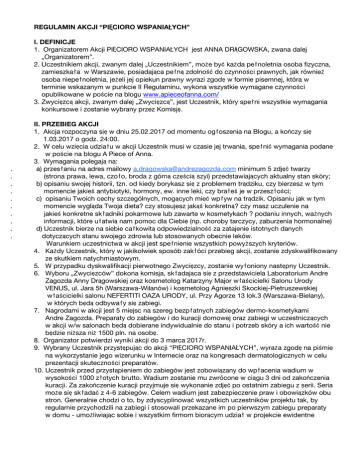 REGULAMIN AKCJI “PIĘCIORO WSPANIAŁYCH” I. DEFINICJE 1. Organizatorem Akcji PIĘCIORO WSPANIAŁYCH jest ANNA DRĄGOWSKA, zwana dalej „Organizatorem”. 2. Uczestnikiem akcji, zwanym dalej „Uczestnikiem”, może być każda pełnoletnia osoba fizyczna, zamieszkała w Warszawie, posiadająca pełną zdolność do czynności prawnych, jak również osoba niepełnoletnia, jeżeli jej opiekun prawny wyrazi zgodę w formie pisemnej, która w terminie wskazanym w punkcie II Regulaminu, wykona wszystkie wymagane czynności opublikowane w poście na blogu www.apieceofanna.com/ 3. Zwycięzcą akcji, zwanym dalej „Zwycięzcą”, jest Uczestnik, który spełni wszystkie wymagania konkursowe i zostanie wybrany przez Komisję. . . . . . . . . . . II. PRZEBIEG AKCJI 1. Akcja rozpoczyna się w dniu 25.02.2017 od momentu ogłoszenia na Blogu, a kończy się 1.03.2017 o godz. 24:00. 2. W celu wzięcia udziału w akcji Uczestnik musi w czasie jej trwania, spełnić wymagania podane w poście na blogu A Piece of Anna. 3. Wymagania polegają na: a) przesłaniu na adres mailowy [email protected] minimum 5 zdjęć twarzy (strona prawa, lewa, czoło, broda z górną częścią szyi) przedstawiających aktualny stan skóry; b) opisaniu swojej historii, tzn. od kiedy borykasz się z problemem trądziku, czy bierzesz w tym momencie jakieś antybiotyki, hormony, ew. inne leki, czy brałeś je w przeszłości; c) opisaniu Twoich cechy szczególnych, mogących mieć wpływ na trądzik. Opisaniu jak w tym momencie wygląda Twoja dieta? czy stosujesz jakąś konkretną? czy masz uczulenie na jakieś konkretne składniki pokarmowe lub zawarte w kosmetykach ? podaniu innych, ważnych informacji, które ułatwią nam pomoc dla Ciebie (np. choroby tarczycy, zaburzenia hormonalne) d) Uczestnik bierze na siebie całkowitą odpowiedzialność za zatajenie istotnych danych dotyczących stanu swojego zdrowia lub stosowanych obecnie leków. Warunkiem uczestnictwa w akcji jest spełnienie wszystkich powyższych kryteriów. 4. Każdy Uczestnik, który w jakikolwiek sposób zakłóci przebieg akcji, zostanie zdyskwalifikowany ze skutkiem natychmiastowym. 5. W przypadku dyskwalifikacji pierwotnego Zwycięzcy, zostanie wyłoniony następny Uczestnik. 6. Wyboru „Zwycięzców” dokona komisja, składająca się z przedstawiciela Laboratorium Andre Zagozda Anny Drągowskiej oraz kosmetolog Katarzyny Major właścicielki Salonu Urody VENUS, ul. Jara 5h (Warszawa-Wilanów) i kosmetolog Agnieszki Skockiej-Pietruszewskiej właścicielki salonu NEFERTITI OAZA URODY, ul. Przy Agorze 13 lok.3 (Warszawa-Bielany), w których będą odbywały się zabiegi. 7. Nagrodami w akcji jest 5 miejsc na szereg bezpłatnych zabiegów dermo-kosmetykami Andre Zagozda. Preparaty do zabiegów i do kuracji domowej oraz zabiegi w uczestniczących w akcji w/w salonach będą dobierane indywidualnie do stanu i potrzeb skóry a ich wartość nie będzie niższa niż 1500 pln. na osobę. 8. Organizator potwierdzi wyniki akcji do 3 marca 2017r. 9. Wybrany Uczestnik przystępując do akcji “PIĘCIORO WSPANIAŁYCH”, wyraża zgodę na piśmie na wykorzystanie jego wizerunku w Internecie oraz na kongresach dermatologicznych w celu prezentacji skuteczności preparatów. 10. Uczestnik przed przystąpieniem do zabiegów jest zobowiązany do wpłacenia wadium w wysokości 1000 złotych brutto. Wadium zostanie mu zwrócone w ciągu 3 dni od zakończenia kuracji. Za zakończenie kuracji przyjmuje się wykonanie zdjęć po ostatnim zabiegu z serii. Seria może się składać z 4-6 zabiegów. Celem wadium jest zabezpieczenie praw i obowiązków obu stron. Generalnie chodzi o to, by zdyscyplinować wszystkich uczestników projektu tak, by regularnie przychodzili na zabiegi i stosowali przekazane im po pierwszym zabiegu preparaty w domu - umożliwiając sobie i wszystkim firmom biorącym udział w projekcie ewidentne zmniejszenie lub zlikwidowanie trądziku. III. ODPOWIEDZIALNOŚĆ ORGANIZATORA, REKLAMACJE 1. Organizator nie ponosi odpowiedzialności za to, że Zwycięzca akcji z powodów zdrowotnych lub innych, uniemożliwiających zakwalifikowanie do wykonania zabiegu nie skorzysta z wygranej. 2. Reklamacje odnośnie przebiegu Akcji mogą być zgłaszane za pośrednictwem poczty elektronicznej na adres Organizatora: [email protected], w terminie 14 dni, od dnia zakończenia konkursu. 4. Reklamacja zostanie rozstrzygnięta w terminie 21 dni roboczych od jej prawidłowego złożenia Organizatorowi. Decyzja Organizatora, co do zgłoszonej reklamacji jest ostateczna. 5. Prawidłowo złożona reklamacja powinna zawierać imię, nazwisko, oraz adres mailowy Uczestnika, jak również dokładny opis i wskazanie przyczyny reklamacji. 6. O wyniku rozpatrzonej reklamacji Uczestnik zostanie powiadomiony na adres mailowy podany w reklamacji. 7. Reklamacje nie zawierające danych wymienionych w punkcie 4 powyżej nie będą rozpatrywane. IV. OCHRONA DANYCH OSOBOWYCH 1. Uczestnik wyraża zgodę na przetwarzanie danych osobowych Uczestnika w celu realizacji Akcji i w zakresie wskazanym w niniejszym Regulaminie zgodnie z ustawą z dnia 29 sierpnia 1997 r. o ochronie danych osobowych (Dz.U. z 2002 r. nr 101 poz. 926) oraz w celach marketingowych. 2. Uczestnik wyraża zgodę na otrzymywanie informacji handlowych drogą elektroniczną na podstawie ustawy z dnia 18 lipca 2002 r. o świadczeniu usług drogą elektroniczną (Dz.U. Nr 144 poz. 1204 z późn. zm.). 3. Uczestnik konkursu, na podstawie art. 81 ust. 1 ustawy z dnia 4 lutego 1994 r. (Dz.U. z 2006 Nr 90 poz. 631 z pózn. zm.) o prawie autorskim i prawach pokrewnych, wyraża zgodę na nieodpłatne i nieodwołalne utrwalenie wizerunku w formie spotu multimedialnego oraz sesji zdjęciowej, w ramach zapisu w dniu przystąpienia do akcji (wykonanie zabiegu kosmetykami Andre Zagozda). Ponadto Uczestnik wyraża zgodę na nieodpłatne rozpowszechnianie przez Andre Zagozda Laboratory, blogerkę „A piece of Anna” oraz Salon Urod