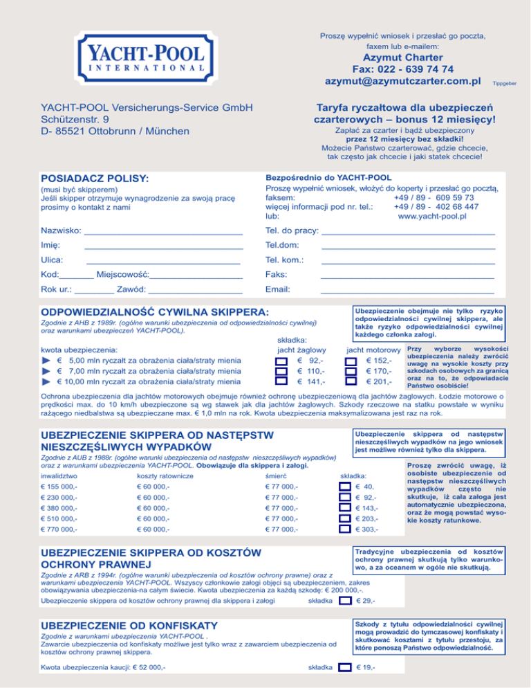 Proszę wypełnić wniosek i przesłać go poczta, faxem lub e-mailem: Azymut Charter Fax: 022 - 639 74 74 [email protected] Tippgeber Taryfa ryczałtowa dla ubezpieczeń czarterowych – bonus 12 miesięcy! YACHT-POOL Versicherungs-Service GmbH Schützenstr. 9 D- 85521 Ottobrunn / München Zapłać za czarter i bądź ubezpieczony przez 12 miesięcy bez składki! Możecie Państwo czarterować, gdzie chcecie, tak często jak chcecie i jaki statek chcecie! (musi być skipperem) Jeśli skipper otrzymuje wynagrodzenie za swoją pracę prosimy o kontakt z nami Bezpośrednio do YACHT-POOL Proszę wypełnić wniosek, włożyć do koperty i przesłać go pocztą, faksem: +49 / 89 - 609 59 73 więcej informacji pod nr. tel.: +49 / 89 - 402 68 447 lub: www.yacht-pool.pl Nazwisko: ________________________________ Tel. do pracy: ___________________________________ Imię: ________________________________ Tel.dom: ___________________________________ Ulica: _______________________________ Tel. kom.: ___________________________________ Kod:_______ Miejscowość:___________________ Faks: ___________________________________ Rok ur.: ________ Zawód: ___________________ Email: ___________________________________ POSIADACZ POLISY: ODPOWIEDZIALNOŚĆ CYWILNA SKIPPERA: Zgodnie z AHB z 1989r. (ogólne warunki ubezpieczenia od odpowiedzialności cywilnej) oraz warunkami ubezpieczeń YACHT-POOL). składka: jacht żaglowy € 92,€ 110,€ 141,- kwota ubezpieczenia: € 5,00 mln ryczałt za obrażenia ciała/straty mienia € 7,00 mln ryczałt za obrażenia ciała/straty mienia € 10,00 mln ryczałt za obrażenia ciała/straty mienia Ubezpieczenie obejmuje nie tylko ryzyko odpowiedzialności cywilnej skippera, ale także ryzyko odpowiedzialności cywilnej każdego członka załogi. jacht motorowy € 152,€ 170,€ 201,- Przy wyborze wysokości ubezpieczenia należy zwrócić uwagę na wysokie koszty przy szkodach osobowych za granicą oraz na to, że odpowiadacie Państwo osobiście! Ochrona ubezpieczenia dla jachtów motorowych obejmuje również ochronę ubezpieczeniową dla jachtów żaglowych. Łodzie motorowe o prędkości max. do 10 km/h ubezpieczone są wg stawek jak dla jachtów żaglowych. Szkody rzeczowe na statku powstałe w wyniku rażącego niedbalstwa są ubezpieczane max. € 1,0 mln na rok. Kwota ubezpieczenia maksymalizowana jest raz na rok. Ubezpieczenie skippera od następstw nieszczęśliwych wypadków na jego wniosek jest możliwe również tylko dla skippera. UBEZPIECZENIE SKIPPERA OD NASTĘPSTW NIESZCZĘŚLIWYCH WYPADKÓW Zgodnie z AUB z 1988r. (ogólne warunki ubezpieczenia od następstw nieszczęśliwych wypadków) oraz z warunkami ubezpieczenia YACHT-POOL. Obowiązuje dla skippera i załogi. inwalidztwo koszty ratownicze śmierć składka: € 155 000,- € 60 000,- € 77 000,- € 40, € 230 000,- € 60 000,- € 77 000,- € 92,- € 380 000,- € 60 000,- € 77 000,- € 143,- € 510 000,- € 60 000,- € 77 000,- € 203,- € 770 000,- € 60 000,- € 77 000,- € 303,- Proszę zwrócić uwagę, iż osobiste ubezpieczenie od następstw nieszczęśliwych wypadków często nie skutkuje, iż cała załoga jest automatycznie ubezpieczona, oraz że mogą powstać wysokie koszty ratunkowe. Tradycyjne ubezpieczenia od kosztów ochrony prawnej skutkują tylko warunkowo, a za oceanem w ogóle nie skutkują. UBEZPIECZENIE SKIPPERA OD KOSZTÓW OCHRONY PRAWNEJ Zgodnie z ARB z 1994r. (ogólne warunki ubezpieczenia od kosztów ochrony prawne) oraz z warunkami ubezpieczenia YACHT-POOL. Wszyscy członkowie załogi objęci są ubezpieczeniem, zakres obowiązywania ubezpieczenia-na całym świecie. Kwota ubezpieczenia za każdą szkodę: € 200 000,-. Ubezpieczenie skippera od kosztów ochrony prawnej dla skippera i załogi składka UBEZPIECZENIE OD KONFISKATY Zgodnie z warunkami ubezpieczenia YACHT-POOL . Zawarcie ubezpieczenia od konfiskaty możliwe jest tylko wraz z zawarciem ubezpieczenia od kosztów ochrony prawnej skippera. Kwota ubezpieczenia kaucji: € 52 000,- składka € 29,- Szkody z tytułu odpowiedzialności cywilnej mogą prowadzić do tymczasowej konfiskaty i skutkować kosztami z tytułu przestoju, za które ponoszą Państwo odpowiedzialność. € 19,- UBEZPIECZENIE KAUCJI ZA CZARTER Zgodnie z warunkami ubezpieczeń YACHT-POOL kaucji za czarter. Ochrona ubezpieczeniowa obejmuje skippera oraz załogę na kwotę powstałej szkody casco, w wybranej poniżej maksymalnej wysokości. Udział własny wynosi 5% kaucji lub małej szkody, jednak nie mniej niż € 50,- za zdarzenie. Zaznaczona kwota kaucji nie może być niższa niż ustalona w umowie czarteru. kwota kaucji do €: 511,1025,1550,2050,2600,3050,składka € 61,120,154,195,243,292,_________________ Jeśli chcą Państwo ubezpieczyć kwotę kaucji wyższą niż € 3050,-, proszę wpisać żądaną kwotę w puste miejsce po prawej stronie i przesłać formularz faksem. Otrzymacie Państwo niezwłocznie naszą propozycję składki. Ryzyko regat jest wyłączone z ubezpieczenia kaucji za czarter, ale na wniosek może zostać dodane. Ubezpieczenie kaucji nie zwalnia od zdeponowania kaucji w bazie. UBEZPIECZENIE OD NASTĘPSTW USZKODZEŃ W CZARTERZE Zgodnie z warunkami ubezpieczeń YACHT-POOL od następstw uszkodzeń w czarterze. Ochrona ubezpieczeniowa obejmuje skippera oraz załogę dla jachtów o ustalonych jak poniżej parametrach: długość do 33′ składka za jacht żaglowy do 36′ € 84,- do 43′ € 99,- do 52′ € 119,- do 63′ € 151,- € 189,- składka za jacht motorowy € 109,€ 120,€ 149,€ 239,€ 299,Ochrona ubezpieczeniowa dla jachtów motorowych obejmuje również ochronę ubezpieczeniową dla jachtów żaglowych. Ryzyko regat jest wyłączone z ubezpieczenia od następstw uszkodzeń w czarterze, ale na wniosek może zostać dodane. UBEZPIECZENIE OD ANULOWANIA CZARTERU Zgodnie z warunkami ubezpieczenia YACHT-POOL od anulowania czarteru. Skipper i wszyscy członkowie załogi są objęci 