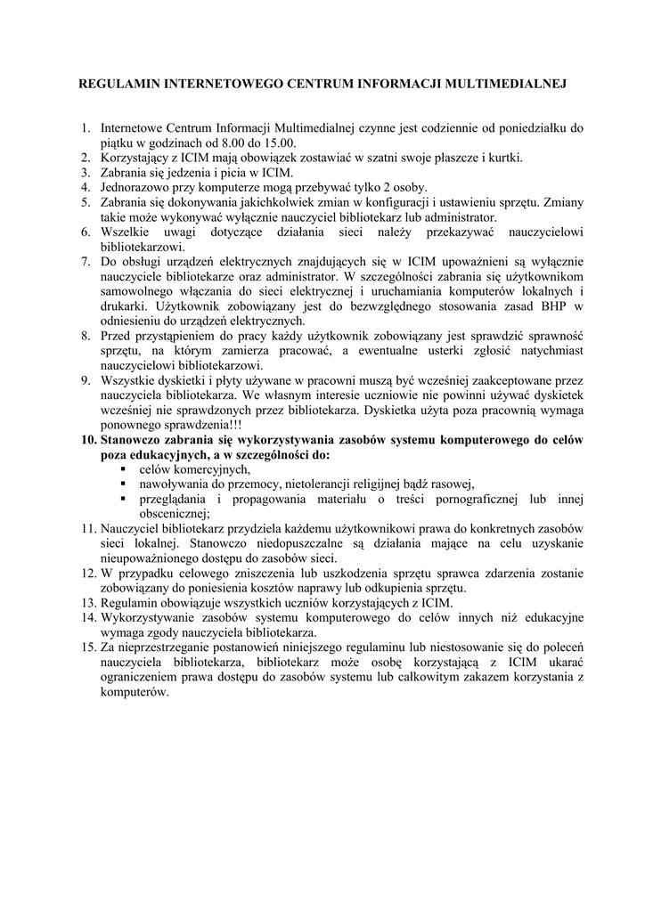 REGULAMIN INTERNETOWEGO CENTRUM INFORMACJI MULTIMEDIALNEJ 1. Internetowe Centrum Informacji Multimedialnej czynne jest codziennie od poniedziałku do piątku w godzinach od 8.00 do 15.00. 2. Korzystający z ICIM mają obowiązek zostawiać w szatni swoje płaszcze i kurtki. 3. Zabrania się jedzenia i picia w ICIM. 4. Jednorazowo przy komputerze mogą przebywać tylko 2 osoby. 5. Zabrania się dokonywania jakichkolwiek zmian w konfiguracji i ustawieniu sprzętu. Zmiany takie może wykonywać wyłącznie nauczyciel bibliotekarz lub administrator. 6. Wszelkie uwagi dotyczące działania sieci należy przekazywać nauczycielowi bibliotekarzowi. 7. Do obsługi urządzeń elektrycznych znajdujących się w ICIM upoważnieni są wyłącznie nauczyciele bibliotekarze oraz administrator. W szczególności zabrania się użytkownikom samowolnego włączania do sieci elektrycznej i uruchamiania komputerów lokalnych i drukarki. Użytkownik zobowiązany jest do bezwzględnego stosowania zasad BHP w odniesieniu do urządzeń elektrycznych. 8. Przed przystąpieniem do pracy każdy użytkownik zobowiązany jest sprawdzić sprawność sprzętu, na którym zamierza pracować, a ewentualne usterki zgłosić natychmiast nauczycielowi bibliotekarzowi. 9. Wszystkie dyskietki i płyty używane w pracowni muszą być wcześniej zaakceptowane przez nauczyciela bibliotekarza. We własnym interesie uczniowie nie powinni używać dyskietek wcześniej nie sprawdzonych przez bibliotekarza. Dyskietka użyta poza pracownią wymaga ponownego sprawdzenia!!! 10. Stanowczo zabrania się wykorzystywania zasobów systemu komputerowego do celów poza edukacyjnych, a w szczególności do: celów komercyjnych, nawoływania do przemocy, nietolerancji religijnej bądź rasowej, przeglądania i propagowania materiału o treści pornograficznej lub innej obscenicznej; 11. Nauczyciel bibliotekarz przydziela każdemu użytkownikowi prawa do konkretnych zasobów sieci lokalnej. Stanowczo niedopuszczalne są działania mające na celu uzyskanie nieupoważnionego dostępu do zasobów sieci. 12. W przypadku celowego zniszczenia lub uszkodzenia sprzętu sprawca zdarzenia zostanie zobowiązany do poniesienia kosztów naprawy lub odkupienia sprzętu. 13. Regulamin obowiązuje wszystkich uczniów korzystających z ICIM. 14. Wykorzystywanie zasobów systemu komputerowego do celów innych niż edukacyjne wymaga zgody nauczyciela bibliotekarza. 15. Za nieprzestrzeganie postanowień niniejszego regulaminu lub niestosowanie się do poleceń nauczyciela bibliotekarza, bibliotekarz może osobę korzystającą z ICIM ukarać ograniczeniem prawa dostępu do zasobów systemu lub całkowitym zakazem korzystania z komputerów.