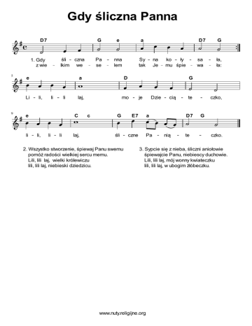 Gdy śliczna Panna D7 G śli czna lkim we 1. Gdy z wie Li 9 Pa se nna lem Sy tak a li, li li li, li li na Je laj, C laj, mo c G je ko ły mu śpie 2. Wszystko stworzenie, śpiewaj Panu swemu pomóż radości wielkiej sercu memu. Lili, lili laj, wielki królewiczu lili, lili laj, niebieski dziedzicu. G sa wa ła, ła: Dzie cią te czko, E7 a D7 Pa te czko. śli D7 G D e li e a 5 e czne nią G 3. Sypcie się z nieba, śliczni aniołowie śpiewajcie Panu, niebiescy duchowie. Lili, lili laj, mój wonny kwiateczku lili, lili laj, w ubogim żłóbeczku. www.nuty.religijne.org