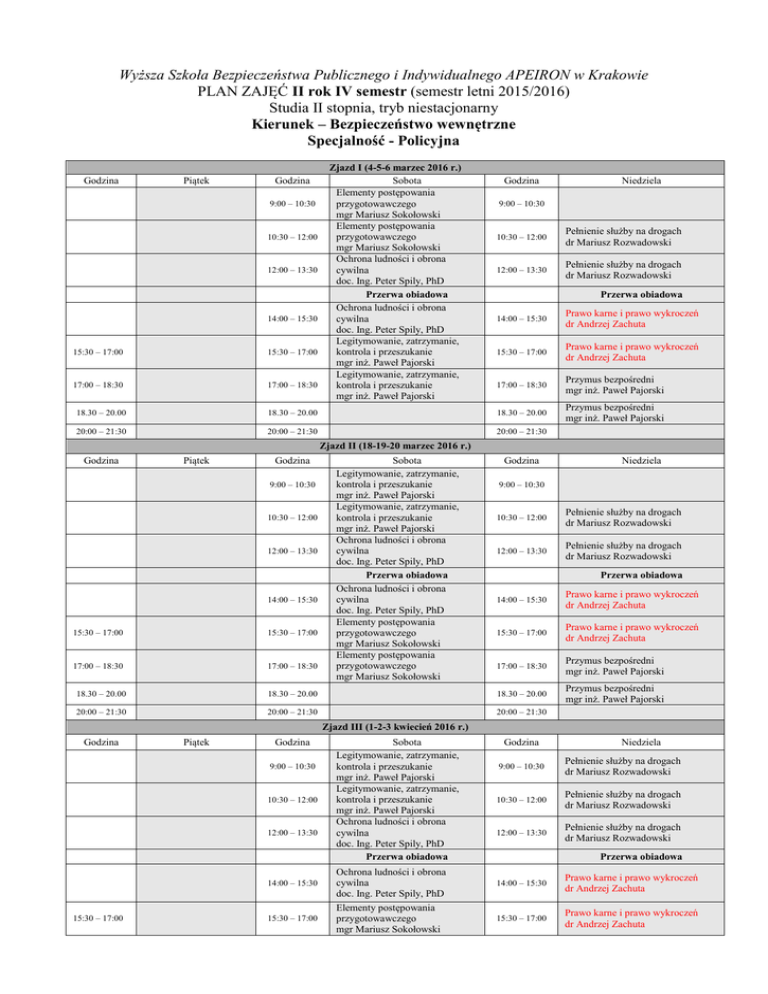 Wyższa Szkoła Bezpieczeństwa Publicznego i Indywidualnego APEIRON w Krakowie PLAN ZAJĘĆ II rok IV semestr (semestr letni 2015/2016) Studia II stopnia, tryb niestacjonarny Kierunek – Bezpieczeństwo wewnętrzne Specjalność - Policyjna Godzina Piątek Godzina 9:00 – 10:30 10:30 – 12:00 12:00 – 13:30 14:00 – 15:30 15:30 – 17:00 15:30 – 17:00 17:00 – 18:30 17:00 – 18:30 Zjazd I (4-5-6 marzec 2016 r.) Sobota Elementy postępowania przygotowawczego mgr Mariusz Sokołowski Elementy postępowania przygotowawczego mgr Mariusz Sokołowski Ochrona ludności i obrona cywilna doc. Ing. Peter Spily, PhD Przerwa obiadowa Ochrona ludności i obrona cywilna doc. Ing. Peter Spily, PhD Legitymowanie, zatrzymanie, kontrola i przeszukanie mgr inż. Paweł Pajorski Legitymowanie, zatrzymanie, kontrola i przeszukanie mgr inż. Paweł Pajorski Godzina Niedziela 9:00 – 10:30 10:30 – 12:00 Pełnienie służby na drogach dr Mariusz Rozwadowski 12:00 – 13:30 Pełnienie służby na drogach dr Mariusz Rozwadowski Przerwa obiadowa 14:00 – 15:30 Prawo karne i prawo wykroczeń dr Andrzej Zachuta 15:30 – 17:00 Prawo karne i prawo wykroczeń dr Andrzej Zachuta 17:00 – 18:30 Przymus bezpośredni mgr inż. Paweł Pajorski Przymus bezpośredni mgr inż. Paweł Pajorski 18.30 – 20.00 18.30 – 20.00 18.30 – 20.00 20:00 – 21:30 20:00 – 21:30 20:00 – 21:30 Zjazd II (18-19-20 marzec 2016 r.) Godzina Piątek Godzina 9:00 – 10:30 10:30 – 12:00 12:00 – 13:30 14:00 – 15:30 15:30 – 17:00 15:30 – 17:00 17:00 – 18:30 17:00 – 18:30 18.30 – 20.00 18.30 – 20.00 20:00 – 21:30 20:00 – 21:30 Sobota Legitymowanie, zatrzymanie, kontrola i przeszukanie mgr inż. Paweł Pajorski Legitymowanie, zatrzymanie, kontrola i przeszukanie mgr inż. Paweł Pajorski Ochrona ludności i obrona cywilna doc. Ing. Peter Spily, PhD Przerwa obiadowa Ochrona ludności i obrona cywilna doc. Ing. Peter Spily, PhD Elementy postępowania przygotowawczego mgr Mariusz Sokołowski Elementy postępowania przygotowawczego mgr Mariusz Sokołowski Godzina Niedziela 9:00 – 10:30 10:30 – 12:00 Pełnienie służby na drogach dr Mariusz Rozwadowski 12:00 – 13:30 Pełnienie służby na drogach dr Mariusz Rozwadowski Przerwa obiadowa 14:00 – 15:30 Prawo karne i prawo wykroczeń dr Andrzej Zachuta 15:30 – 17:00 Prawo karne i prawo wykroczeń dr Andrzej Zachuta 17:00 – 18:30 Przymus bezpośredni mgr inż. Paweł Pajorski 18.30 – 20.00 Przymus bezpośredni mgr inż. Paweł Pajorski 20:00 – 21:30 Zjazd III (1-2-3 kwiecień 2016 r.) Godzina Piątek Godzina 9:00 – 10:30 10:30 – 12:00 12:00 – 13:30 14:00 – 15:30 15:30 – 17:00 15:30 – 17:00 Sobota Legitymowanie, zatrzymanie, kontrola i przeszukanie mgr inż. Paweł Pajorski Legitymowanie, zatrzymanie, kontrola i przeszukanie mgr inż. Paweł Pajorski Ochrona ludności i obrona cywilna doc. Ing. Peter Spily, PhD Przerwa obiadowa Ochrona ludności i obrona cywilna doc. Ing. Peter Spily, PhD Elementy postępowania przygotowawczego mgr Mariusz Sokołowski Godzina Niedziela 9:00 – 10:30 Pełnienie służby na drogach dr Mariusz Rozwadowski 10:30 – 12:00 Pełnienie służby na drogach dr Mariusz Rozwadowski 12:00 – 13:30 Pełnienie służby na drogach dr Mariusz Rozwadowski Przerwa obiadowa 14:00 – 15:30 Prawo karne i prawo wykroczeń dr Andrzej Zachuta 15:30 – 17:00 Prawo karne i prawo wykroczeń dr Andrzej Zachuta 17:00 – 18:30 17:00 – 18:30 Elementy postępowania przygotowawczego mgr Mariusz Sokołowski 17:00 – 18:30 18.30 – 20.00 18.30 – 20.00 18.30 – 20.00 20:00 – 21:30 20:00 – 21:30 20:00 – 21:30 Godzina Piątek 15:30 – 17:00 17:00 – 18:30 Zjazd IV (15-16-17 kwiecień 2016 r.) Sobota Legitymowanie, zatrzymanie, 9:00 – 10:30 kontrola i przeszukanie mgr inż. Paweł Pajorski Legitymowanie, zatrzymanie, 10:30 – 12:00 kontrola i przeszukanie mgr inż. Paweł Pajorski Ochrona ludności i obrona 12:00 – 13:30 cywilna doc. Ing. Peter Spily, PhD Przerwa obiadowa Ochrona ludności i obrona 14:00 – 15:30 cywilna doc. Ing. Peter Spily, PhD Elementy postępowania 15:30 – 17:00 przygotowawczego mgr Mariusz Sokołowski Elementy postępowania 17:00 – 18:30 przygotowawczego mgr Mariusz Sokołowski Godzina 18.30 – 20.00 18.30 – 20.00 20:00 – 21:30 20:00 – 21:30 Godzina Przymus bezpośredni mgr inż. Paweł Pajorski Niedziela 9:00 – 10:30 Pełnienie służby na drogach dr Mariusz Rozwadowski 10:30 – 12:00 Pełnienie służby na drogach dr Mariusz Rozwadowski 12:00 – 13:30 Pełnienie służby na drogach dr Mariusz Rozwadowski Przerwa obiadowa 14:00 – 15:30 Prawo karne i prawo wykroczeń dr Andrzej Zachuta 15:30 – 17:00 Prawo karne i prawo wykroczeń dr Andrzej Zachuta 17:00 – 18:30 Przymus bezpośredni mgr inż. Paweł Pajorski 18.30 – 20.00 20:00 – 21:30 Zjazd V (6-7-8 maj 2016 r.) Godzina Piątek Godzina 9:00 – 10:30 10:30 – 12:00 12:00 – 13:30 14:00 – 15:30 15:30 – 17:00 15:30 – 17:00 17:00 – 18:30 17:00 – 18:30 Sobota Legitymowanie, zatrzymanie, kontrola i przeszukanie mgr inż. Paweł Pajorski Legitymowanie, zatrzymanie, kontrola i przeszukanie mgr inż. Paweł Pajorski Ochrona ludności i obrona cywilna doc. Ing. Peter Spily, PhD Przerwa obiadowa Ochrona ludności i obrona cywilna doc. Ing. Peter Spily, PhD Elementy postępowania przygotowawczego mgr Mariusz Sokołowski Elementy postępowania przygotowawczego mgr Mariusz Sokołowski Godzina Niedziela 9:00 – 10:30 10:30 – 12:00 Pełnienie służby na drogach dr Mariusz Rozwadowski 12:00 – 13:30 Pełnienie służby na drogach dr Mariusz Rozwadowski Przerwa obiadowa 14:00 – 15:30 Prawo karne i prawo wykroczeń dr Andrzej Zachuta 15:30 – 17:00 Prawo karne i prawo wykroczeń dr Andrzej Zachuta 17:00 – 18:30 Przymus bezpośredni mgr inż. Paweł Pajorski 18.30 – 20.00 18.30 – 20.00 18.30 – 20.00 20:00 – 21:30 20:00 – 21:30 20:00 – 21:30 Zjazd VI (20-21-22 maj 2016 r.) Godzina Piątek Godzina Sobota 9:00