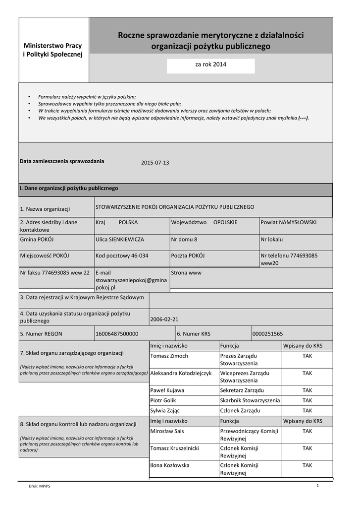 ZŽĐnjŶĞƐƉƌĂǁŽnjĚĂŶŝĞŵĞƌLJƚŽƌLJĐnjŶĞnjĚnjŝĂųĂůŶŽƑĐŝ ŽƌŐĂŶŝnjĂĐũŝƉŽǏLJƚŬƵƉƵďůŝĐnjŶĞŐŽ Ministerstwo Pracy ŝWŽůŝƚLJŬŝ^ƉŽųĞĐnjŶĞũ za rok 2014 • • • • &ŽƌŵƵůĂƌnjŶĂůĞǏLJǁLJƉĞųŶŝđǁũħnjLJŬƵƉŽůƐŬŝŵ͖ ^ƉƌĂǁŽnjĚĂǁĐĂǁLJƉĞųŶŝĂƚLJůŬŽƉƌnjĞnjŶĂĐnjŽŶĞĚůĂŶŝĞŐŽďŝĂųĞƉŽůĂ͖ tƚƌĂŬĐŝĞǁLJƉĞųŶŝĂŶŝĂĨŽƌŵƵůĂƌnjĂŝƐƚŶŝĞũĞŵŽǏůŝǁŽƑđĚŽĚĂǁĂŶŝĂǁŝĞƌƐnjLJŽƌĂnjnjĂǁŝũĂŶŝĂƚĞŬƐƚſǁǁƉŽůĂĐŚ͖ tĞǁƐnjLJƐƚŬŝĐŚƉŽůĂĐŚ͕ǁŬƚſƌLJĐŚŶŝĞďħĚČǁƉŝƐĂŶĞŽĚƉŽǁŝĞĚŶŝĞŝŶĨŽƌŵĂĐũĞ͕ŶĂůĞǏLJǁƐƚĂǁŝđƉŽũĞĚLJŶĐnjLJnjŶĂŬŵLJƑůŶŝŬĂ (--–). Data zamieszczenia sprawozdania 2015-07-13 /͘ĂŶĞŽƌŐĂŶŝnjĂĐũŝƉŽǏLJƚŬƵƉƵďůŝĐnjŶĞŐŽ 1. Nazwa organizacji ^dKtZz^E/WK<M:KZ'E/:WKzd<hWh>/E'K 2. Adres siedziby i dane kontaktowe Kraj Gmina POKÓJ Ulica SIENKIEWICZA Nr domu 8 Nr lokalu DŝĞũƐĐŽǁŽƑđWK<M: Kod pocztowy 46-034 Poczta POKÓJ Nr telefonu 774693085 wew20 POLSKA Województwo OPOLSKIE WŽǁŝĂƚEDz^BKt^</ Nr faksu 774693085 wew 22 E-mail Strona www stowarzyszeniepokoj@gmina pokoj.pl ϯ͘ĂƚĂƌĞũĞƐƚƌĂĐũŝǁ<ƌĂũŽǁLJŵZĞũĞƐƚƌnjĞ^ČĚŽǁLJŵ ϰ͘ĂƚĂƵnjLJƐŬĂŶŝĂƐƚĂƚƵƐƵŽƌŐĂŶŝnjĂĐũŝƉŽǏLJƚŬƵ publicznego 5. Numer REGON 16006487500000 ϳ͘^ŬųĂĚŽƌŐĂŶƵnjĂƌnjČĚnjĂũČĐĞŐŽŽƌŐĂŶŝnjĂĐũŝ ;EĂůĞǏLJǁƉŝƐĂđŝŵŝŽŶĂ͕ŶĂnjǁŝƐŬĂŽƌĂnjŝŶĨŽƌŵĂĐũĞŽĨƵŶŬĐũŝ ƉĞųŶŝŽŶĞũƉƌnjĞnjƉŽƐnjĐnjĞŐſůŶLJĐŚĐnjųŽŶŬſǁŽƌŐĂŶƵnjĂƌnjČĚnjĂũČĐĞŐŽͿ ϴ͘^ŬųĂĚŽƌŐĂŶƵŬŽŶƚƌŽůŝůƵďŶĂĚnjŽƌƵŽƌŐĂŶŝnjĂĐũŝ ;EĂůĞǏLJǁƉŝƐĂđŝŵŝŽŶĂ͕ŶĂnjǁŝƐŬĂŽƌĂnjŝŶĨŽƌŵĂĐũĞŽĨƵŶŬĐũŝ ƉĞųŶŝŽŶĞũƉƌnjĞnjƉŽƐnjĐnjĞŐſůŶLJĐŚĐnjųŽŶŬſǁŽƌŐĂŶƵŬŽŶƚƌŽůŝůƵď nadzoru) Druk: MPiPS 2006-02-21 6. Numer KRS 0000251565 /ŵŝħŝŶĂnjǁŝƐŬŽ Funkcja Wpisany do KRS Tomasz Zimoch WƌĞnjĞƐĂƌnjČĚƵ Stowarzyszenia TAK ůĞŬƐĂŶĚƌĂ<ŽųŽĚnjŝĞũĐnjLJŬ tŝĐĞƉƌĞnjĞƐĂƌnjČĚƵ Stowarzyszenia TAK WĂǁĞų<ƵũĂǁĂ ^ĞŬƌĞƚĂƌnjĂƌnjČĚƵ TAK Piotr Golik Skarbnik Stowarzyszenia TAK ^LJůǁŝĂĂũČĐ njųŽŶĞŬĂƌnjČĚƵ TAK /ŵŝħŝŶĂnjǁŝƐŬŽ Funkcja DŝƌŽƐųĂǁ^ĂŝƐ WƌnjĞǁŽĚŶŝĐnjČĐLJ<ŽŵŝƐũŝ Rewizyjnej TAK Tomasz Kruszelnicki njųŽŶĞŬ<ŽŵŝƐũŝ Rewizyjnej TAK /ůŽŶĂ<ŽnjųŽǁƐŬĂ njųŽŶĞŬ<ŽŵŝƐũŝ Rewizyjnej TAK Wpisany do KRS 1 9. Cele statutowe organizacji ;EĂůĞǏLJŽƉŝƐĂđĐĞůĞŶĂƉŽĚƐƚĂǁŝĞƐƚĂƚƵƚƵŽƌŐĂŶŝnjĂĐũŝͿ Druk: MPiPS ĞůĂŵŝ^ƚŽǁĂƌnjLJƐnjĞŶŝĂƐČ͗ 1ͿƚǁŽƌnjĞŶŝĞůŽŬĂůŶĞũƐŝĞĐŝǁƐƉĂƌĐŝĂĚůĂŽƐſďnjĂŐƌŽǏŽŶLJĐŚǁLJŬůƵĐnjĞŶŝĞŵ ƐƉŽųĞĐnjŶLJŵ͖ 2ͿƚǁŽƌnjĞŶŝĞ͕ƉƌŽŵŽĐũĂŝƌĞĂůŝnjĂĐũĂƉƌŽŐƌĂŵſǁŵĂũČĐLJĐŚŶĂĐĞůƵƉŽŵŽĐ ƌŽĚnjŝŶŽŵŝŽƐŽďŽŵǁƚƌƵĚŶĞũƐLJƚƵĂĐũŝǏLJĐŝŽǁĞũŽƌĂnjǁLJƌſǁŶLJǁĂŶŝĞƐnjĂŶƐ ƚLJĐŚƌŽĚnjŝŶŝŽƐſďǁƚLJŵŽƐſďŶŝĞƉĞųŶŽƐƉƌĂǁŶLJĐŚ͕ 3ͿŽƌŐĂŶŝnjĂĐũĂnjĂũħđĞĚƵŬĂĐLJũŶLJĐŚŽƌĂnjƌĞŬƌĞĂĐLJũŶLJĐŚĚůĂĚnjŝĞĐŝŝ ŵųŽĚnjŝĞǏLJ͕ǁƐnjĐnjĞŐſůŶŽƑĐŝnjƌŽĚnjŝŶǁŝĞůŽƉƌŽďůĞŵŽǁLJĐŚ͕ 4ͿƌŽnjǁŝũĂŶŝĞďĂnjLJŵŝĞƐnjŬĂŶŝŽǁĞũĚůĂŽƐſďǁLJŬůƵĐnjŽŶLJĐŚƐƉŽųĞĐnjŶŝĞ͖ 5ͿŶŝĞƐŝĞŶŝĞƉŽŵŽĐLJŽƐŽďŽŵĚųƵŐŽƚƌǁĂůĞďĞnjƌŽďŽƚŶLJŵ͕ďĞnjĚŽŵŶLJŵ͕ ŽƉƵƐnjĐnjĂũČĐLJŵnjĂŬųĂĚLJŬĂƌŶĞ͕ǁLJĐŚŽǁĂǁĐnjĞŽƉŝĞŬƵŷĐnjĞ͕ƵnjĂůĞǏŶŝŽŶLJŵ͕ samotnym rodzicom, wielodzietnym rodzinom i innym grupom njĂŐƌŽǏŽŶLJŵǁLJŬůƵĐnjĞŶŝĞŵƐƉŽųĞĐnjŶLJŵ͖ 6ͿĂŬƚLJǁŝnjĂĐũĂƑƌŽĚŽǁŝƐŬŝŽƐſďŵĂƌŐŝŶĂůŝnjŽǁĂŶLJĐŚŝnjĂŐƌŽǏŽŶLJĐŚ ǁLJŬůƵĐnjĞŶŝĞŵƐƉŽųĞĐnjŶLJŵ͕ 7ͿǁƐƉŝĞƌĂŶŝĞŝŶŝĐũĂƚLJǁŵĂũČĐLJĐŚŶĂĐĞůƵƉŽǁƐƚĂǁĂŶŝĞƌſǏŶLJĐŚĨŽƌŵ ĞĚƵŬĂĐũŝŝƉƌnjĞĚƐŝħďŝŽƌĐnjŽƑĐŝ͖ 8) promocja zatrudnienia i aktywizacja zawodowa osób bezrobotnych; 9ͿǁƐƉſųƉƌĂĐĂnjĂĚŵŝŶŝƐƚƌĂĐũČƌnjČĚŽǁČŝƐĂŵŽƌnjČĚŽǁČŽƌĂnjŽƌŐĂŶŝnjĂĐũĂŵŝ ĚnjŝĂųĂũČĐLJŵŝǁƉŽůƵƉŽŵŽĐLJƐƉŽųĞĐnjŶĞũǁŬƌĂũƵŝnjĂŐƌĂŶŝĐČ͖ 10ͿǁLJƌſǁŶĂŶŝĞƐnjĂŶƐŽƐſďŶŝĞƉĞųŶŽƐƉƌĂǁŶLJĐŚ͕ƚǁŽƌnjĞŶŝĂǁĂƌƵŶŬſǁ ƉƌnjĞƐƚƌnjĞŐĂŶŝĂǁŽďĞĐŶŝĐŚƉƌĂǁĐnjųŽǁŝĞŬĂ͕ƉƌŽǁĂĚnjĞŶŝĞŝĐŚŬƵ ĂŬƚLJǁŶĞŵƵƵĐnjĞƐƚŶŝĐƚǁƵǁǏLJĐŝƵƐƉŽųĞĐnjŶLJŵŽƌĂnjǁƐƉŝĞƌĂŶŝĞŝĐŚƌŽĚnjŝŶ͖ 11ͿĚnjŝĂųĂŶŝĂŶĂƌnjĞĐnjƌſǁŶŽƵƉƌĂǁŶŝĞŶŝĂŬŽďŝĞƚŝŵħǏĐnjLJnjŶ͖ 12ͿƌŽnjǁŝũĂŶŝĞƑǁŝĂĚŽŵŽƑĐŝƌĞŐŝŽŶĂůŶĞũ͕ŶĂƌŽĚŽǁĞũŝĞƵƌŽƉĞũƐŬŝĞũ͖ 13) podtrzymywanie tradycji narodowej, kulturowej i obywatelskiej oraz ĚnjŝĂųĂŶŝĞŶĂƌnjĞĐnjŝŶƚĞŐƌĂĐũŝĞƵƌŽƉĞũƐŬŝĞũ͕ 14ͿƚǁŽƌnjĞŶŝĞƉųĂƐnjĐnjLJnjŶƉŽƌŽnjƵŵŝĞŶŝĂŝůŝŬǁŝĚĂĐũĂďĂƌŝĞƌƵƚƌƵĚŶŝĂũČĐLJĐŚ ŬŽŶƚĂŬƚLJŵŝħĚnjLJŶĂƌŽĚŽǁĞ͖ 15ͿŬƐnjƚĂųƚŽǁĂŶŝĞǁŝnjĞƌƵŶŬƵWŽůƐŬŝŝŽůŶĞŐŽ_ůČƐŬĂnjĂŐƌĂŶŝĐČ͖ 16ͿŝŶŝĐũŽǁĂŶŝĞŝĐnjLJŶŶĞǁƐƉŝĞƌĂŶŝĞǁƐnjĞůŬŝĐŚĨŽƌŵĂŬƚLJǁŶŽƑĐŝƐƉŽųĞĐnjŶĞũ͖ 17) wspieranie i upowszechnianie kultury fizycznej, 18ͿƌŽnjǁŝũĂŶŝĞƑǁŝĂĚŽŵŽƑĐŝĞŬŽŶŽŵŝĐnjŶĞũŝƉŽƉŝĞƌĂŶŝĞƉƌnjĞĚƐŝħďŝŽƌĐnjŽƑĐŝ͖ 19) upowszechnia