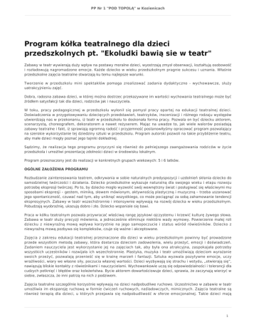 PP Nr 1 "POD TOPOLĄ" w Kozienicach Program kółka teatralnego dla dzieci przedszkolnych pt. "Ekoludki bawią sie w teatr" Zabawy w teatr wywierają duży wpływ na postawy moralne dzieci, wyostrzają zmysł obserwacji, kształtują osobowość i rozładowują nagromadzone emocje. Każde dziecko w wieku przedszkolnym pragnie sukcesu i uznania. Właśnie przedszkolne zajęcia teatralne stwarzają ku temu najlepsze warunki. Tworzenie w przedszkolu mini spektaklów pomaga zrealizować zadania dydaktyczno - wychowawcze, służy uatrakcyjnieniu zajęć. Dobra, radosna zabawa dzieci, w której można dostrzec przekazywane im wartości wychowania teatralnego może być źródłem satysfakcji tak dla dzieci, rodziców jak i nauczyciela. W toku, pracy pedagogicznej w przedszkolu wyłonił się pomysł pracy opartej na edukacji teatralnej dzieci. Doświadczenia w przygotowywaniu dziecięcych przedstawień, teatrzyków, inscenizacji i różnego rodzaju występów utwierdzają nas w przekonaniu, iż teatr w przedszkolu to doskonała forma pracy. Pozwala on być dziecku aktorem, scenarzystą, choreografem, dekoratorem a nawet reżyserem. Mając na uwadze to, jak wiele walorów posiadają zabawy teatralne i fakt, iż sprawiają ogromną radość i przyjemność postanowiłyśmy opracować program pozwalający na szerokie wykorzystanie tej dziedziny sztuki w przedszkolu. Program autorski pozwoli na takie przybliżenie teatru, aby małe dzieci mogły poznać jego tajniki dokładniej. Sądzimy, że realizacja tego programu przyczyni się również do pełniejszego zaangażowania rodziców w życie przedszkola i umożliwi prezentację zdolności dzieci w środowisku lokalnym. Program przeznaczony jest do realizacji w konkretnych grupach wiekowych: 5 i 6 latków. OGÓLNE ZAŁOŻENIA PROGRAMU Rozbudzanie zainteresowania teatrem, odkrywania w sobie naturalnych predyspozycji i uzdolnień skłania dziecko do samodzielnej twórczości i działania. Dziecko przedszkolne wykazuje naturalną dla swojego wieku i etapu rozwoju potrzebę ekspresji twórczej. Po to, by dziecko mogło wyzwolić swój wewnętrzny świat i posługiwać się właściwymi mu sposobami ekspresji – gestem, mimiką, słowem mówionym, aktywnością plastyczną i muzyczną – trzeba uszanować jego spontaniczność, czuwać nad tym, aby uniknąć wszystkiego, co może pociągnąć za sobą zahamowanie tendencji ekspresyjnych. Zabawy w teatr wszechstronnie i intensywnie wpływają na rozwój dziecka w wieku przedszkolnym. Pobudzają wyobraźnię, ukazują dobro i zło. Dziecko wspaniale się bawi. Praca w kółku teatralnym pozwala przywracać właściwą rangę językowi ojczystemu i krzewić kulturę żywego słowa. Zabawa w teatr służy precyzji mówienia, a jednocześnie eliminuje niektóre wady wymowy. Powierzenie małej roli dziecku z niewyraźną mową wpływa korzystnie na jego samopoczucie i status wśród rówieśników. Dziecko z niewyraźną mową pozbywa się kompleksów, czuje się ważne i akceptowane. Zajęcia z zakresu edukacji teatralnej przeznaczone dla dzieci w wieku przedszkolnym powinny być prowadzone przede wszystkim metodą zabawy, która dostarcza dzieciom zadowolenia, wielu przeżyć, emocji i doświadczeń. Zadaniem nauczyciela jest wykorzystanie jej na zajęciach tak, aby była ona atrakcyjna, zaspokajała potrzeby wszystkich uczestników i rozwijała ich wszechstronnie. Plastyka, muzyka i teatr umożliwiają dzieciom wyrażanie swoich przeżyć, pozwalają przenieść się w krainę marzeń i fantazji. Sztuka wyzwala pozytywne emocje, uczy wrażliwości, wiary we własne siły, poczucia własnej wartości. Dzieci wyzbywają się strachu i wstydu, „otwierają się”, nawiązują bliskie kontakty z rówieśnikami i nauczycielami. Wychowankowie uczą się odpowiedzialności i tolerancji dla cudzych potknięć i błędów oraz koleżeństwa. Bycie aktorem dowartościowuje dzieci, sprawia, że zaczynają wierzyć w siebie, zwłaszcza, że inni patrzą na nich z podziwem. Zajęcia teatralne szczególnie korzystnie wpływają na dzieci nadpobudliwe ruchowo. Uczestnictwo w zabawie w teatr umożliwia im ekspansję ruchową w formie ćwiczeń ruchowych, naśladowczych, mimicznych. Zajęcia teatralne są również terapią dla dzieci, u których przejawia się nadpobudliwość w sferze emocjonalnej. Takie dzieci mają 1 PP Nr 1 "POD TOPOLĄ" w Kozienicach możliwość pozbywania się negatywnych emocji (gniew, złość, agresja, płacz, kłótliwość, skarżenie). Zabawy teatralne sprzyjają rozwojowi ruchowemu dzieci mniej ruchliwych i nieśmiałych. Program kółka teatralnego przeznaczony jest do realizacji na zajęciach z dziećmi w wieku przedszkolnym. Program kładzie nacisk na aktywizowanie dzieci, inspirowanie do działań twórczych oraz wyzwalanie dziecięcej wyobraźni. PROGRAM KÓŁKA TEATRALNEGO PUBLICZNEGO PRZEDSZKOLA NR 1 pt. "EKOLUDKI BAWIĄ SIĘ W TEATR" Pełen program do pobrania pod poniższym linkiem ( kliknij na link poniżej). 2