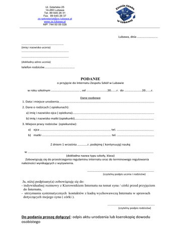 Ul. Gdańska 25 14-260 Lubawa Tel. 89 645 26 31 Fax. 89 645 26 37 [email protected] www.zs.lubawa.pl NIP: 744 00 05 028 Lubawa, dnia ……………………… .................................................. (imię i nazwisko ucznia) ........................................................ ........................................................ (dokładny adres ucznia) telefon rodziców.................................... PODANIE o przyjęcie do Internatu Zespołu Szkół w Lubawie w roku szkolnym .................................. , od .........................20…....r. do .....................20…....r. Dane osobowe 1. Data i miejsce urodzenia................................................................................................................. 2. Dane o rodzicach ( opiekunach): a) imię i nazwisko ojca ( opiekuna)................................................................................................. b) imię i nazwisko matki (opiekunki).............................................................................................. 3. Miejsce pracy rodziców (opiekunów): a) ojca .................................................................................... tel. ............................................ b) matki .................................................................................. tel. ............................................ Z dniem 1 września ............r. podejmę ( kontynuuję) naukę w ..................................................................................................................................................... (dokładna nazwa typu szkoły, klasa) Zobowiązuję się do przestrzegania regulaminu internatu oraz do terminowego regulowania należności wynikających z wyżywienia. ............................................................................... (czytelny podpis ucznia i rodziców) Ja, niżej podpisany(a) zobowiązuję się do: - indywidualnej rozmowy z Kierownikiem Internatu na temat syna / córki przed przyjęciem do Internatu, - utrzymania systematycznych kontaktów z kadrą wychowawczą Internatu w sprawach dotyczących mojego syna ( córki ). ........................................................ (czytelny podpis rodziców) Do podania proszę dołączyć: odpis aktu urodzenia lub kserokopię dowodu osobistego