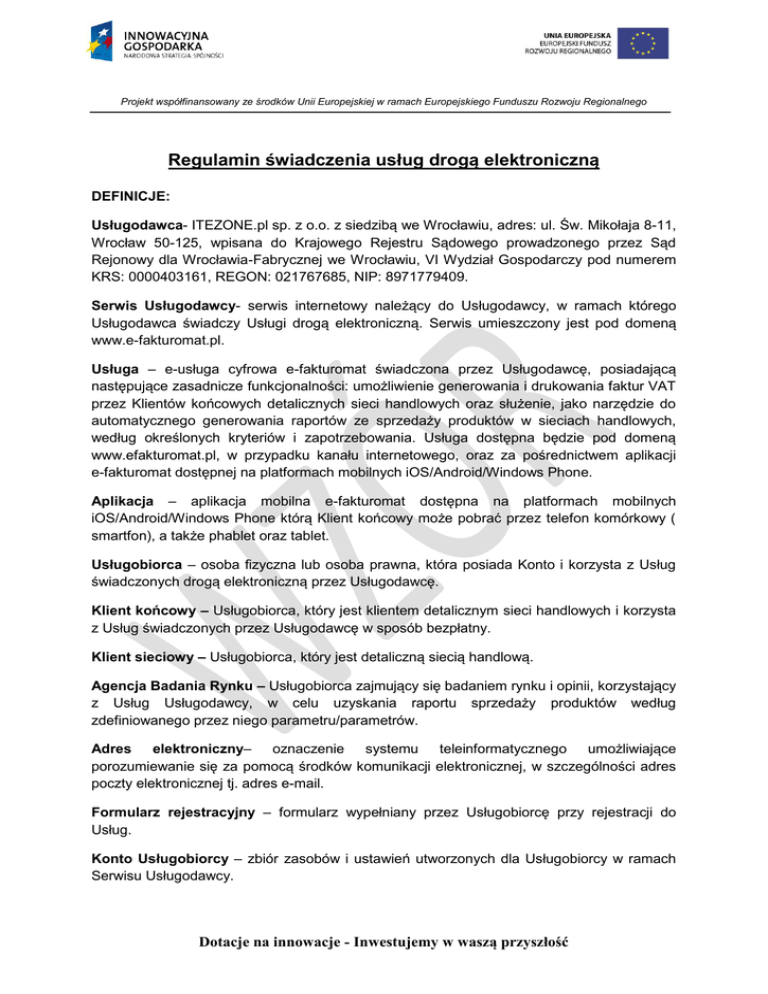 Projekt współfinansowany ze środków Unii Europejskiej w ramach Europejskiego Funduszu Rozwoju Regionalnego Regulamin świadczenia usług drogą elektroniczną DEFINICJE: Usługodawca- ITEZONE.pl sp. z o.o. z siedzibą we Wrocławiu, adres: ul. Św. Mikołaja 8-11, Wrocław 50-125, wpisana do Krajowego Rejestru Sądowego prowadzonego przez Sąd Rejonowy dla Wrocławia-Fabrycznej we Wrocławiu, VI Wydział Gospodarczy pod numerem KRS: 0000403161, REGON: 021767685, NIP: 8971779409. Serwis Usługodawcy- serwis internetowy należący do Usługodawcy, w ramach którego Usługodawca świadczy Usługi drogą elektroniczną. Serwis umieszczony jest pod domeną www.e-fakturomat.pl. Usługa – e-usługa cyfrowa e-fakturomat świadczona przez Usługodawcę, posiadającą następujące zasadnicze funkcjonalności: umożliwienie generowania i drukowania faktur VAT przez Klientów końcowych detalicznych sieci handlowych oraz służenie, jako narzędzie do automatycznego generowania raportów ze sprzedaży produktów w sieciach handlowych, według określonych kryteriów i zapotrzebowania. Usługa dostępna będzie pod domeną www.efakturomat.pl, w przypadku kanału internetowego, oraz za pośrednictwem aplikacji e-fakturomat dostępnej na platformach mobilnych iOS/Android/Windows Phone. Aplikacja – aplikacja mobilna e-fakturomat dostępna na platformach mobilnych iOS/Android/Windows Phone którą Klient końcowy może pobrać przez telefon komórkowy ( smartfon), a także phablet oraz tablet. Usługobiorca – osoba fizyczna lub osoba prawna, która posiada Konto i korzysta z Usług świadczonych drogą elektroniczną przez Usługodawcę. Klient końcowy – Usługobiorca, który jest klientem detalicznym sieci handlowych i korzysta z Usług świadczonych przez Usługodawcę w sposób bezpłatny. Klient sieciowy – Usługobiorca, który jest detaliczną siecią handlową. Agencja Badania Rynku – Usługobiorca zajmujący się badaniem rynku i opinii, korzystający z Usług Usługodawcy, w celu uzyskania raportu sprzedaży produktów według zdefiniowanego przez niego parametru/parametrów. Adres elektroniczny– oznaczenie systemu teleinformatycznego umożliwiające porozumiewanie się za pomocą środków komunikacji elektronicznej, w szczególności adres poczty elektronicznej tj. adres e-mail. Formularz rejestracyjny – formularz wypełniany przez Usługobiorcę przy rejestracji do Usług. Konto Usługobiorcy – zbiór zasobów i ustawień utworzonych dla Usługobiorcy w ramach Serwisu Usługodawcy. Dotacje na innowacje - Inwestujemy w waszą przyszłość Projekt współfinansowany ze środków Unii Europejskiej w ramach Europejskiego Funduszu Rozwoju Regionalnego Ustawienia Prywatności – funkcjonalność w Koncie Usługobiorcy, pozwalająca Usługobiorcom korzystającym z wybranych Usług na odpowiednie zarządzanie tymi Usługami, w tym samodzielne modyfikowanie ich zakresu. Informacja handlowa – każda informacja przeznaczona bezpośrednio lub pośrednio do promowania towarów, usług lub wizerunku przedsiębiorcy, z wyłączeniem informacji umożliwiającej porozumiewanie się za pomocą środków komunikacji elektronicznej z określoną osobą oraz informacji o towarach i usługach niesłużącej osiągnięciu efektu handlowego pożądanego przez danego przedsiębiorcę. System teleinformatyczny – zespół współpracujących ze sobą urządzeń informatycznych i oprogramowania, zapewniający przetwarzanie i przechowywanie, a także wysyłanie i odbieranie danych poprzez sieci telekomunikacyjne za pomocą właściwego dla danego rodzaju sieci urządzenia końcowego w rozumieniu ustawy Prawo telekomunikacyjne. Świadczenie usługi drogą elektroniczną – wykonanie usługi, które następuje przez wysyłanie i odbieranie danych za pomocą systemów teleinformatycznych, na indywidualne żądanie usługobiorcy, bez jednoczesnej obecności stron, przy czym dane te są transmitowane za pośrednictwem sieci publicznych w rozumieniu ustawy Prawo telekomunikacyjne. Środki komunikacji elektronicznej – rozwiązania techniczne, w tym urządzenia teleinformatyczne i współpracujące z nimi narzędzia programowe, umożliwiające indywidualne porozumiewanie się na odległość przy wykorzystaniu transmisji danych między systemami teleinformatycznymi, a w szczególności poczta elektroniczna. Cookies – krótkie pliki tekstowe zapisywane w systemie Usługobiorcy przez system Usługodawcy, które mogą być odczytane wyłącznie przez system, który je zapisał. Raport - generowane w systemie, na zlecenie Agencji Badania Rynku, zestawienie sprzedaży produktów w sklepach detalicznych sieci handlowych, usystematyzowane według zdefiniowanych przez Agencję Badania Rynku parametrów. Adres IP – indywidualny numer, który z reguły posiada każdy komputer podłączony do sieci publicznej, bądź grupa komputerów znajdująca się w obrębie jednej sieci lokalnej. Strony - Usługodawca i Usługobiorca. Osoby trzecie- osoby inne niż Usługodawca i Usługobiorca. I. POSTANOWIENIA OGÓLNE 1. Niniejszy Regulamin określa: rodzaje i zakres Usług świadczonych drogą elektroniczną; warunki świadczenia Usług drogą elektroniczną, w tym: Dotacje na innowacje - Inwestujemy w waszą przyszłość Projekt współfinansowany ze środków Unii Europejskiej w ramach Europejskiego Funduszu Rozwoju Regionalnego - wymagania techniczne niezbędne do współpracy z systemem teleinformatycznym, którym posługuje się Usługodawca, - zakaz dostarczania przez Usługobiorcę treści o charakterze bezprawnym, warunki zawierania i rozwiązywania umów o świadczenie usług drogą elektroniczną; tryb postępowania reklamacyjnego, prawa i obowiązki Usługodawcy oraz Usługobiorców, zasady ochrony danych osobowych osób korzystających z Usług świadczonych drogą elektroniczną. 2. Usługodawca, w Serwisie, nieodpłatnie udostępnia Usługobiorcom Regulamin przed zawarciem umowy o świadczenie Usłu